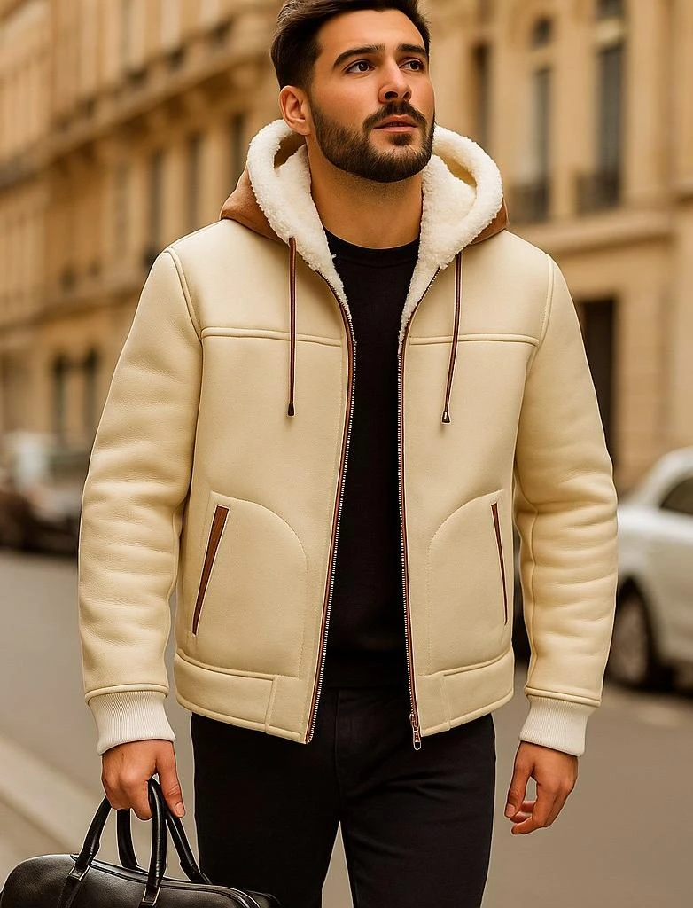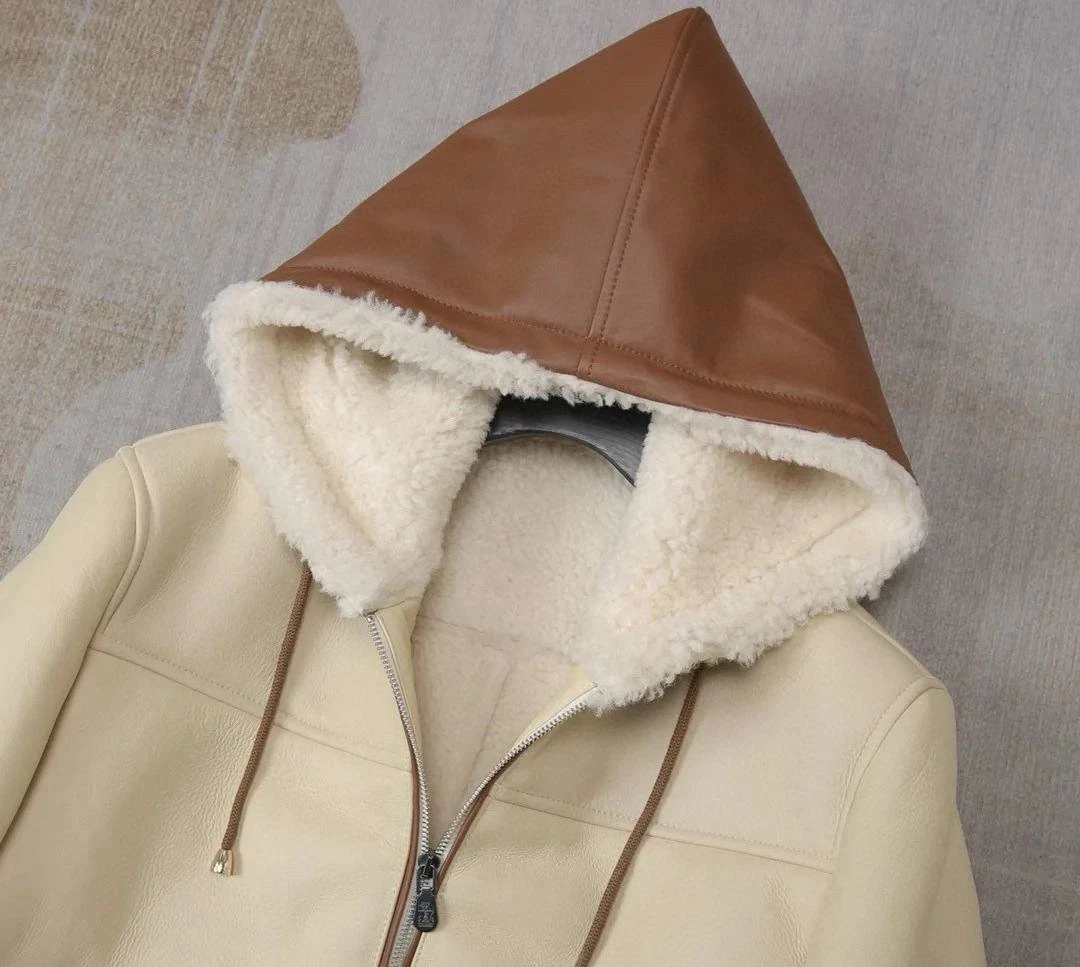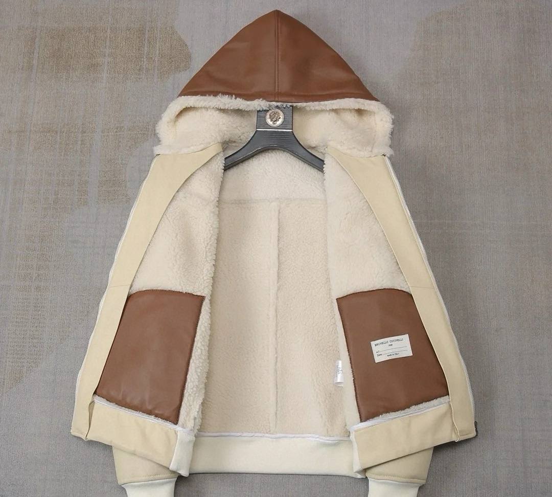 • Капюшон: уютный объёмный капюшон, полностью отделан внутри густым shearling; шнурки с металлическими наконечниками для регулировки посадки.