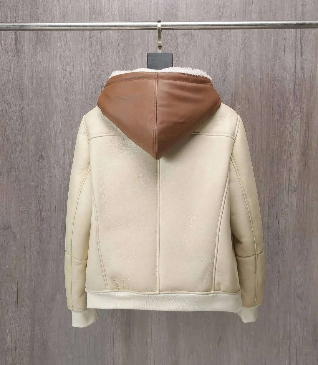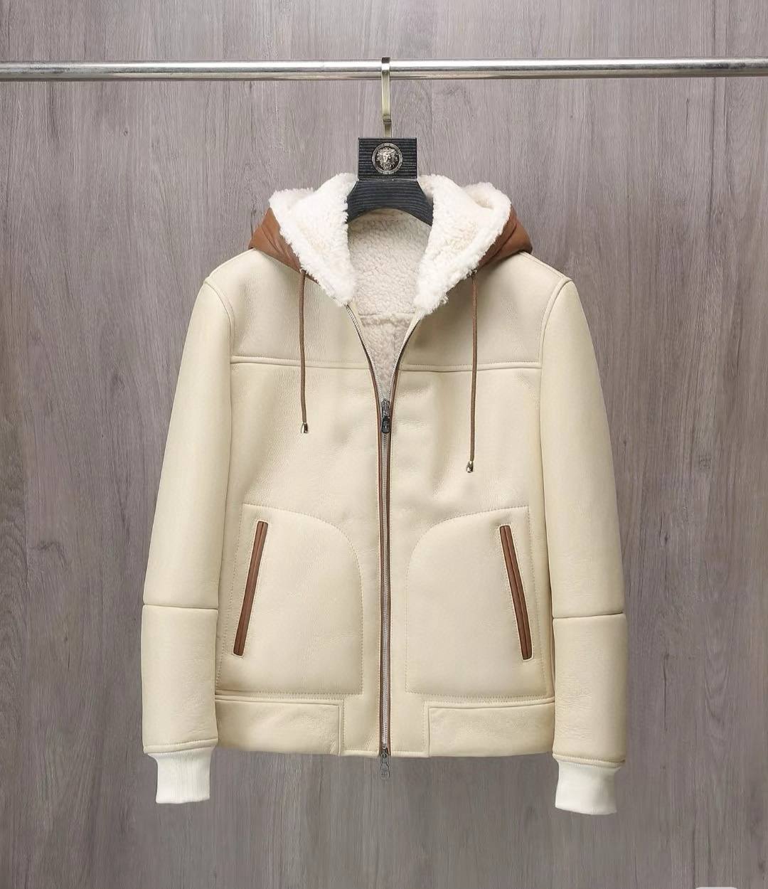 Элегантная утеплённая дублёнка из мягкой кожи ягнёнка — сочетание сдержанной лаконичности и продуманной функциональности. Нежный кремовый оттенок корпуса контрастирует с тёплыми коричневыми акцентами, создавая универсальную вещь для холодного сезона.