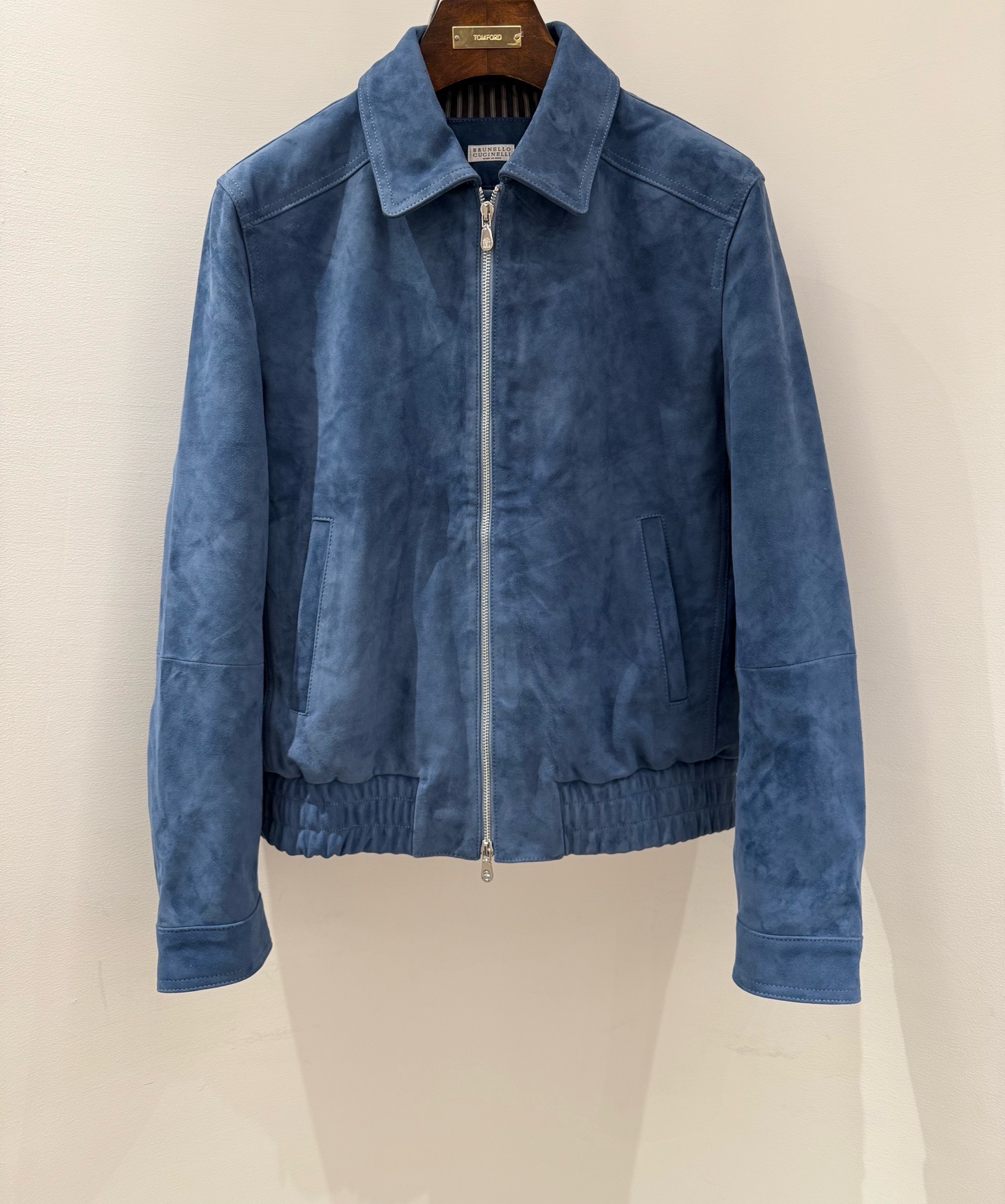 Элегантная мужская кожаная куртка BRUNELLO CUCINELLI — образец утончённого итальянского мастерства и сдержанной роскоши. Выполнена из мягкой бархатистой замши нежного джинсово‑голубого оттенка, она сочетает в себе комфорт классического бомбера и изящную сдержанность повседневного жакета.
