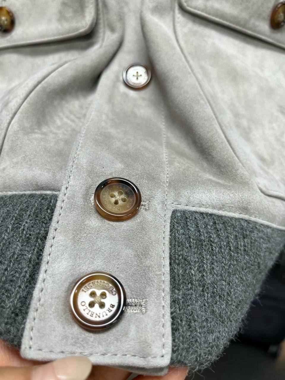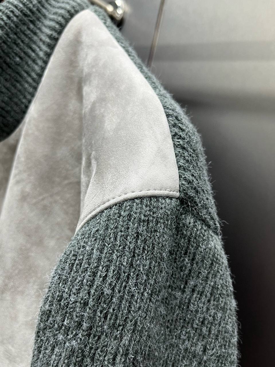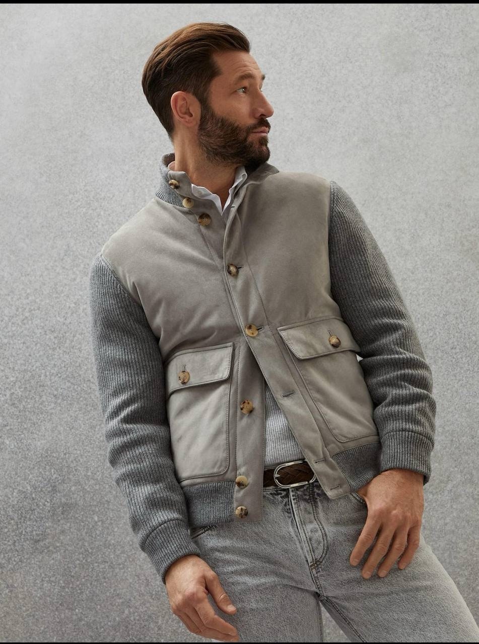 Мужская кожаная куртка BRUNELLO CUCINELLI выполнена в стильном светло-сером оттенке. Классический крой сочетает гладкую кожаную переднюю часть с вязанными рукавами и боковыми вставками, что придает модели особый шарм и современный вид. Куртка застегивается на крупные фирменные пуговицы, имеет отложной воротник-стойку и два объемных накладных кармана с клапанами на груди. Универсальный дизайн и премиальные материалы делают эту куртку идеальным выбором для стильных и ценящих комфорт мужчин.