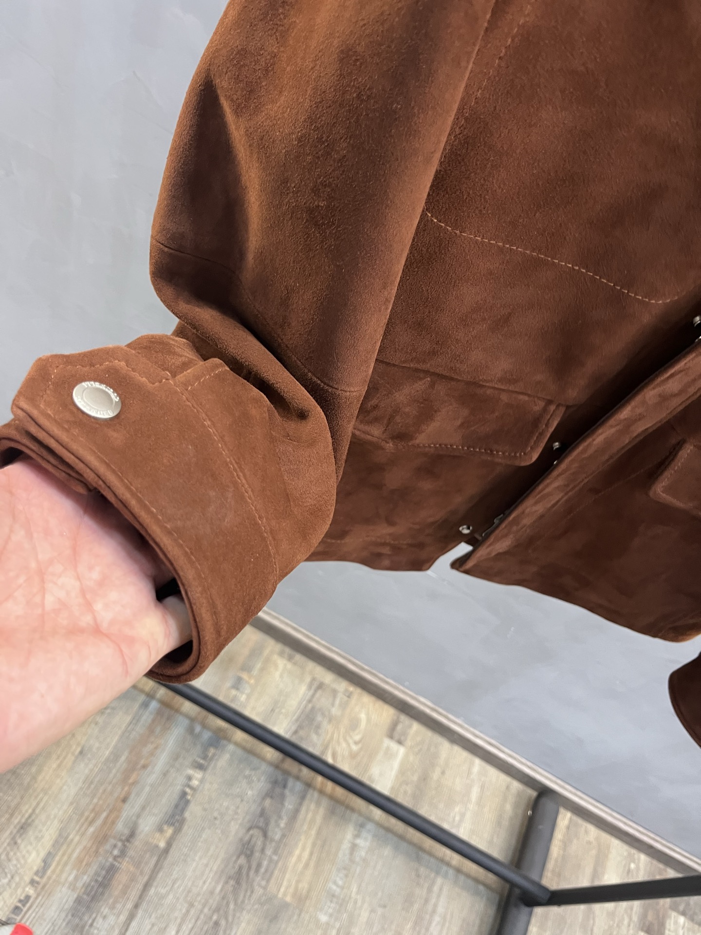 Мужская куртка из замши от Brunello Cucinelli — воплощение утончённого итальянского стиля и высокого качества. Модель выполнена из мягкой и бархатистой натуральной замши тёплого коричневого оттенка. Контрастный воротник и застёжка придают изделию современный вид, а продуманный крой обеспечивает идеальную посадку.