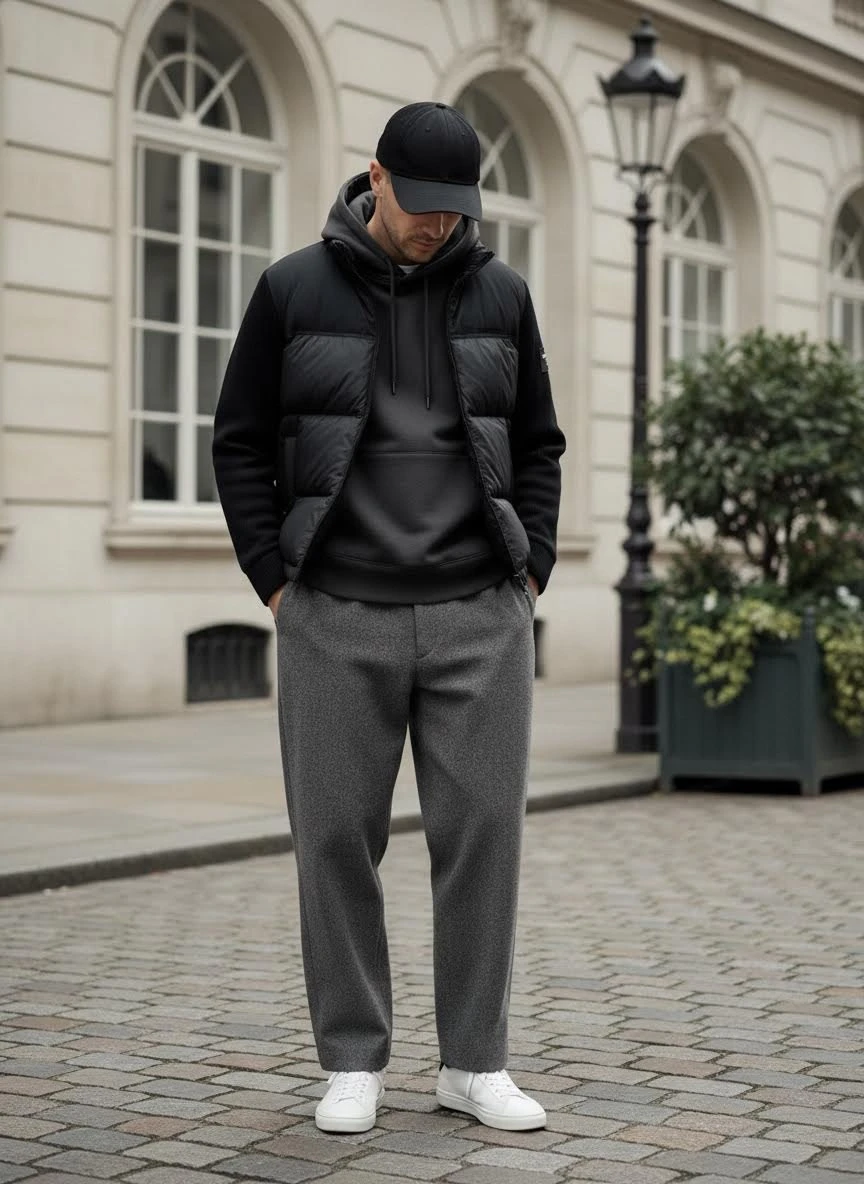 • Манжеты и низ: широкий ребристый трикотаж на манжетах и внизу для плотной посадки и защиты от продувания.
