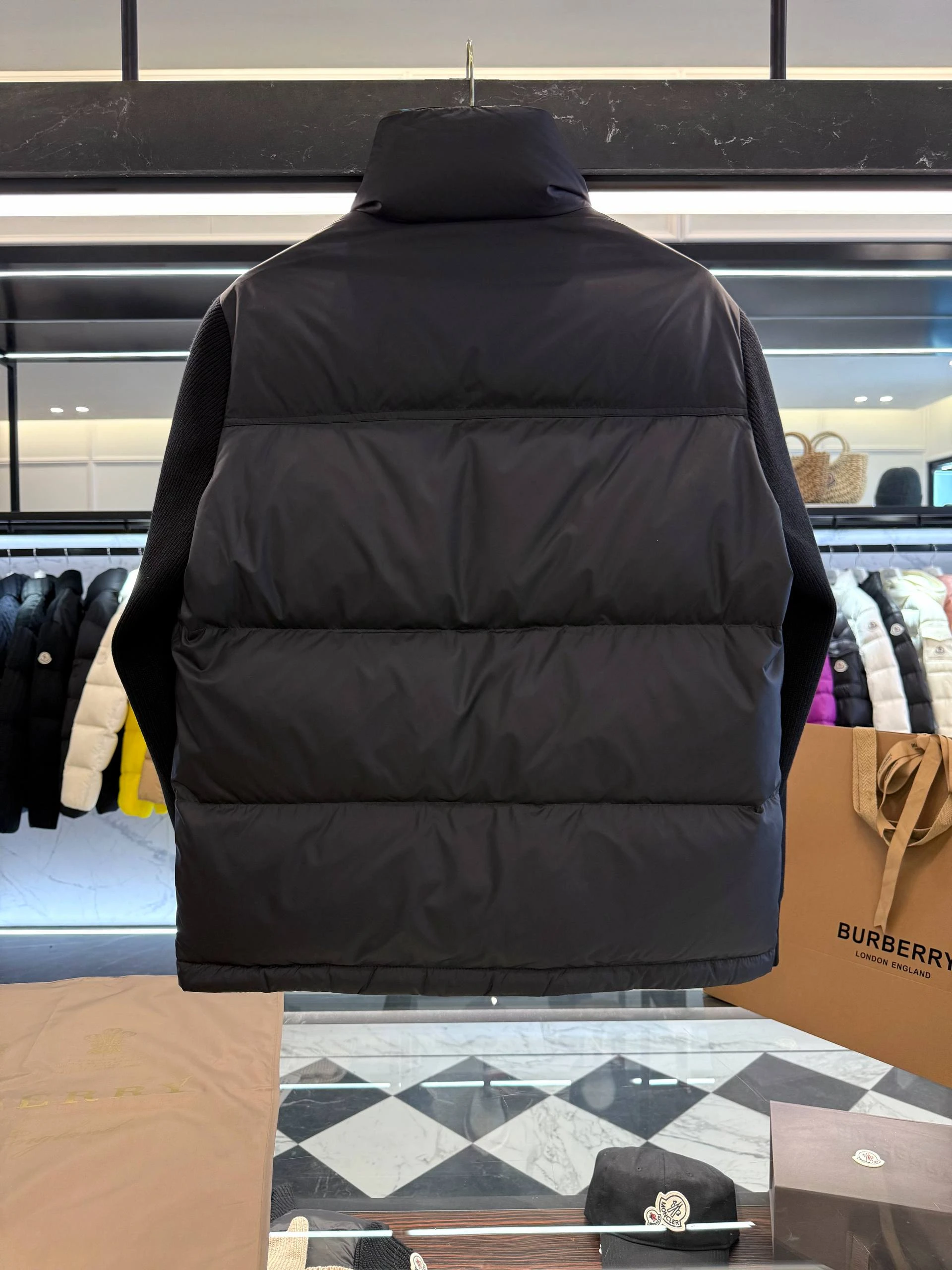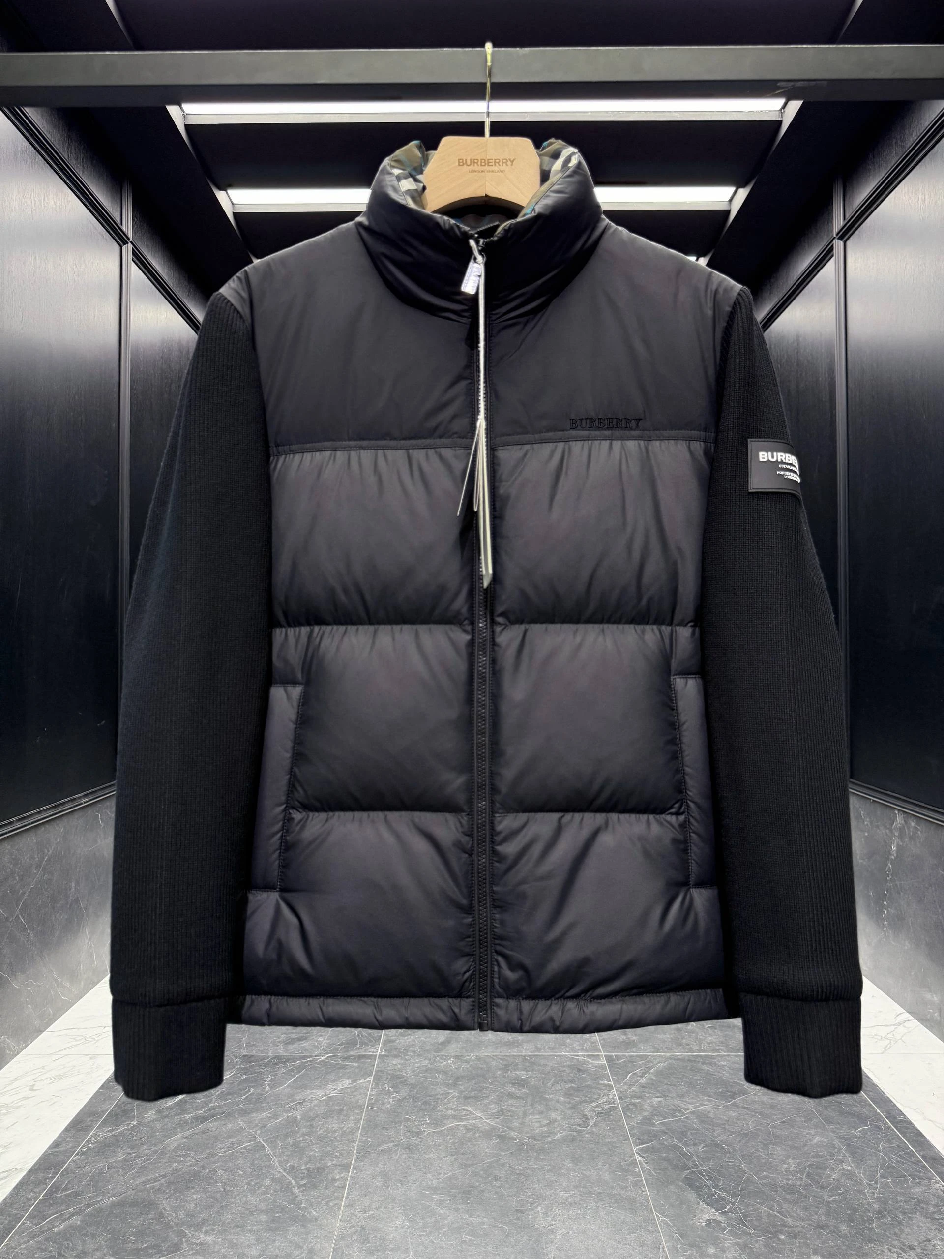 • Логотипы: лаконичная эмбоссированная или вышитая надпись BURBERRY на груди и фирменный шеврон/лампа на рукаве — сдержанная брендинговая деталь.