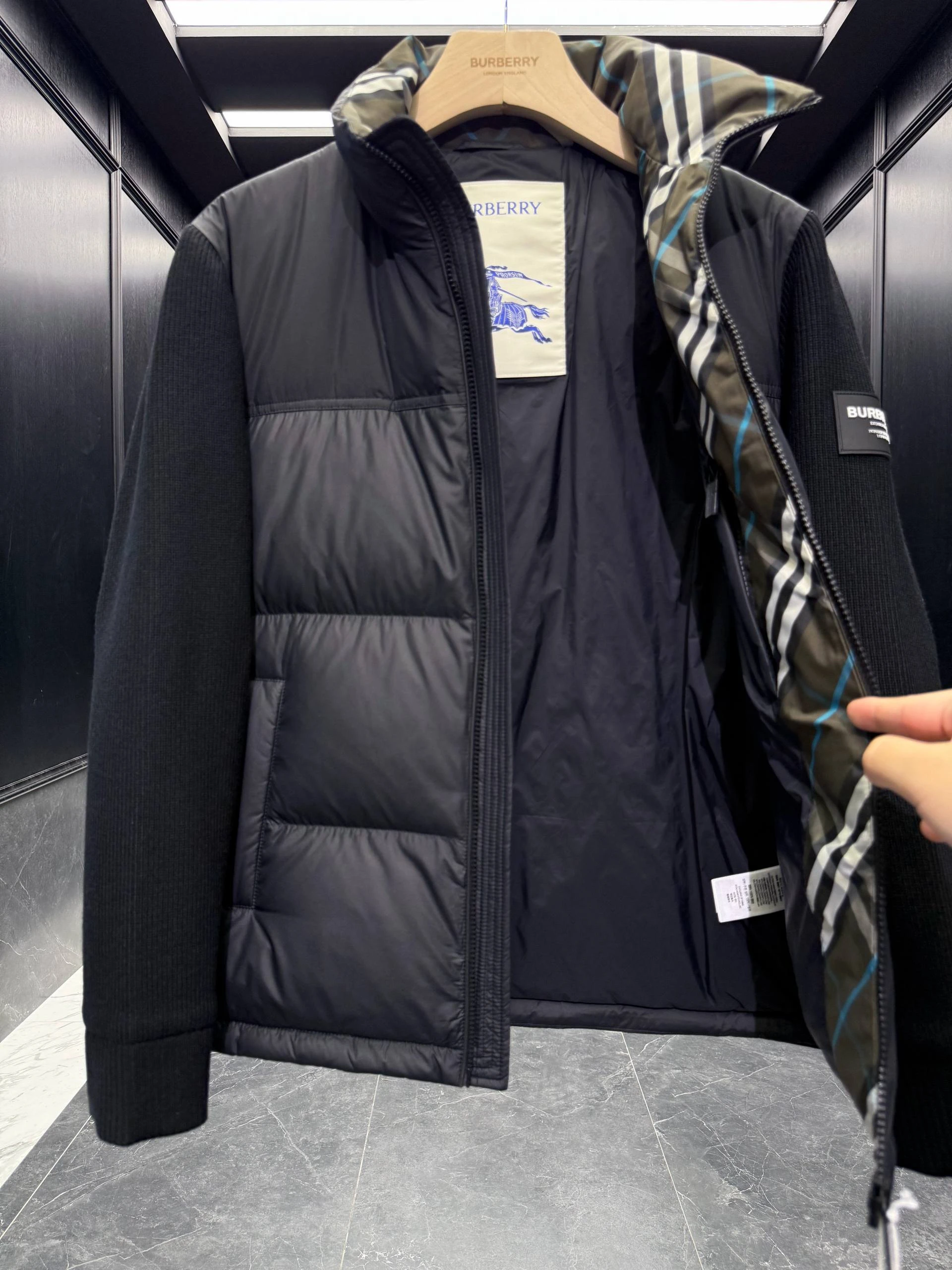 • Воротник: высокий стойка-воротник для защиты от ветра; внутренняя отделка воротника — фирменная клетка BURBERRY (видна при распахнутом воротнике).