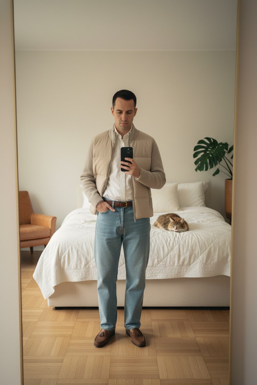 • Для спокойного повседневного лука — тёмные джинсы или шерстяные брюки и кожаные кеды/дезерты.