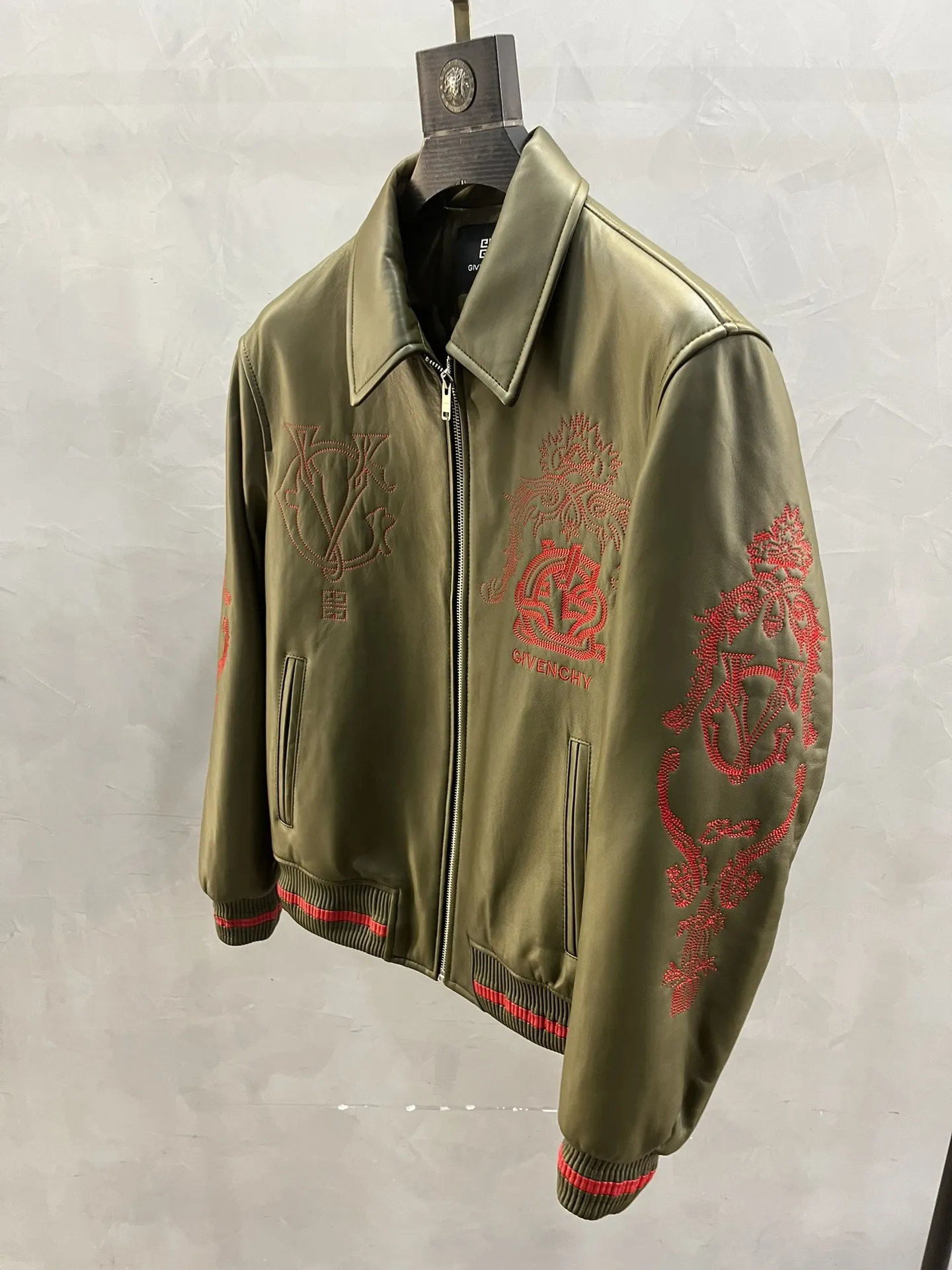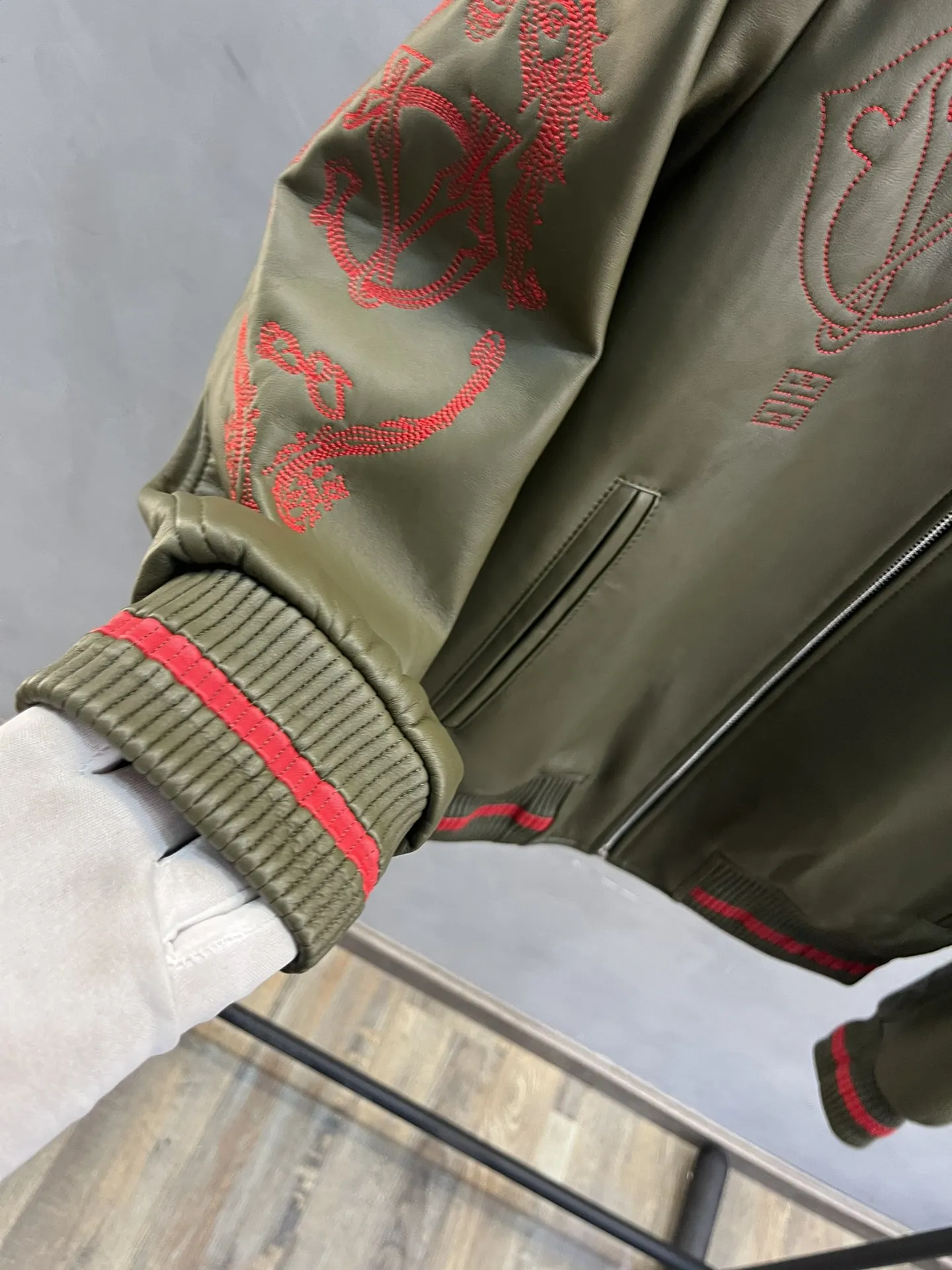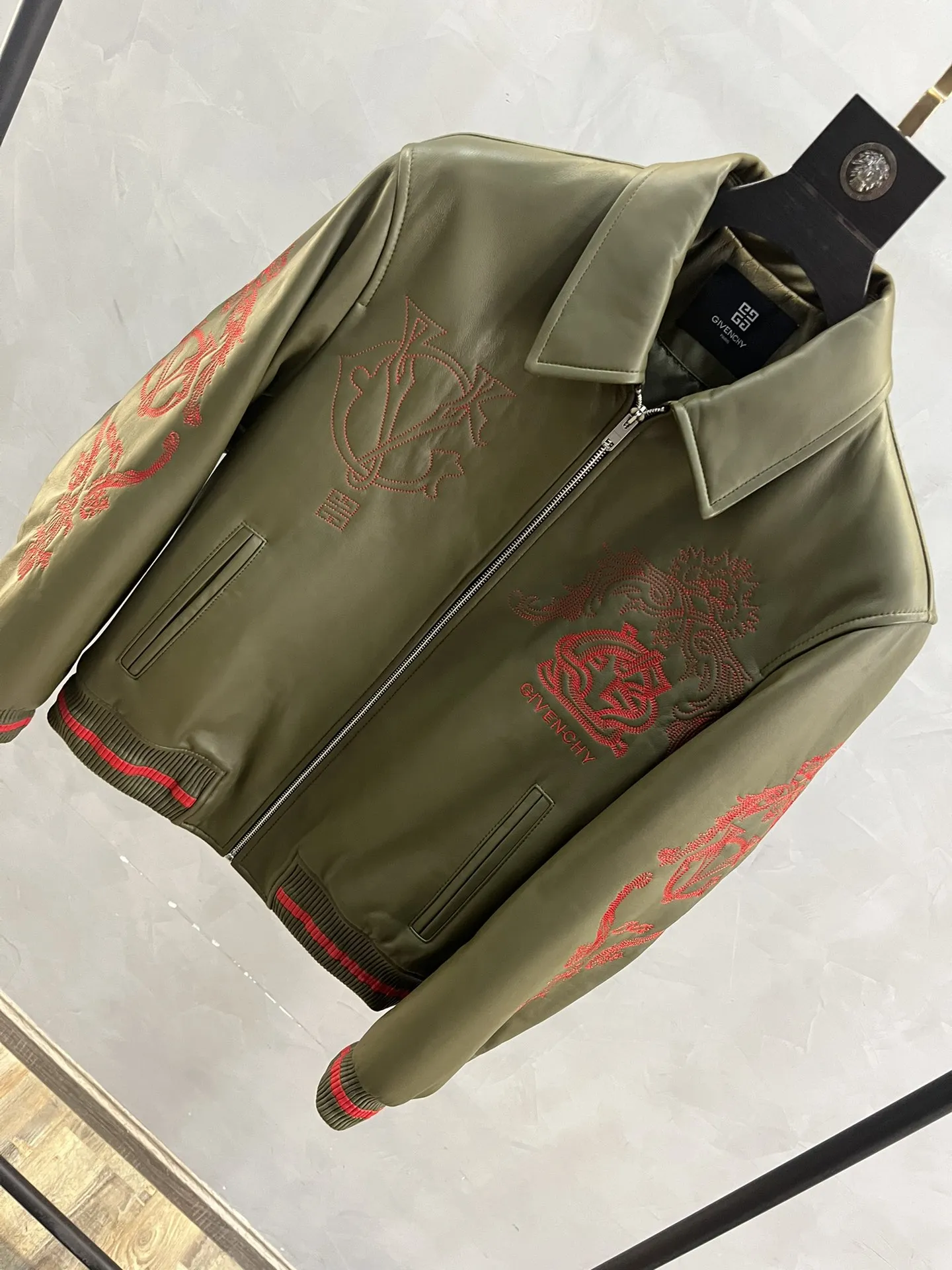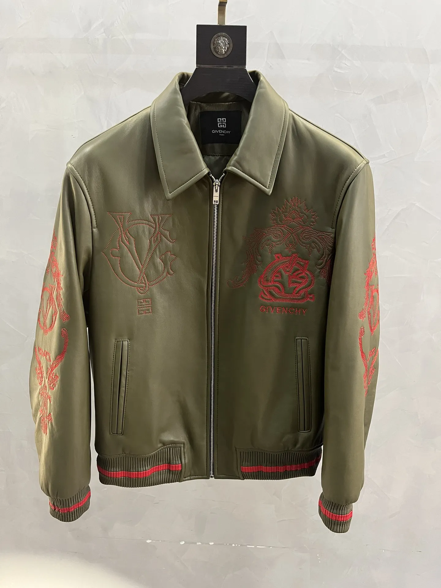 Куртка выполнена в изысканном оливковом цвете, который гармонично сочетается с яркими красными вышивками, добавляющими уникальности и выразительности. Вышитые элементы включают фирменные символы и логотип, подчеркивающие престиж бренда.