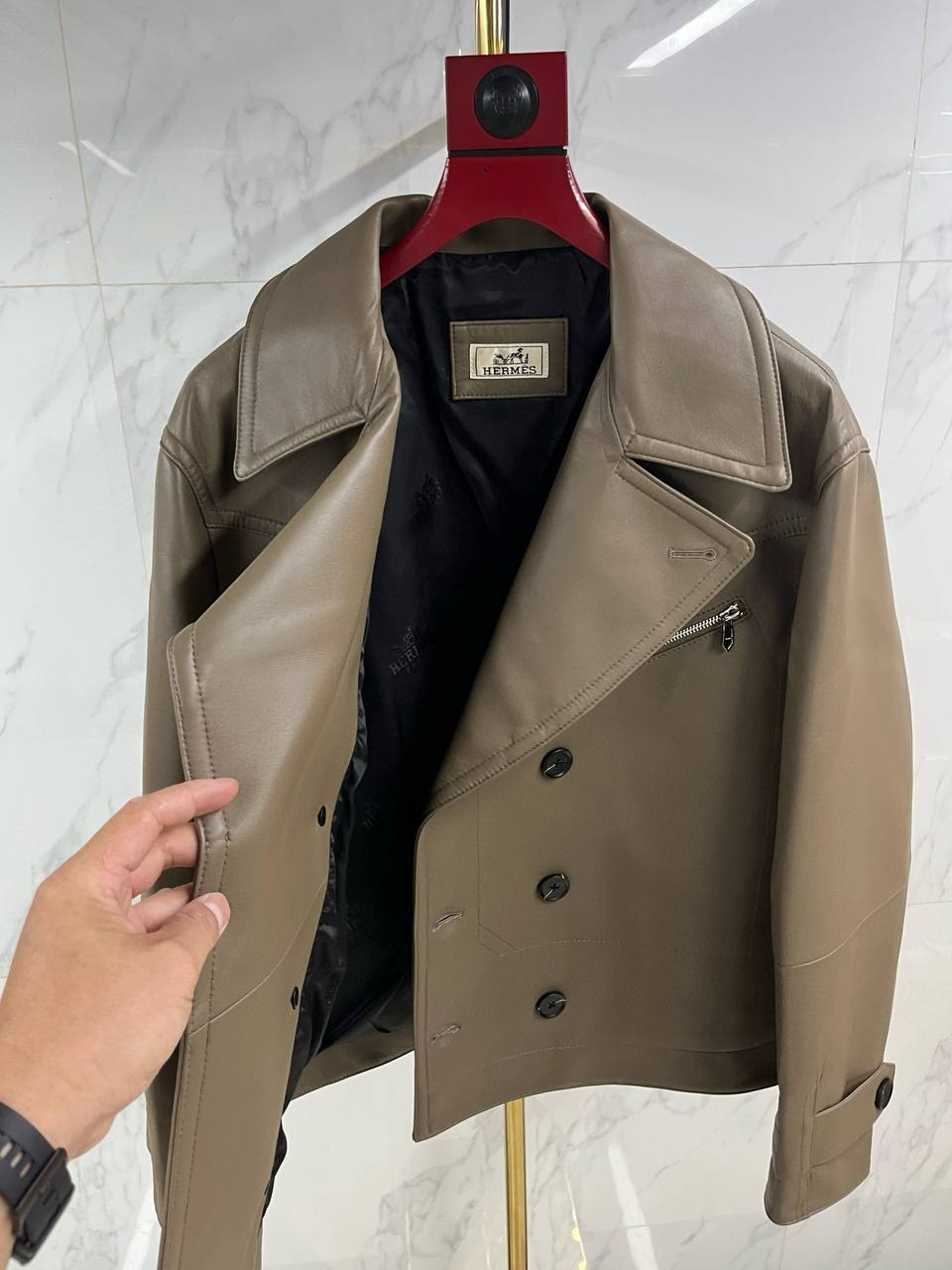 Представляем вашему вниманию стильную мужскую кожаную куртку от легендарного французского дома HERMES. Эта модель выполнена из высококачественной натуральной кожи в универсальном бежево-какао оттенке. Классический двубортный крой подчеркивает утонченность и современную эстетику бренда.
