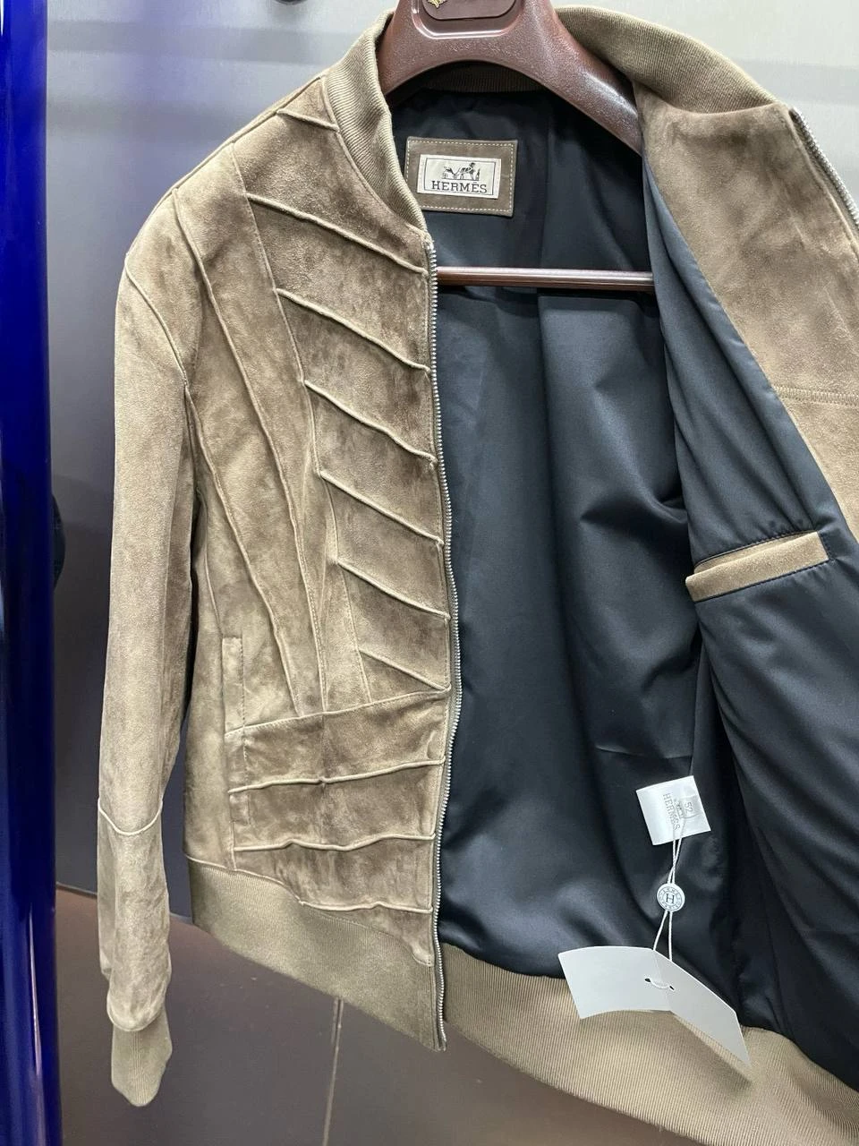 Крой продуман для идеальной посадки: приталенный торс с длиной до бедра, удлиненные рукава с манжетами на кнопках для регулировки, и асимметричный подол, который предотвращает поддувание ветра. Центральная молния — скрытая, из прочной латуни с гравировкой "HERMÈS PARIS", обеспечивает легкое надевание и минималистичный вид. Внутренняя подкладка из шелка или хлопка с сетчатой вентиляцией, плюс карман на молнии для мелочей. Швы усилены двойной строчкой, а края обработаны лазером для предотвращения растрескивания.