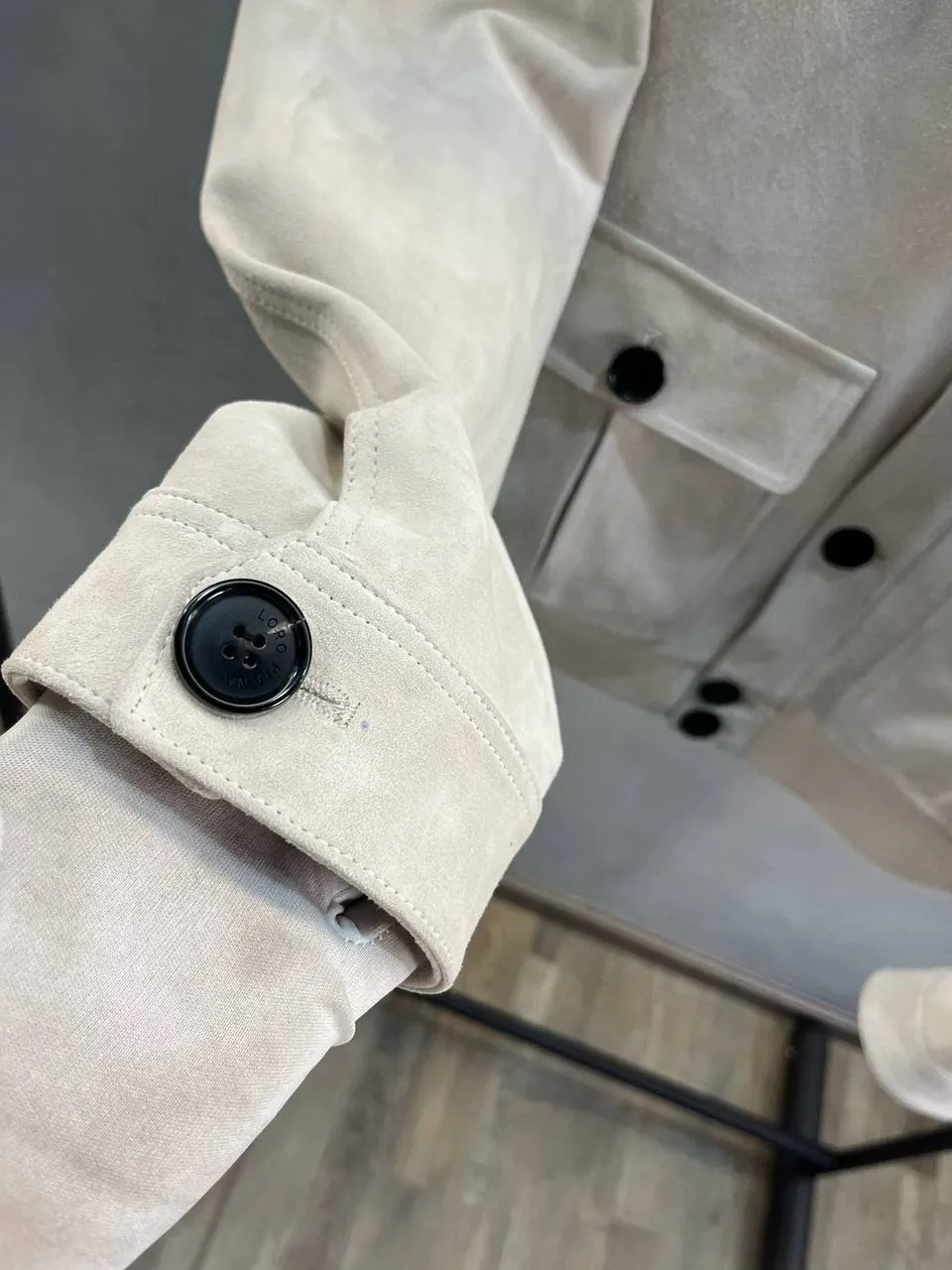 Прямой крой, аккуратный воротник-стойка и крупные накладные карманы с клапанами придают модели современный и практичный вид. Контрастные пуговицы добавляют выразительный акцент. Такая куртка идеально дополнит как повседневный, так и более элегантный образ, подчеркнув отменный вкус и статус владельца.