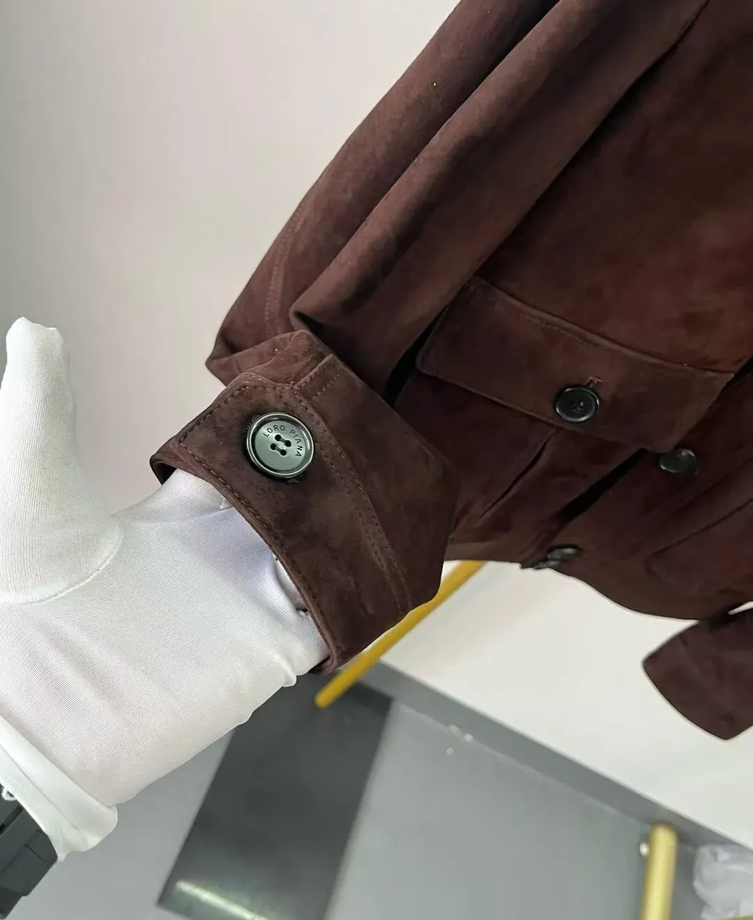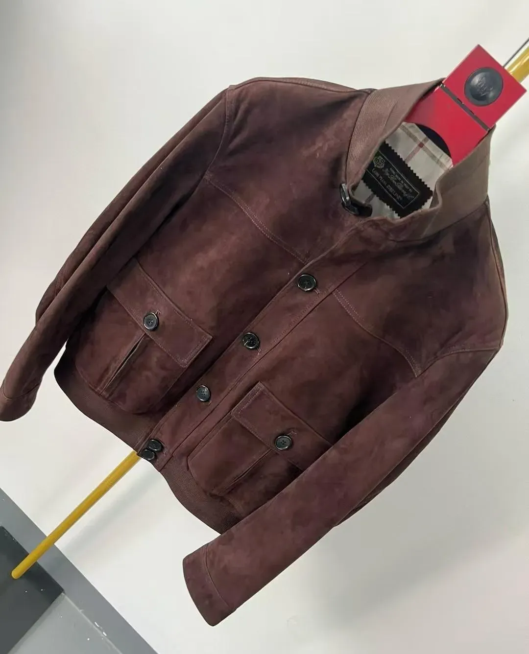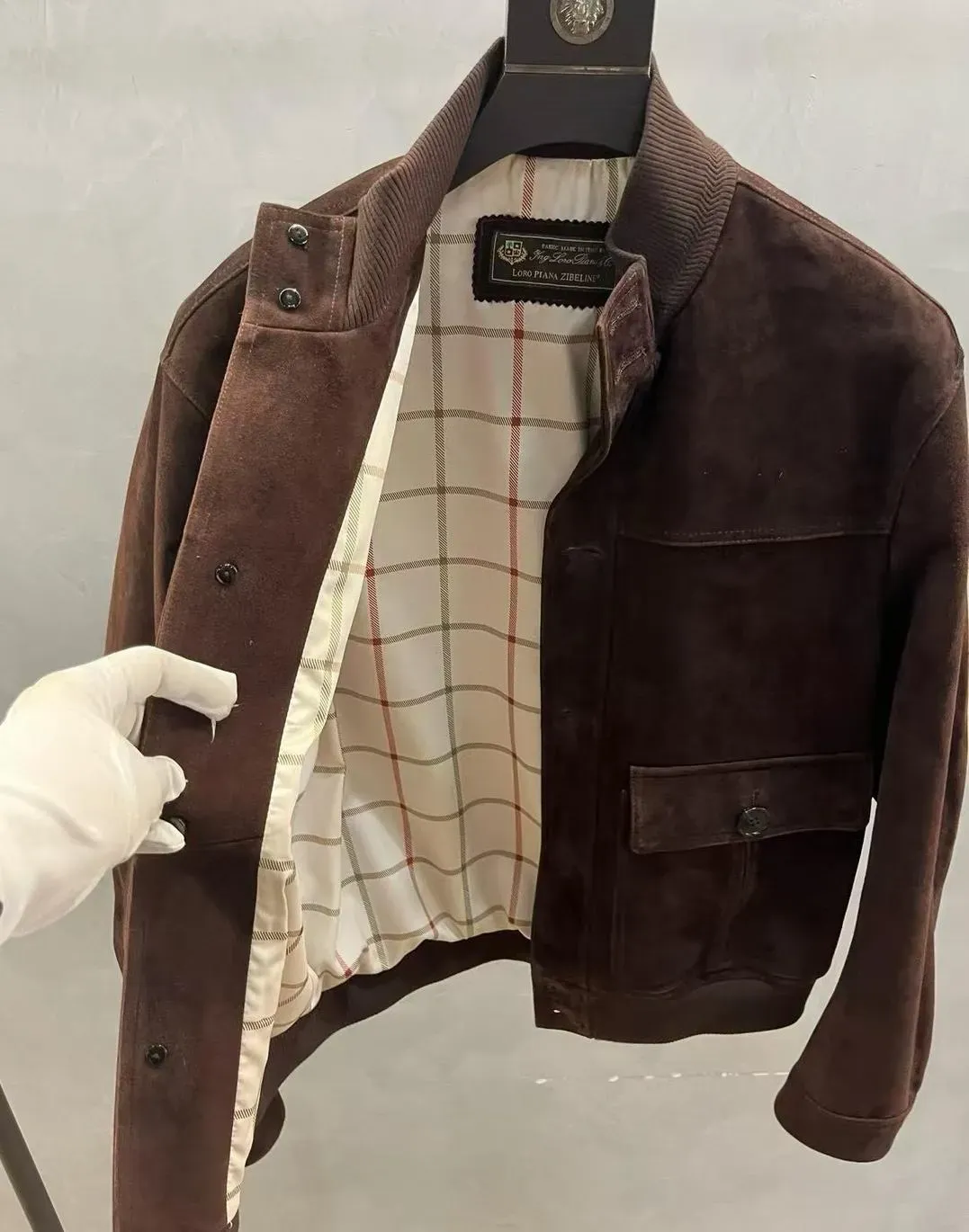 Мужская куртка от Loro Piana выполнена из высококачественной замши, что придаёт ей элегантный и утончённый вид.