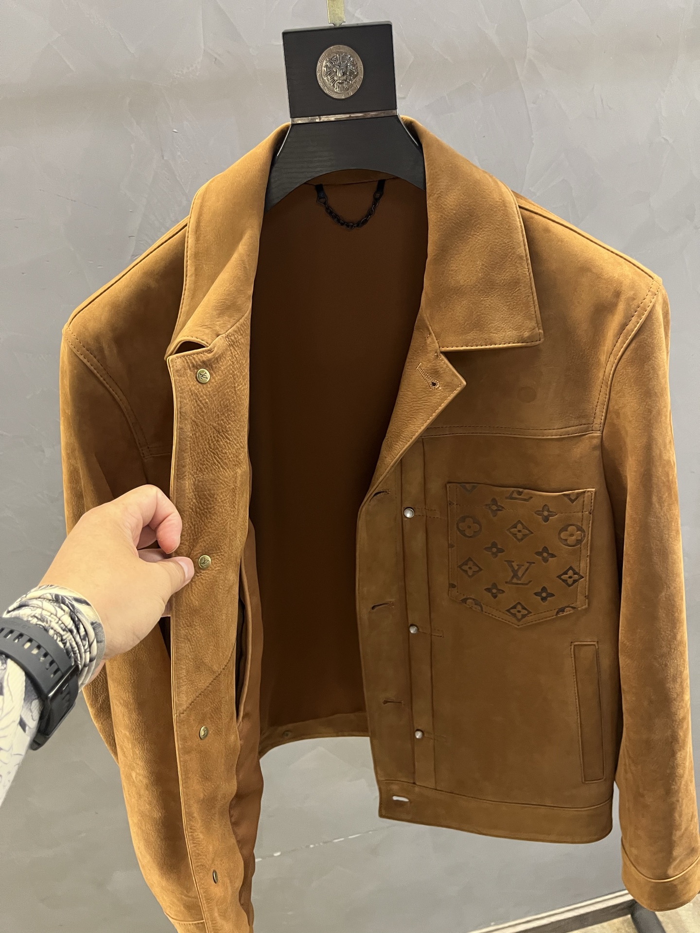 Мужская куртка от Louis Vuitton выполнена из высококачественной овечьей замши, что придаёт ей роскошный и элегантный вид. Мягкая текстура материала обеспечивает комфорт и тепло, делая её идеальным выбором для прохладной погоды.