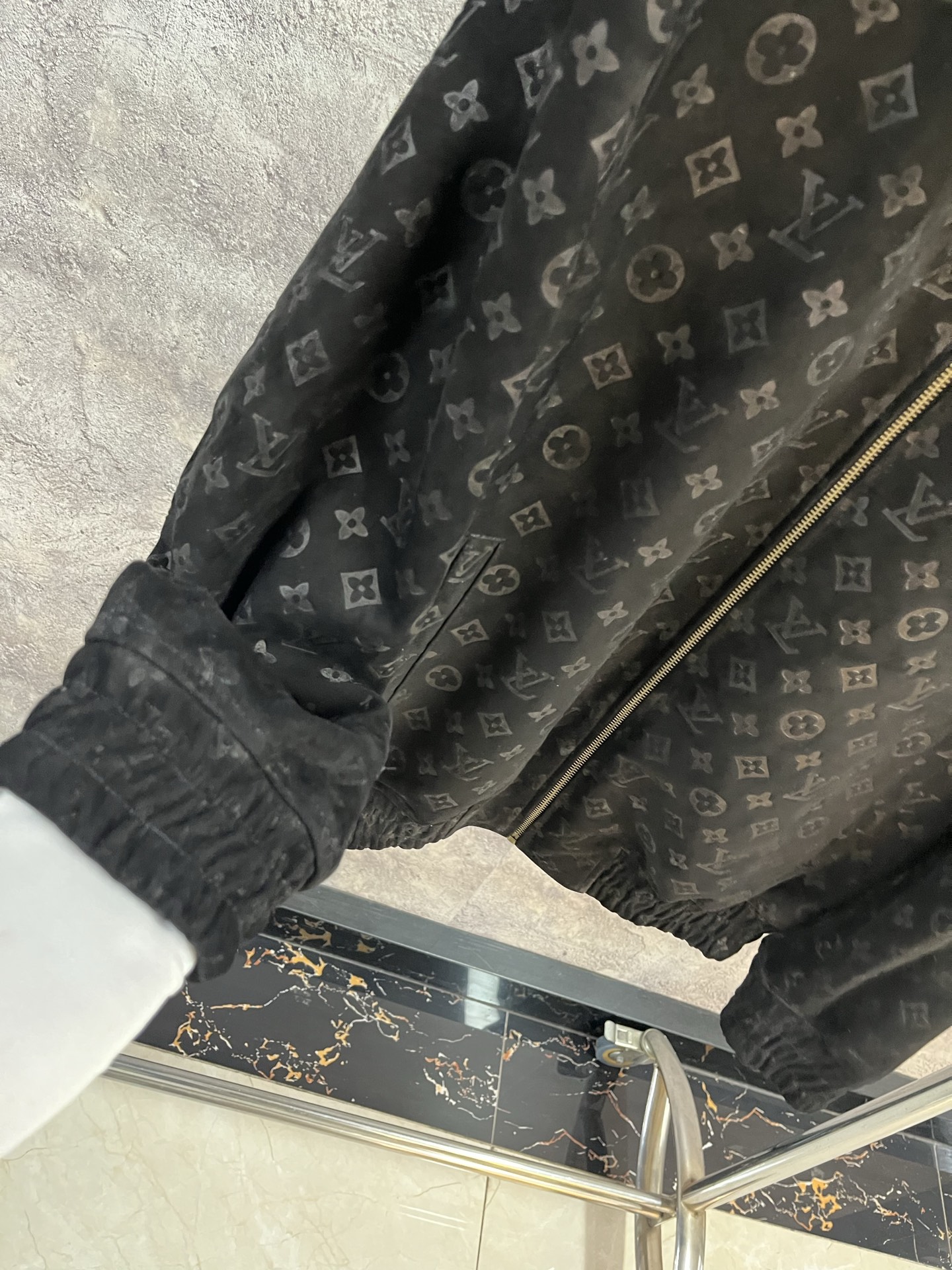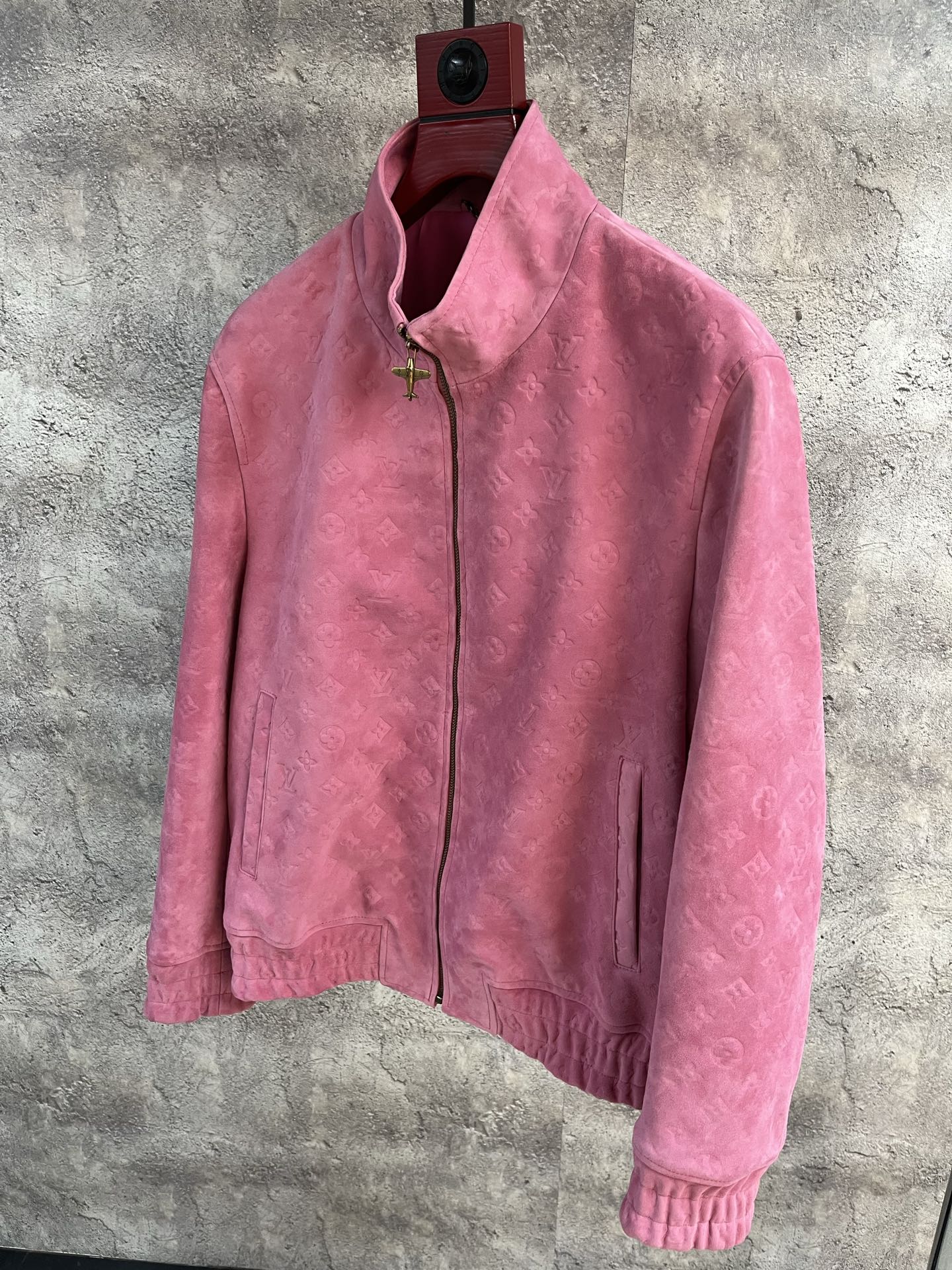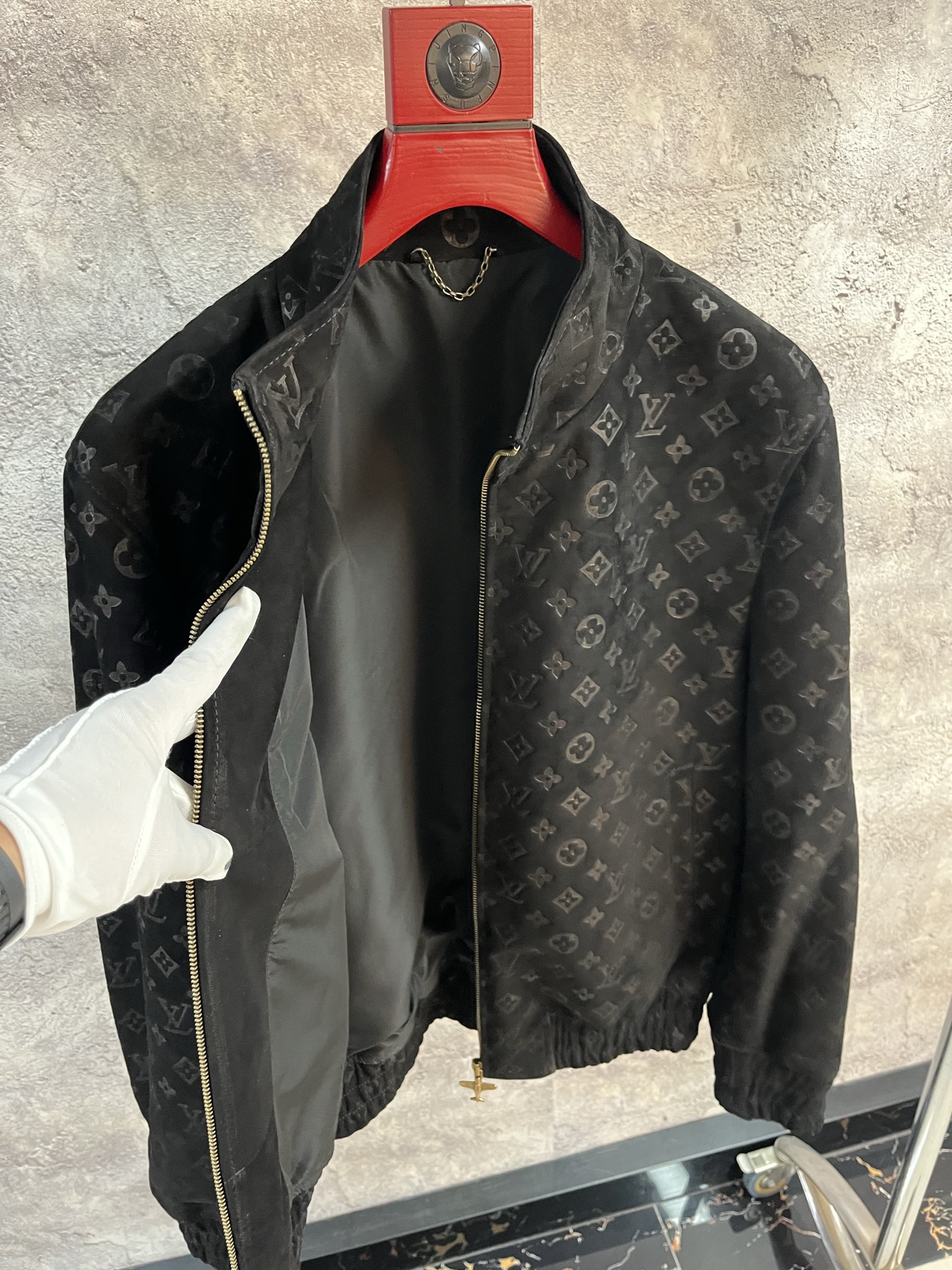 Дизайн куртки включает в себя фирменный монограммный узор, классический воротник-стойку и застёжку-молнию золотистого оттенка, добавляющую нотку роскоши.