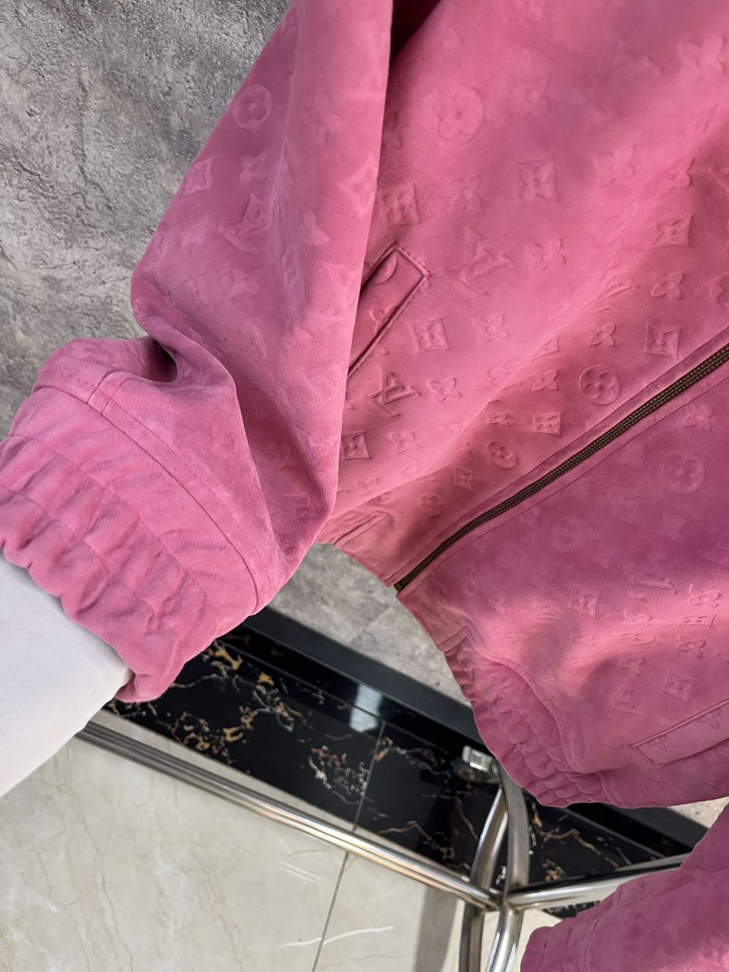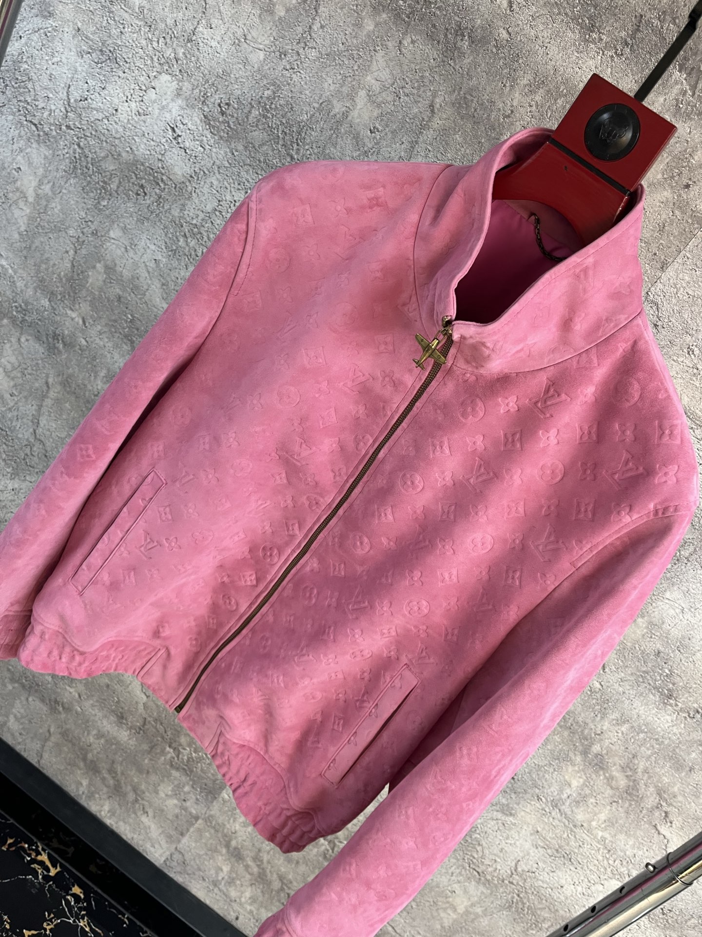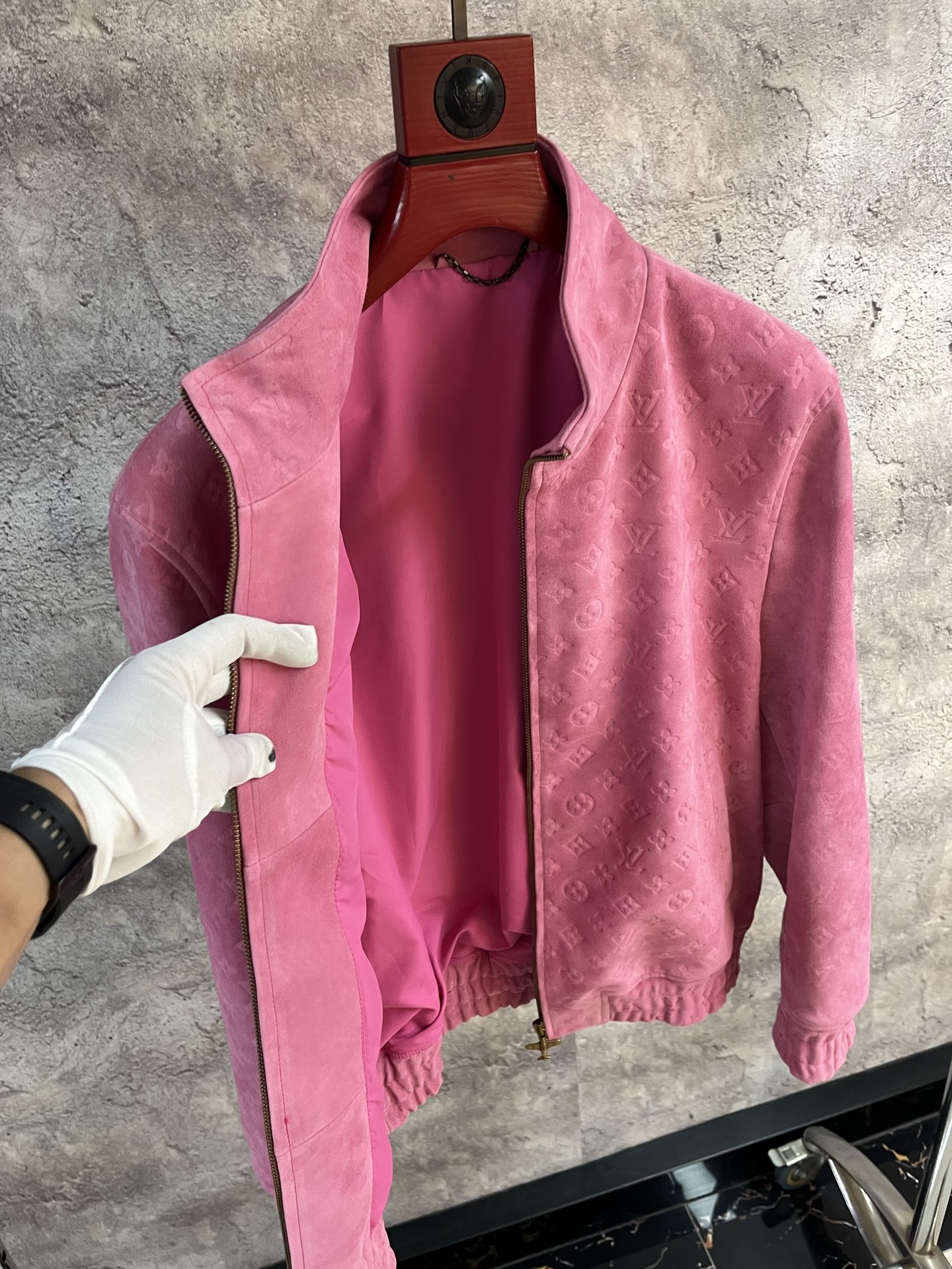 Дизайн куртки включает в себя фирменный монограммный узор, классический воротник-стойку и застёжку-молнию золотистого оттенка, добавляющую нотку роскоши.
