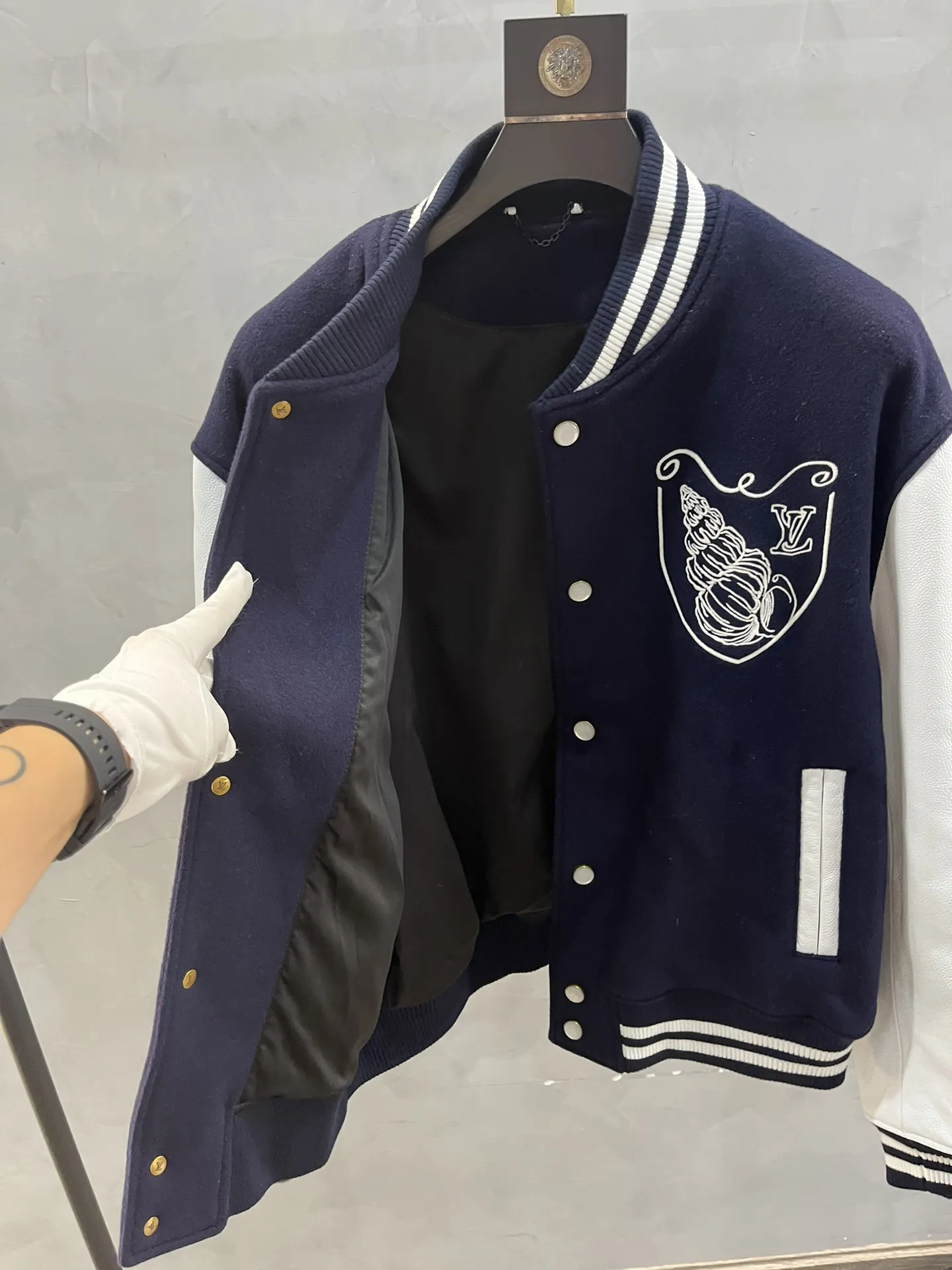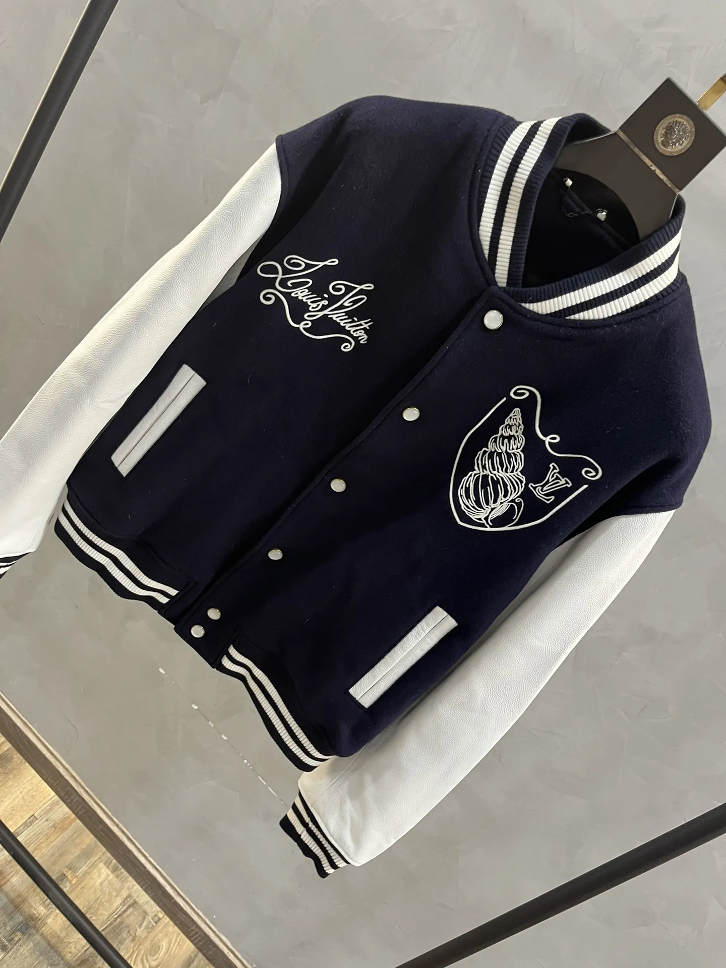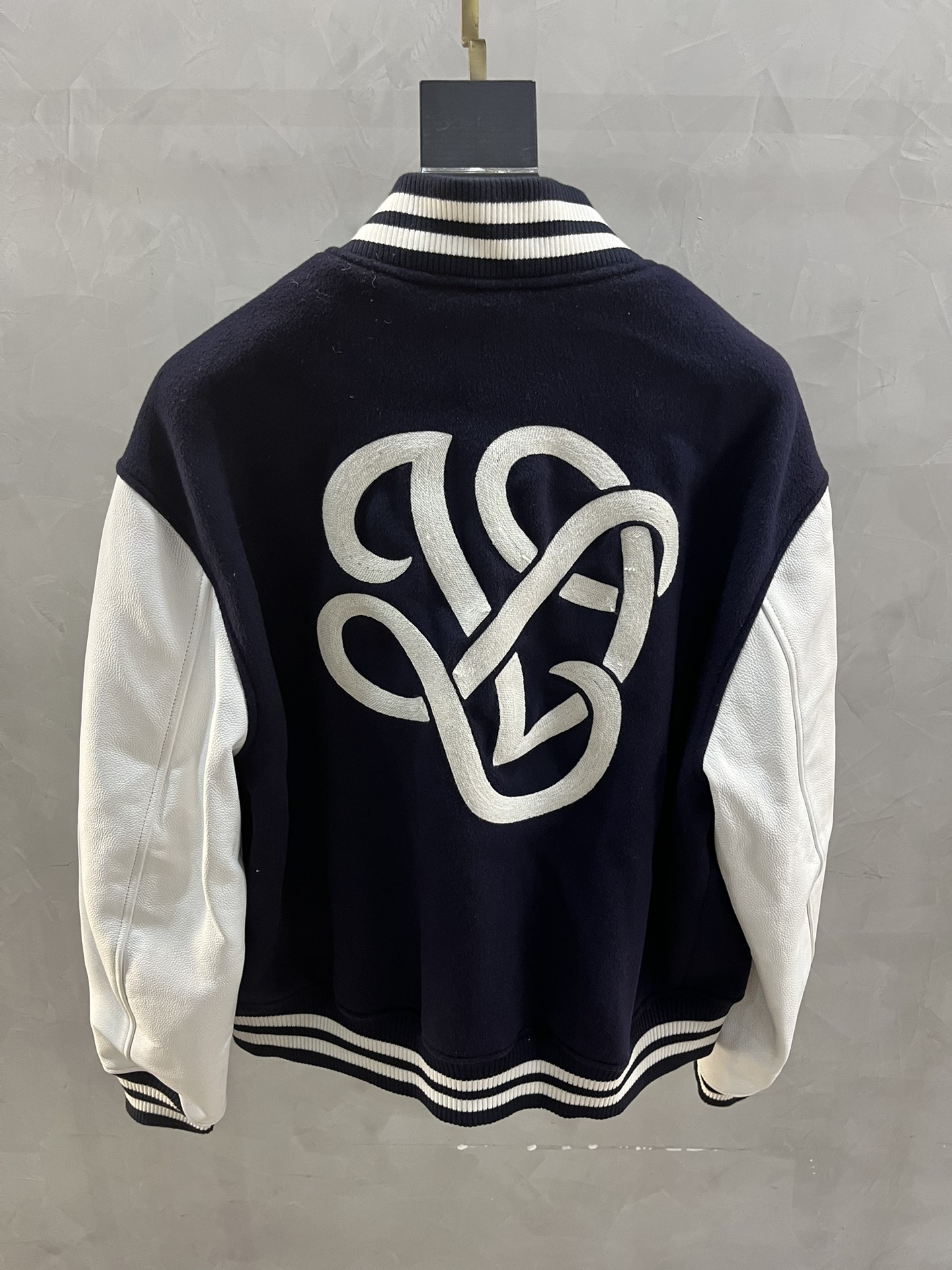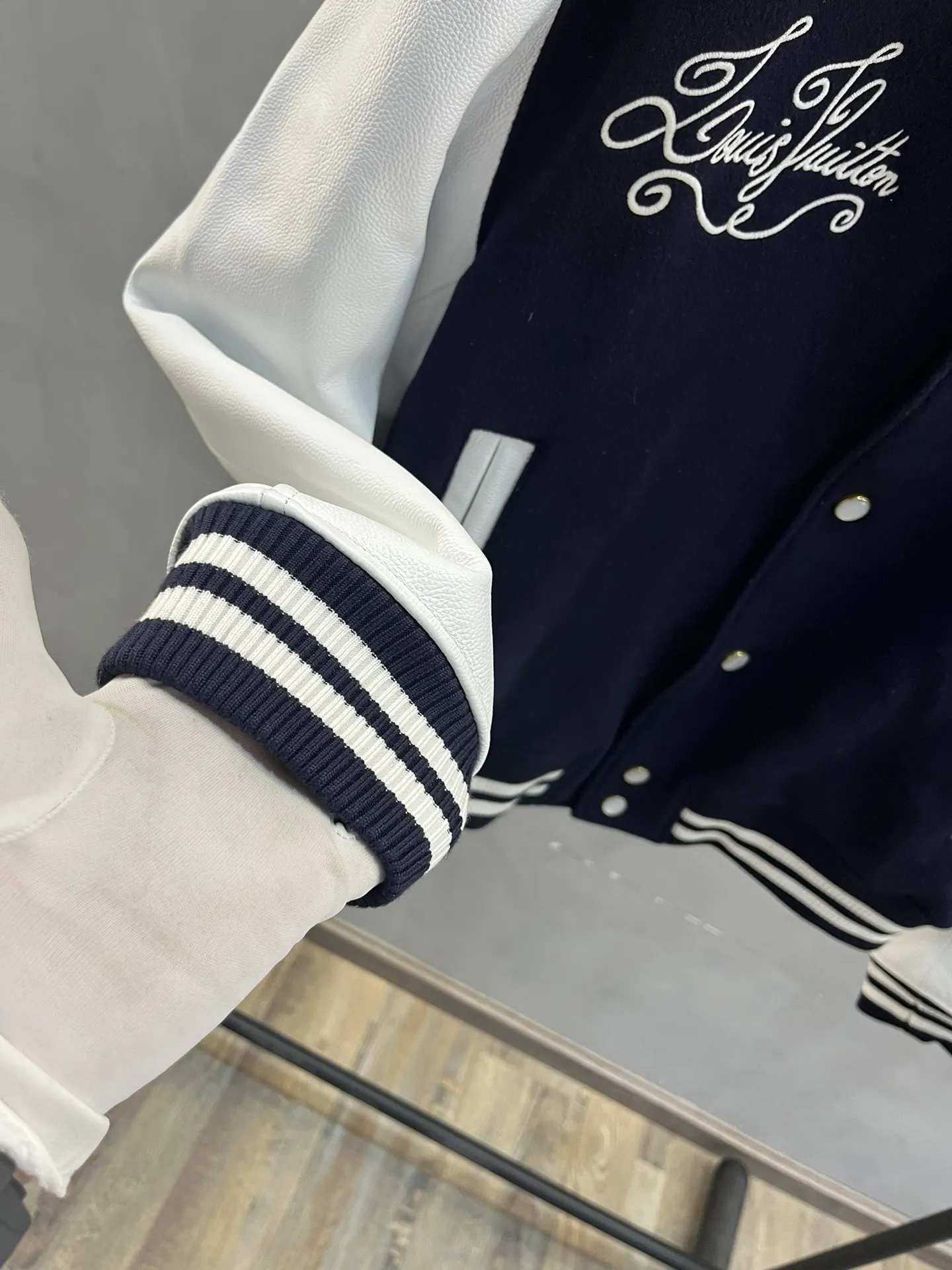 Темно-синий цвет основной части изделия гармонично контрастирует с белыми кожаными рукавами, создавая эффектный и стильный образ. Декоративные элементы, такие как вышивка с логотипом бренда и оригинальный герб, добавляют уникальности и подчеркивают статусность изделия.