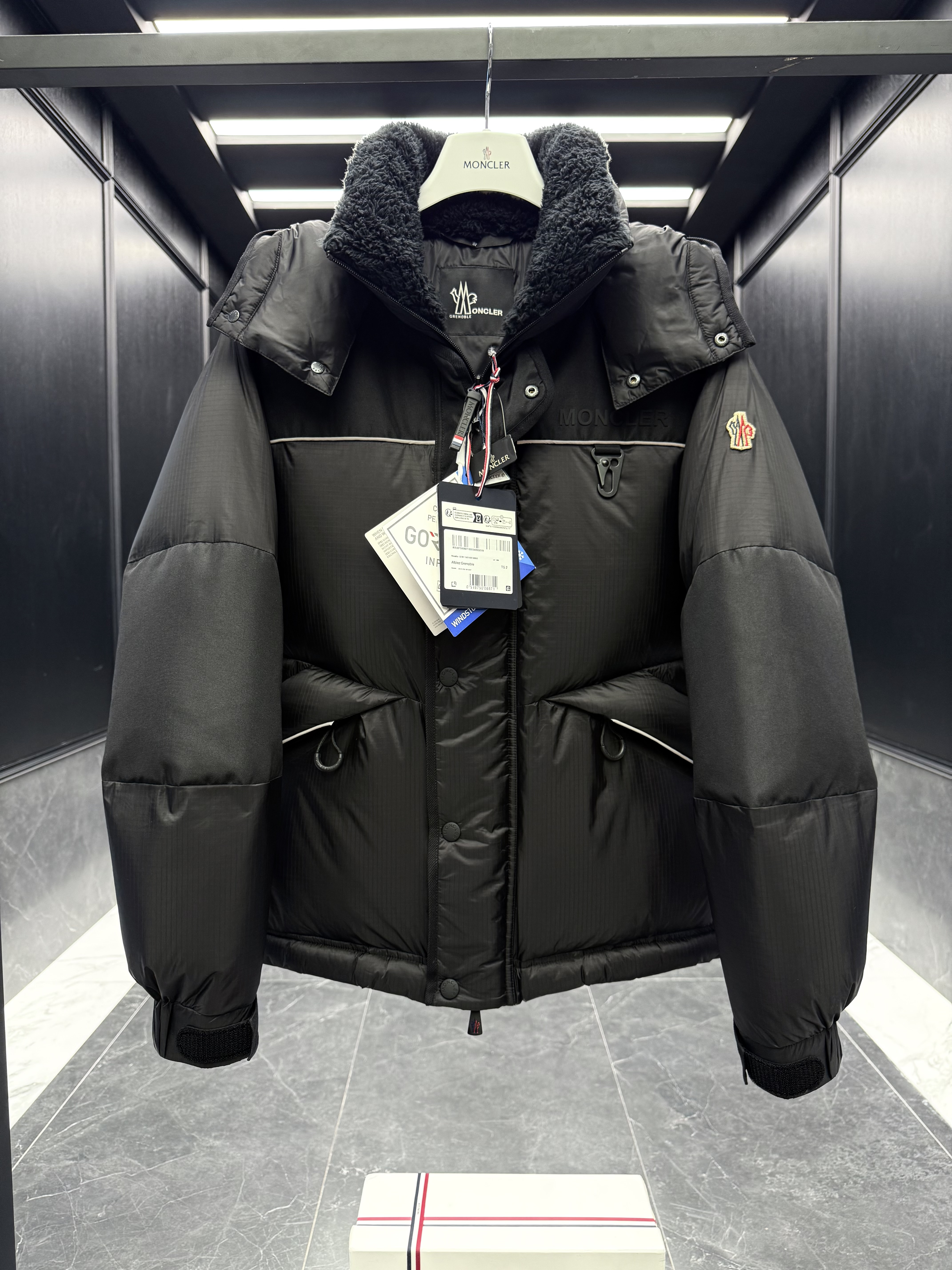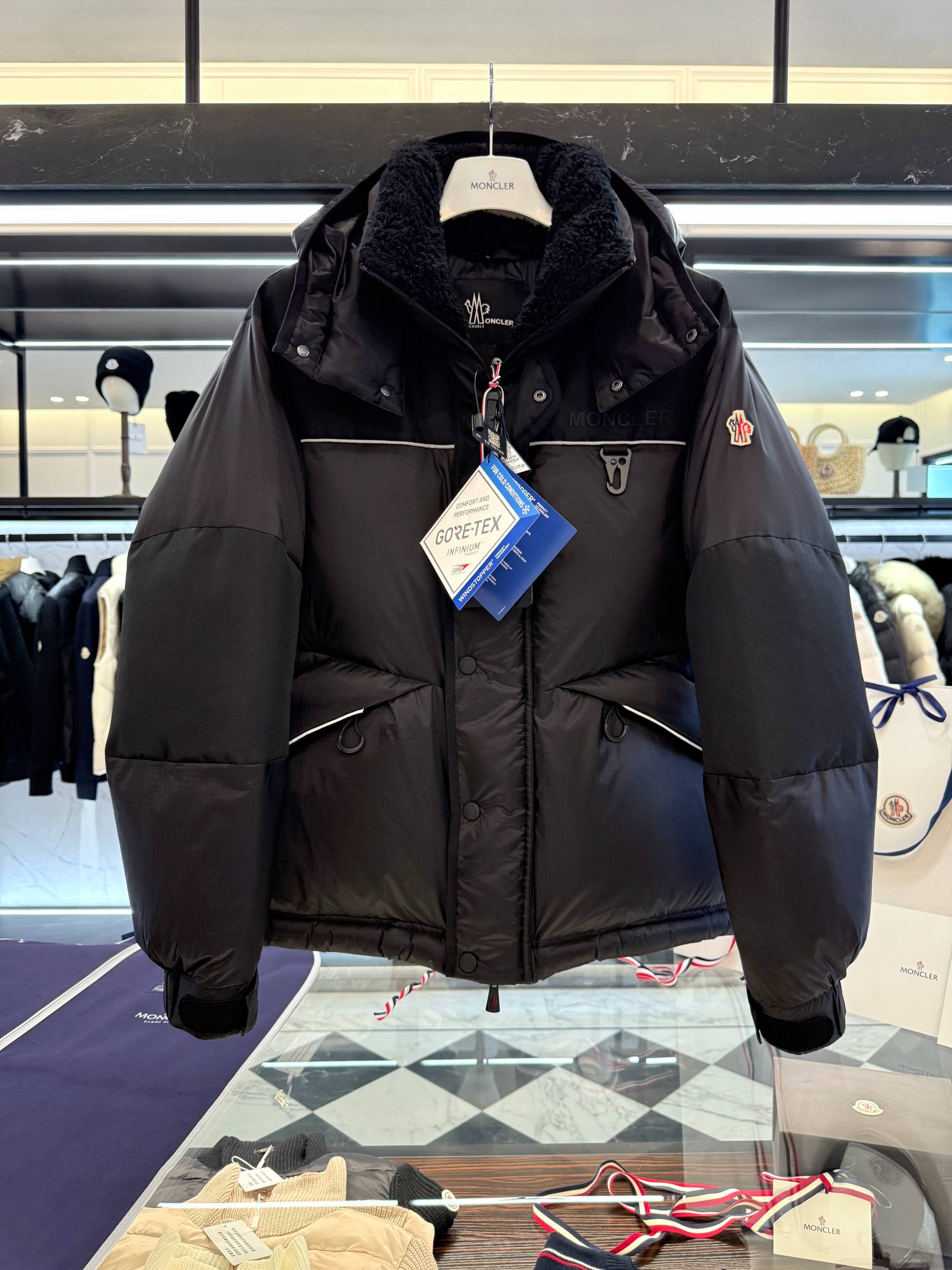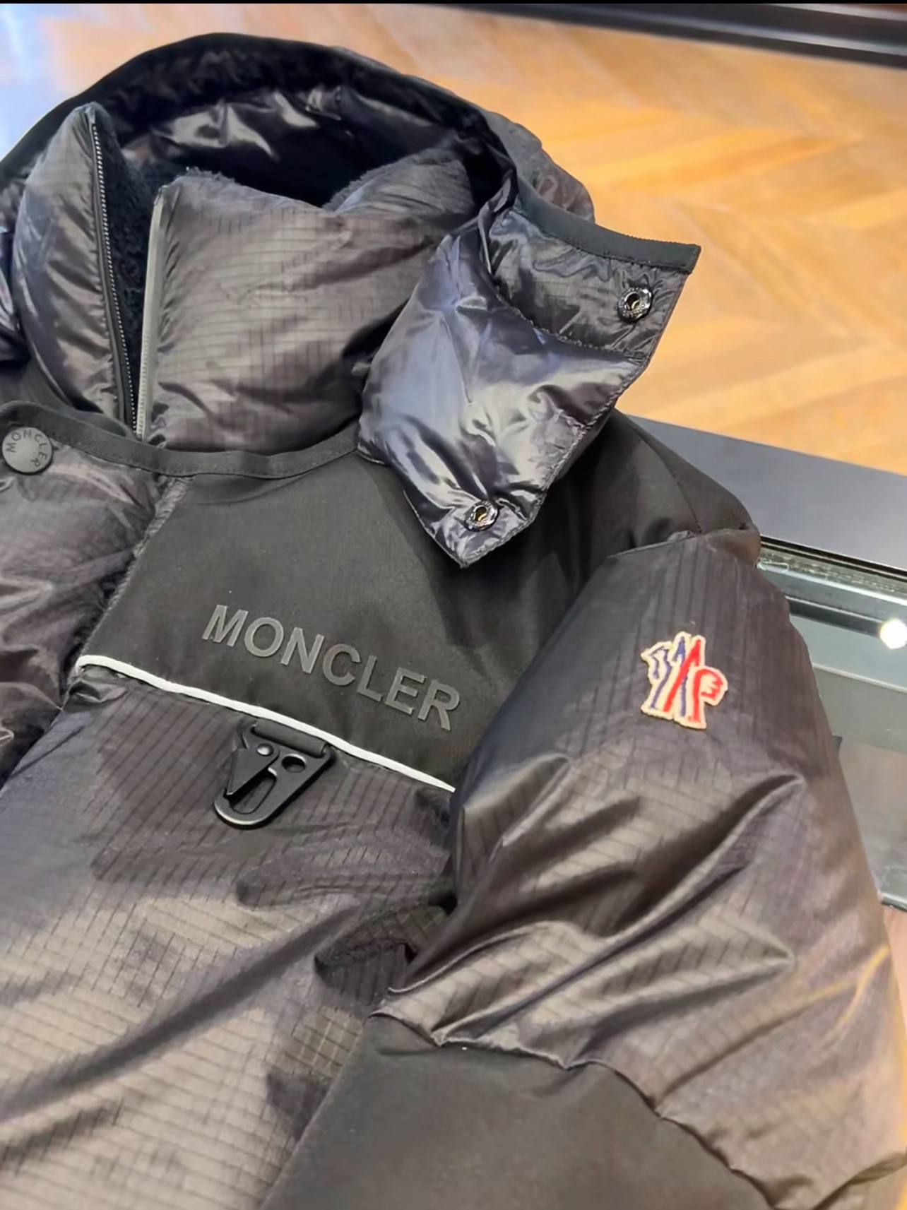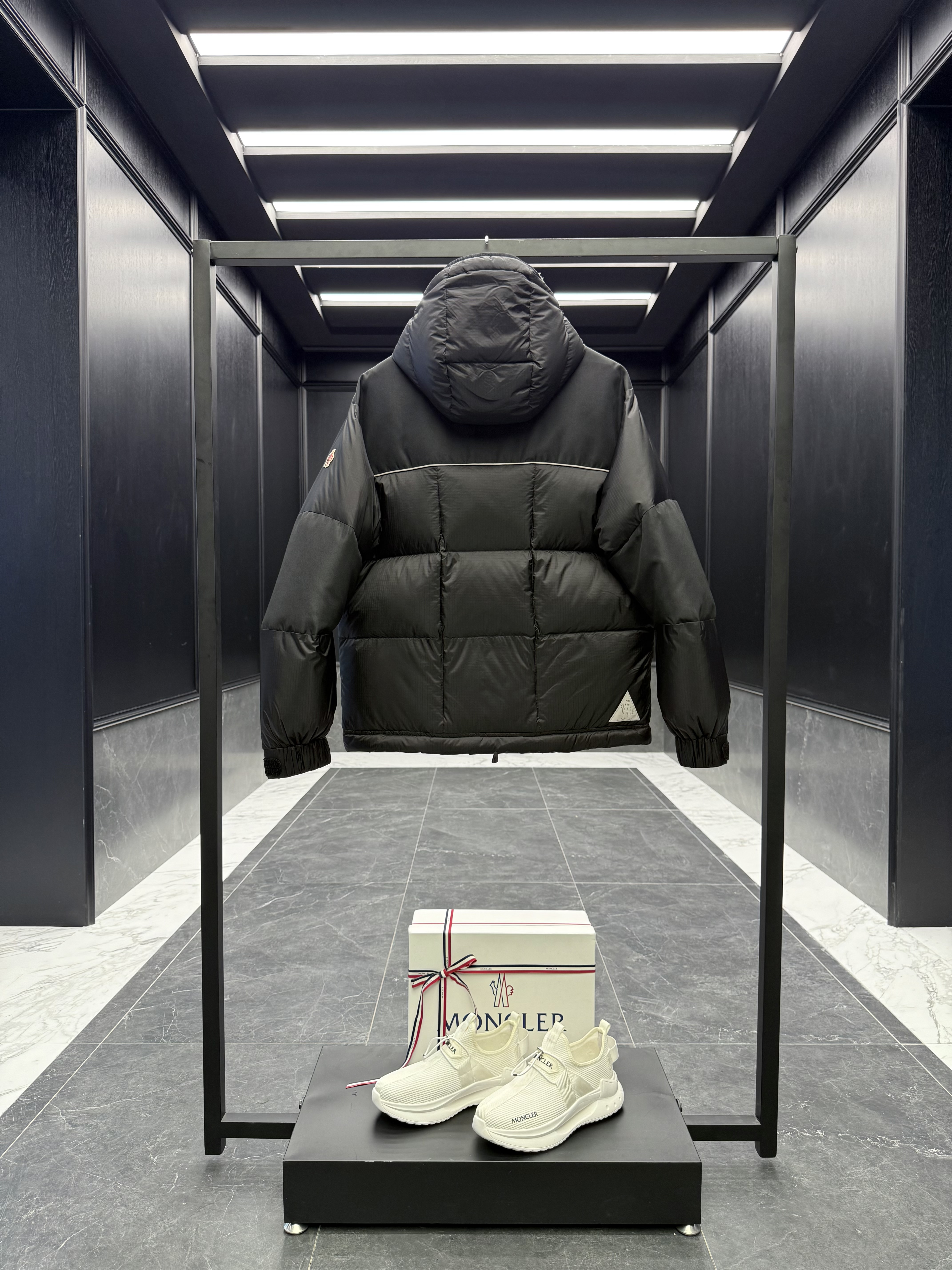 • Дизайн: объёмный, слегка укороченный силуэт с подчёркнутой стёжкой. Черный однотонный цвет с элегантными фирменными акцентами — нашивкой Moncler на рукаве и тонкой тонированной надписью на груди.