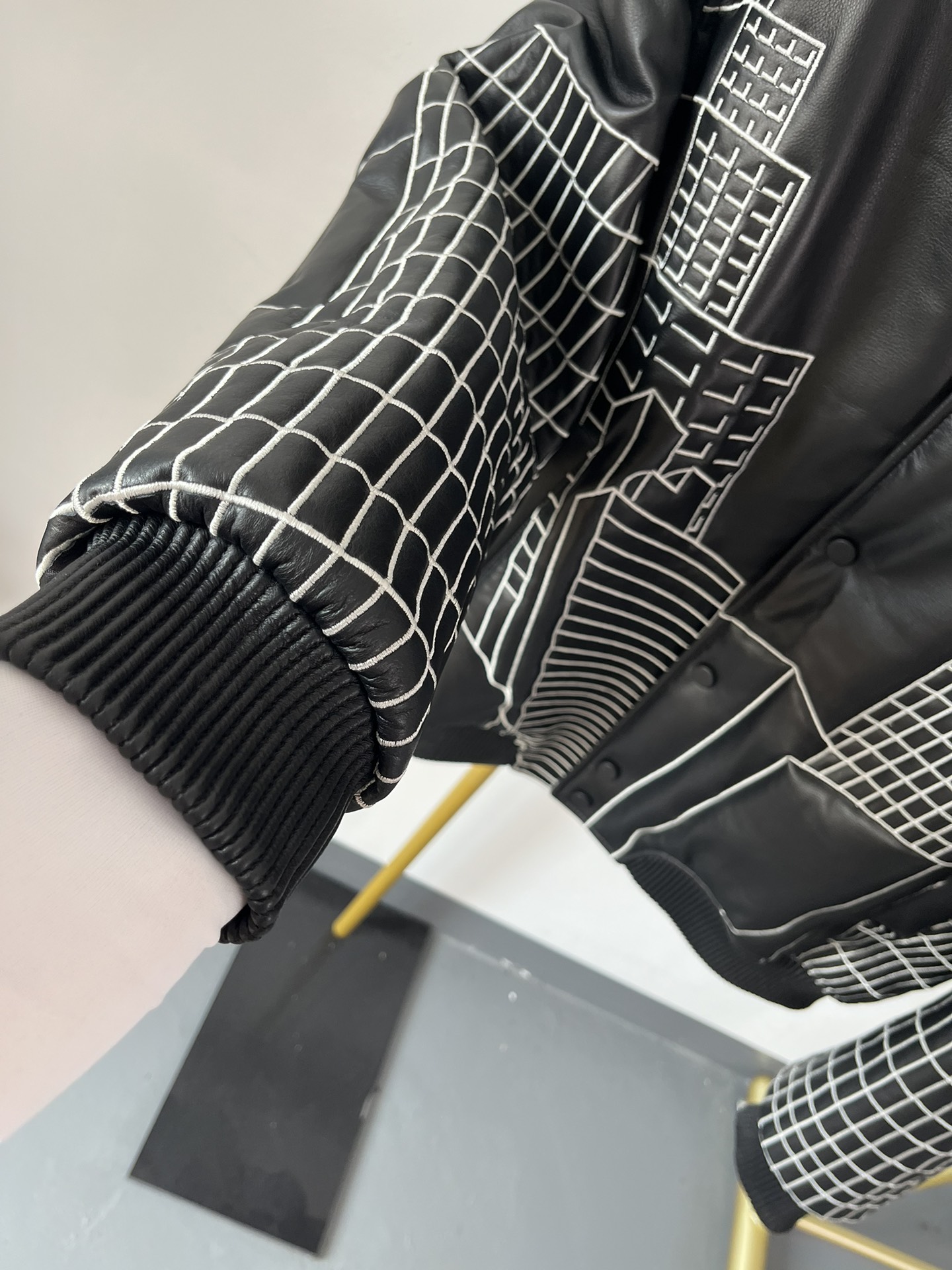 Главной изюминкой модели является графическая вышивка в виде архитектурных силуэтов небоскребов, который придает изделию динамичный и футуристический вид. Куртка оснащена удобной застежкой на кнопках, а эластичные манжеты, воротник и пояс из трикотажа обеспечивают комфортную посадку.