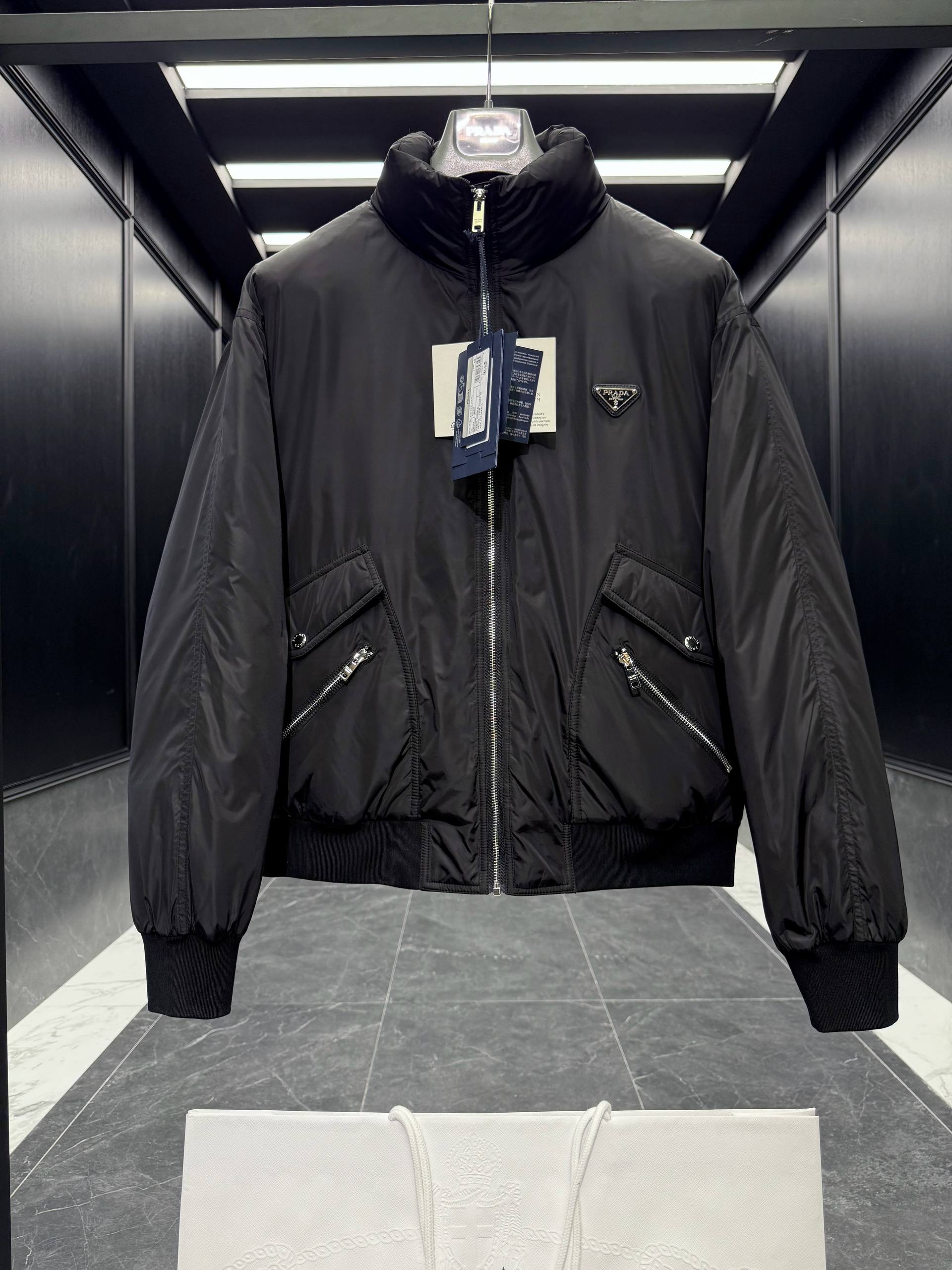 • Фирменная треугольная металлическая эмблема PRADA на груди — аккуратный знак принадлежности к бренду.