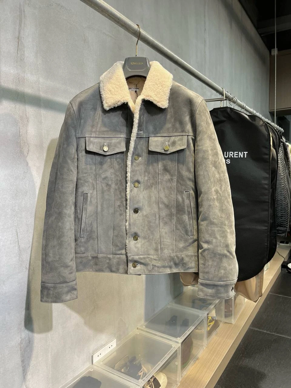 SAINT LAURENT Мужская кожаная куртка из серой замши и овчины