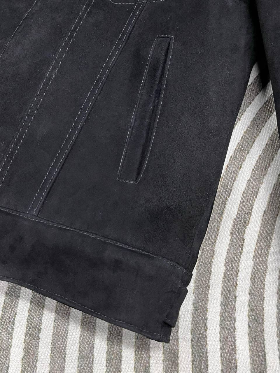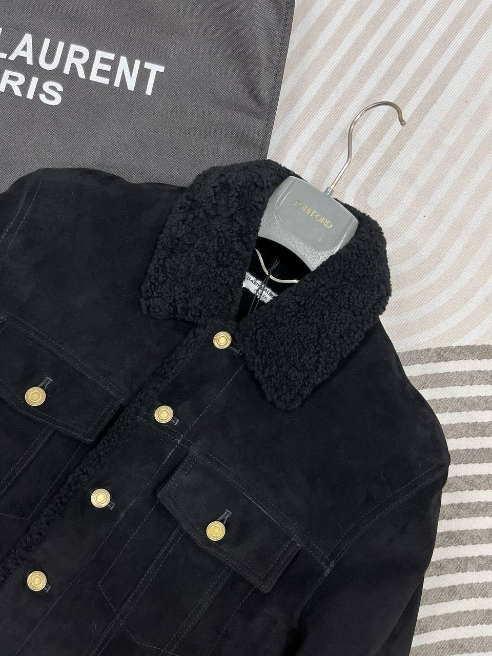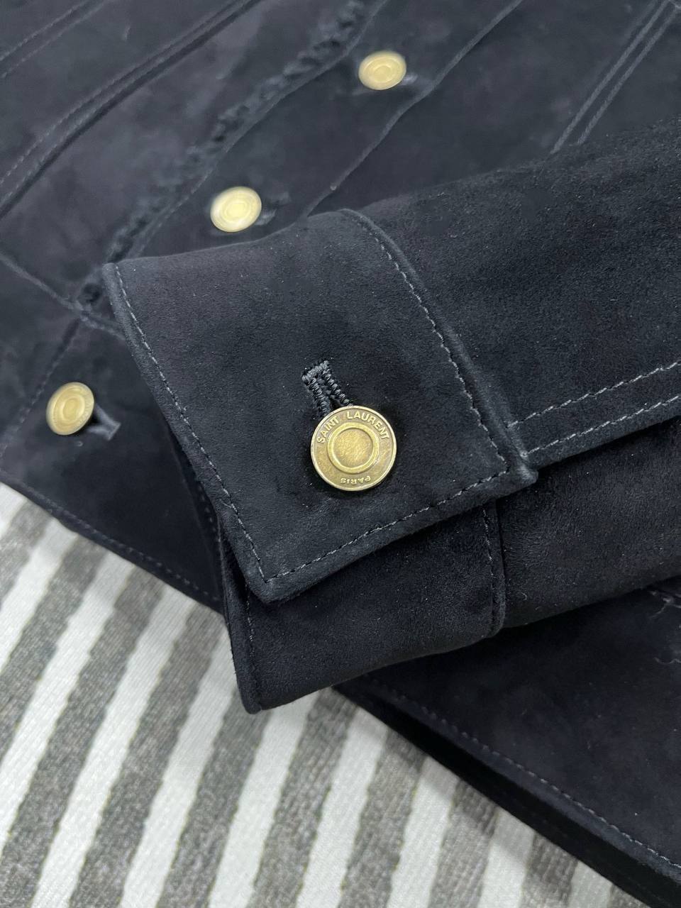 Элегантная мужская куртка Saint Laurent в черной замше с выразительным воротником из натуральной овчины. Современная интерпретация классического trucker‑кроя: с накладными клапанными карманами на груди, втачными боковыми карманами и благородной матовой фурнитурой золотистого тона. Идеальный выбор для прохладного сезона — стильно, тепло и универсально.