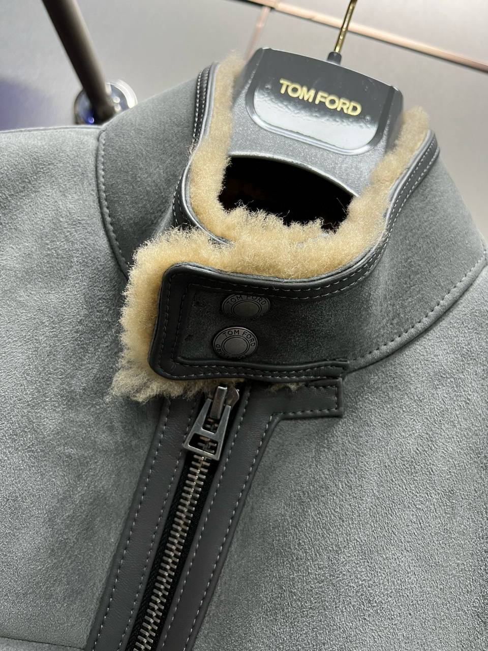 Фасон дублёнки лаконичный, но в то же время выразительный: прямой крой, аккуратный воротник-стойка с меховой застёжкой и молния по всей длине изделия. Манжеты и нижняя часть изделия выполнены из эластичного трикотажа, что обеспечивает идеальную посадку и защищает от ветра. Два боковых прорезных кармана на молнии не только добавляют практичности, но и подчёркивают минимализм дизайна. Изделие украшено фирменной фурнитурой и брендовым лейблом TOM FORD на внутренней части воротника.