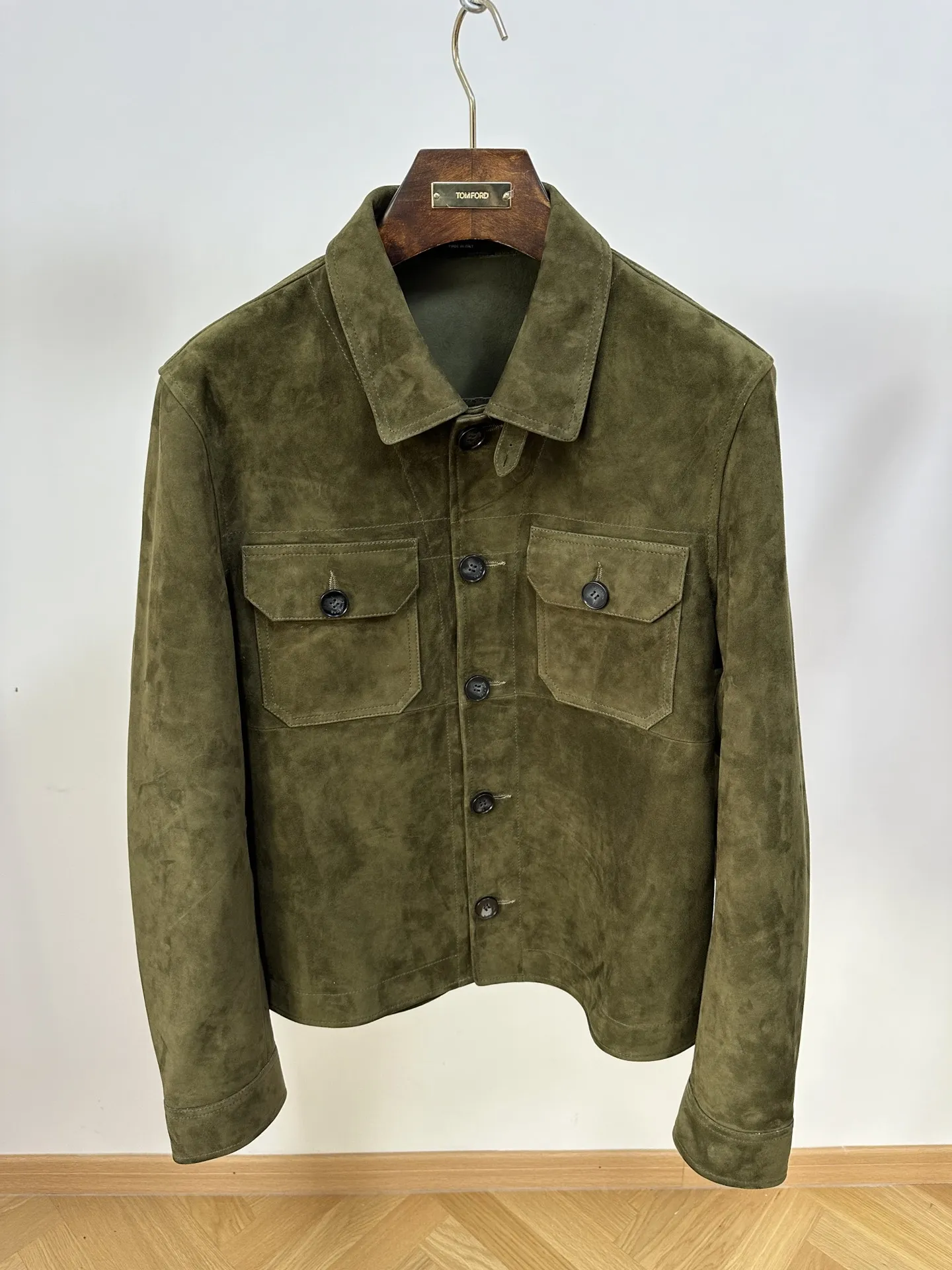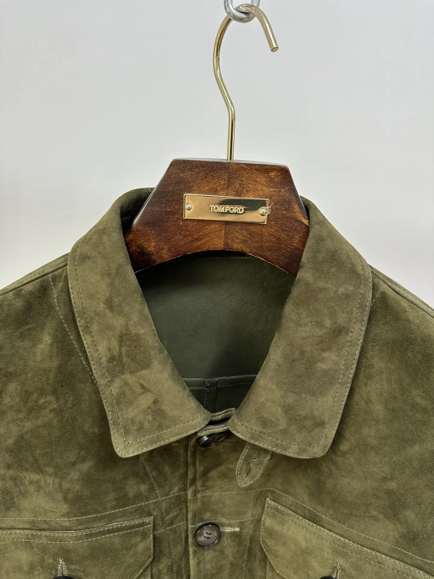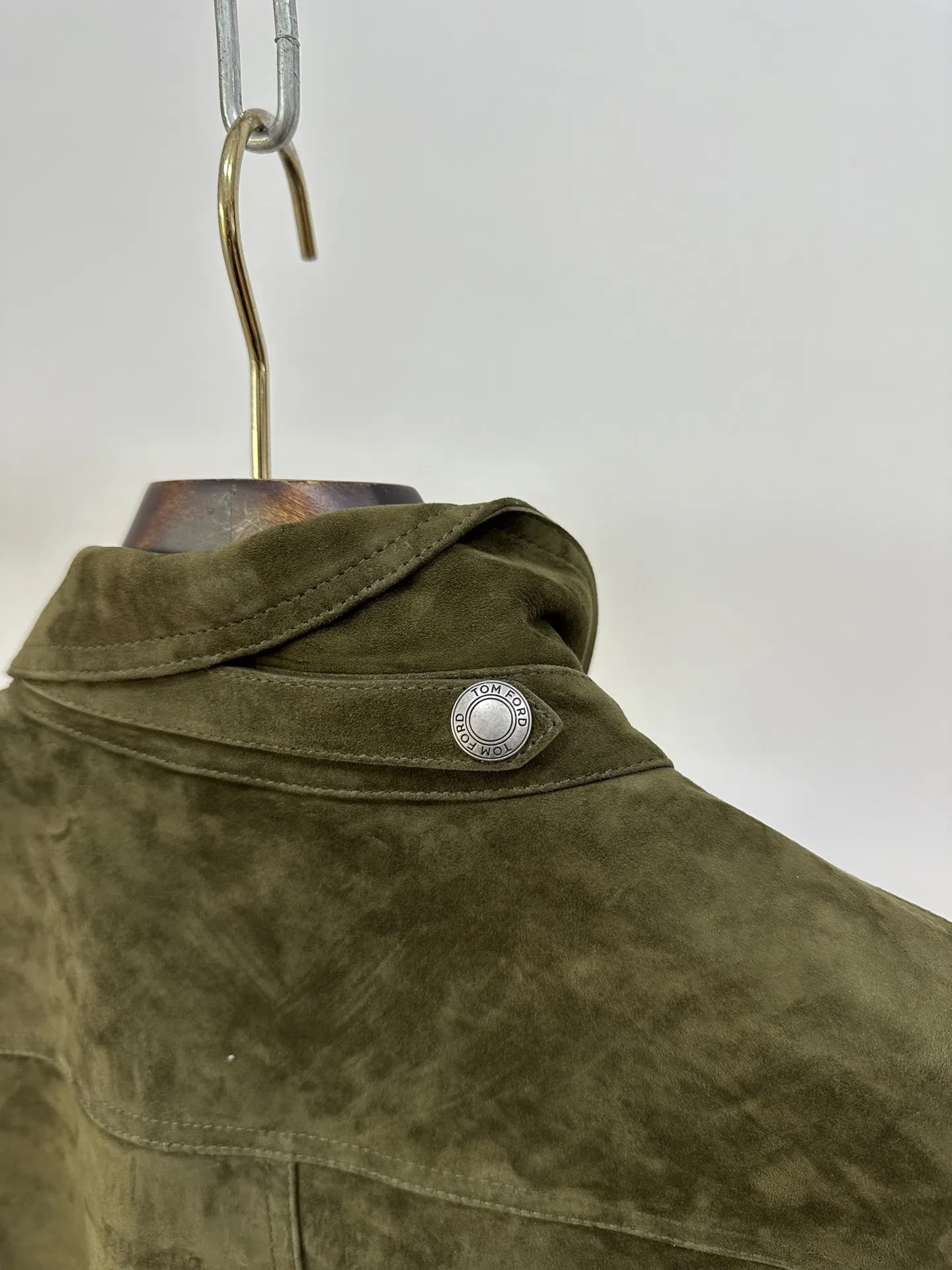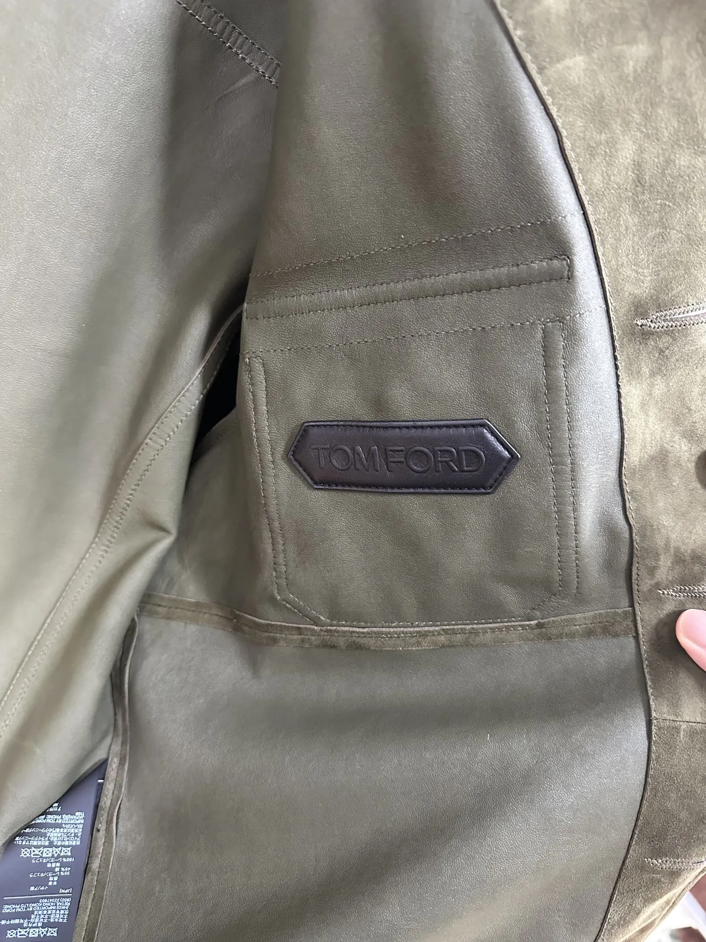 Кожаная куртка от Tom Ford в классическом стиле — это отличный выбор для осенне-зимнего сезона. Темно-зеленый цвет придаёт ей элегантности и универсальности, позволяя сочетать с различными нарядами.