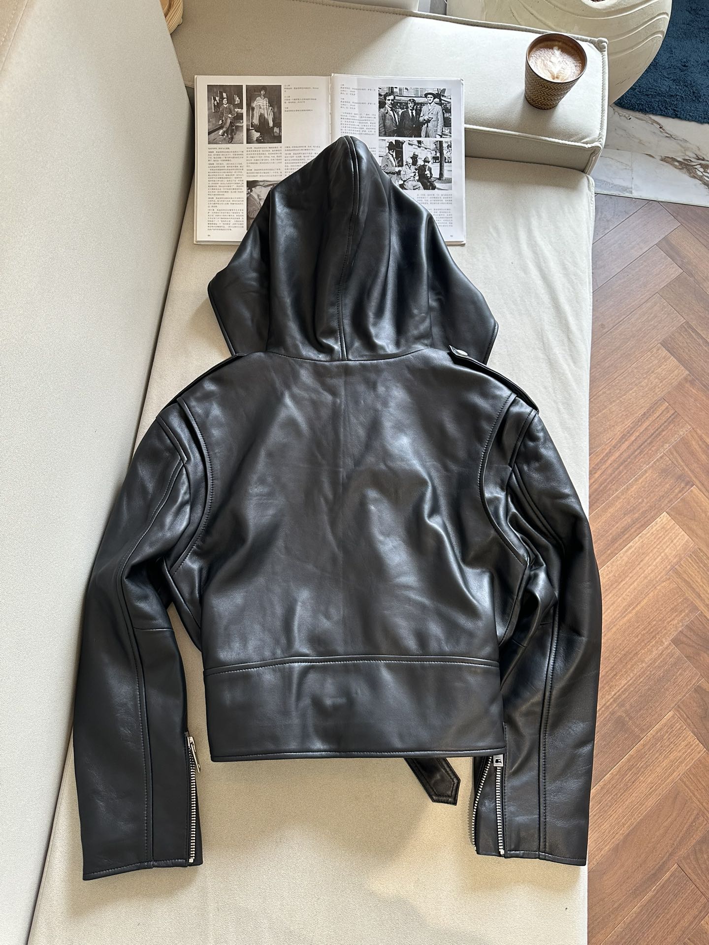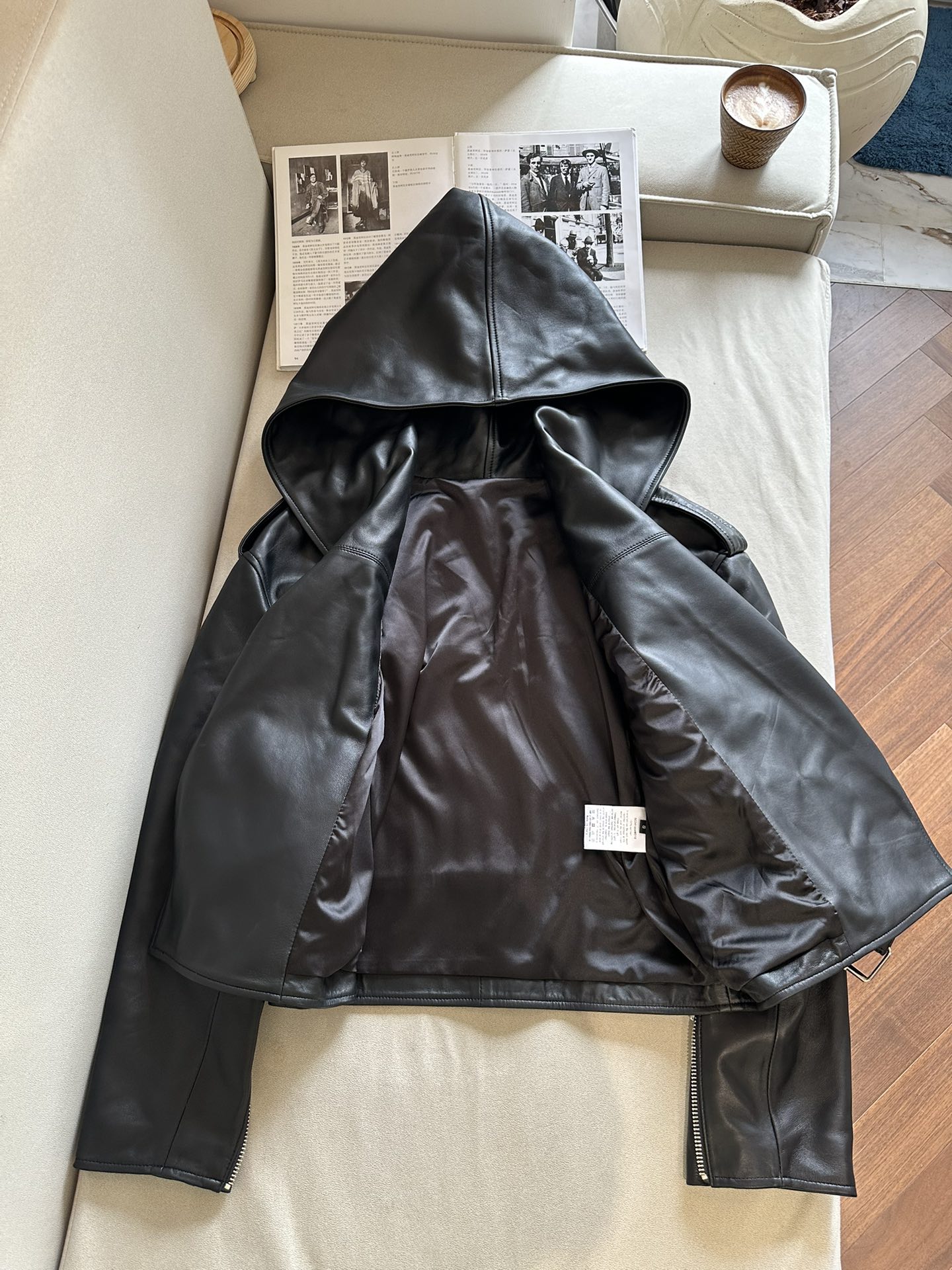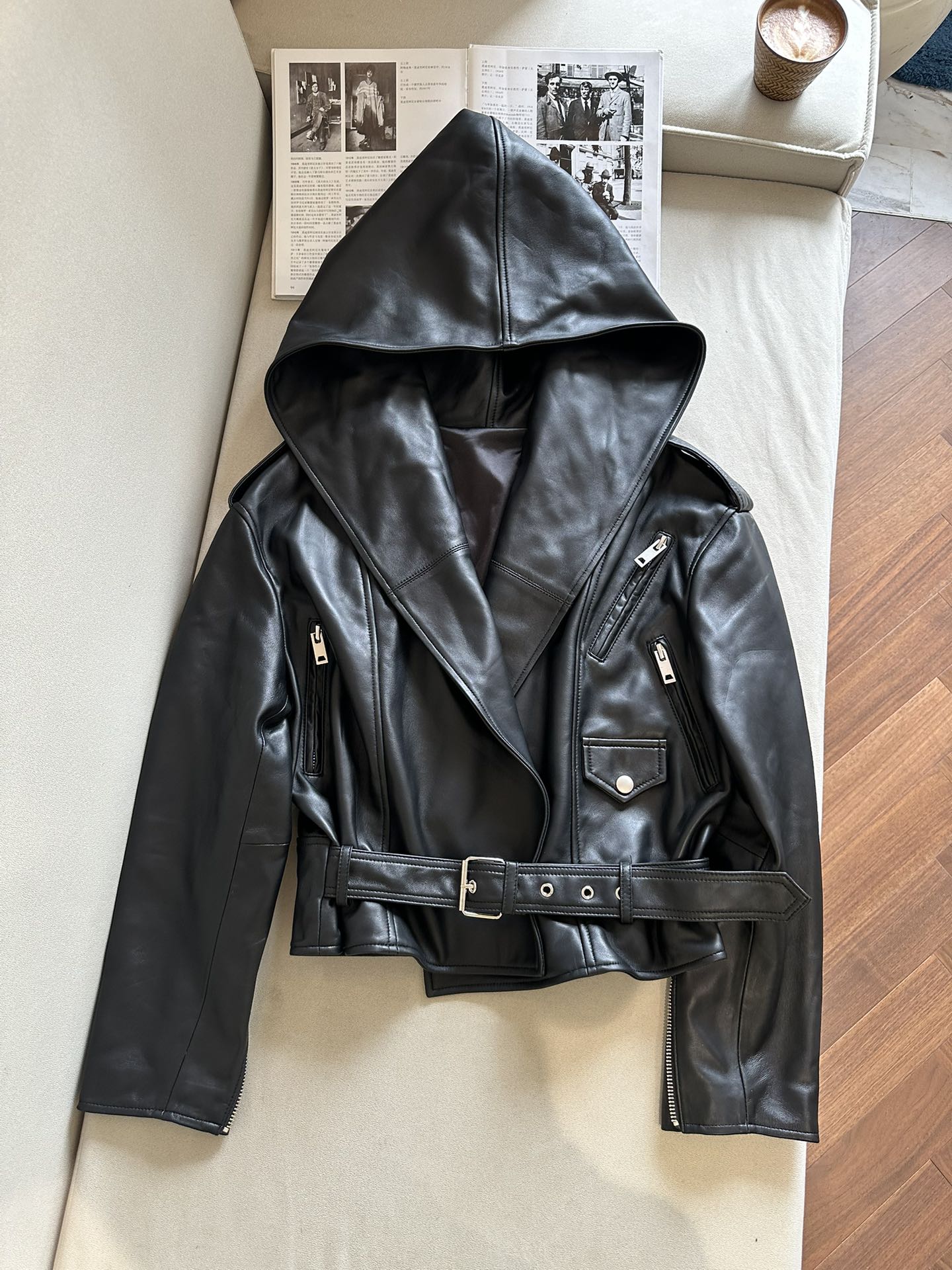 Особенностью куртки является объемный капюшон, который добавляет нотку загадочности и функциональности, защищая от ветра и холода.