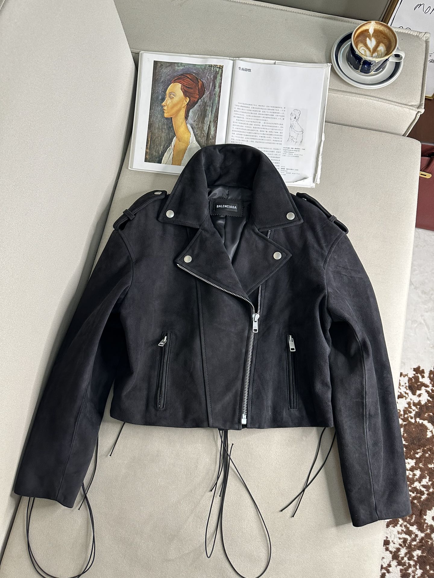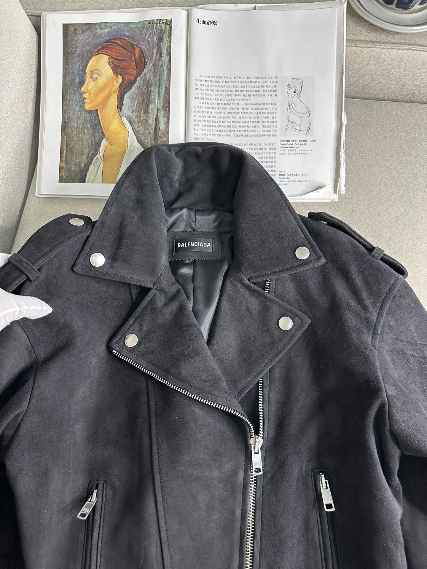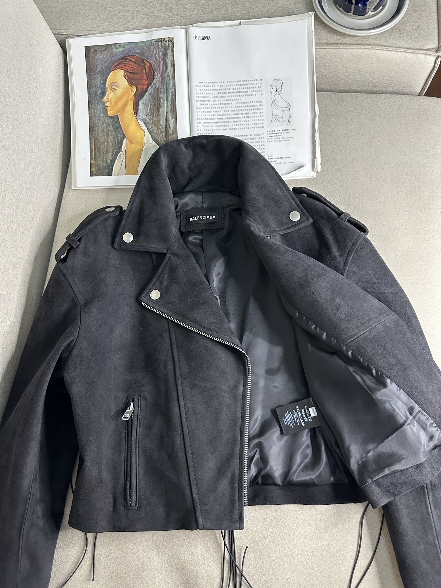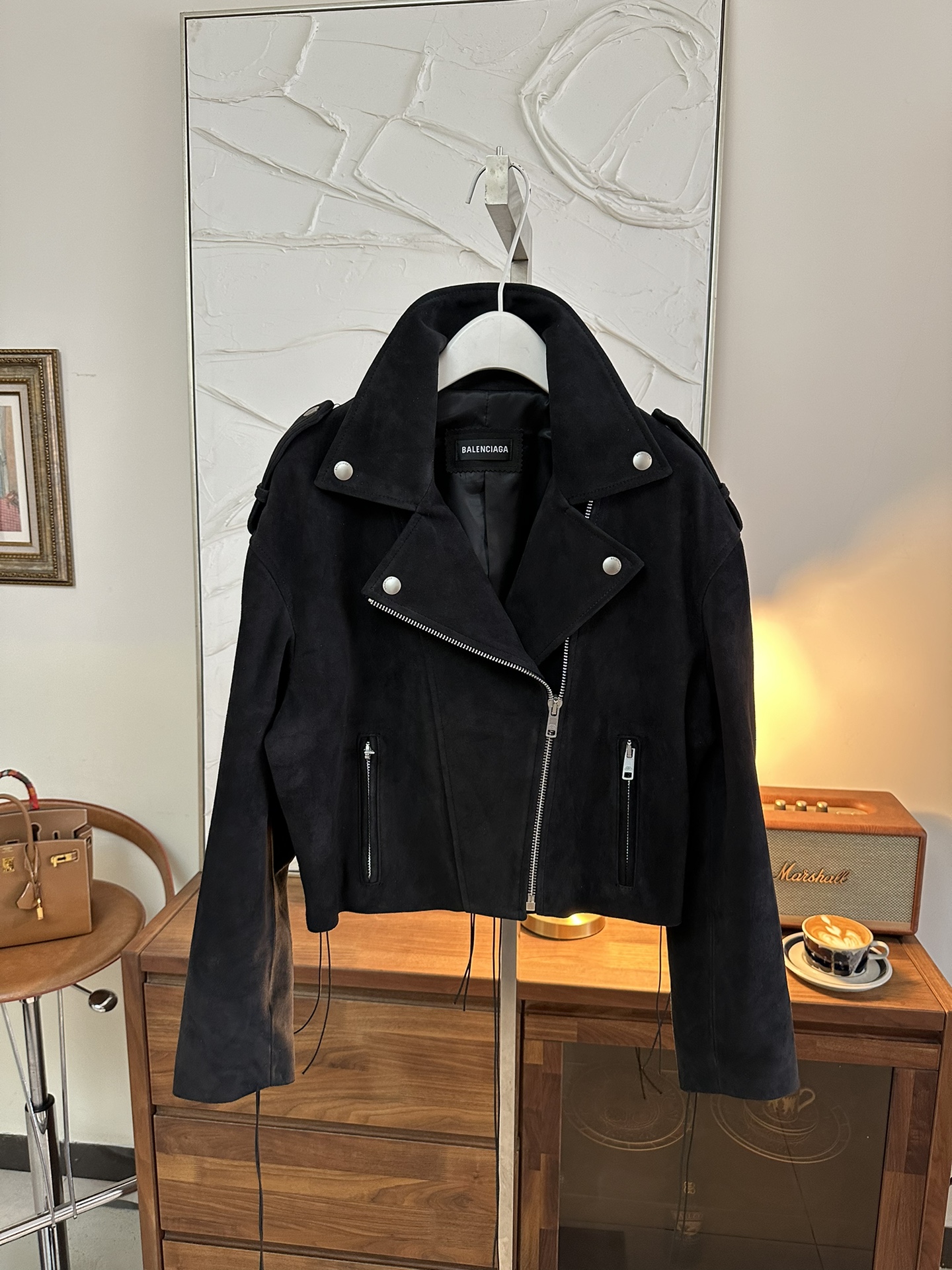 Женская кожаная куртка от Balenciaga выполнена из высококачественной козьей замши, которая придаёт изделию роскошный и утончённый вид. Модель выполнена в классическом стиле косухи с асимметричной молнией, что добавляет дерзости и современности.