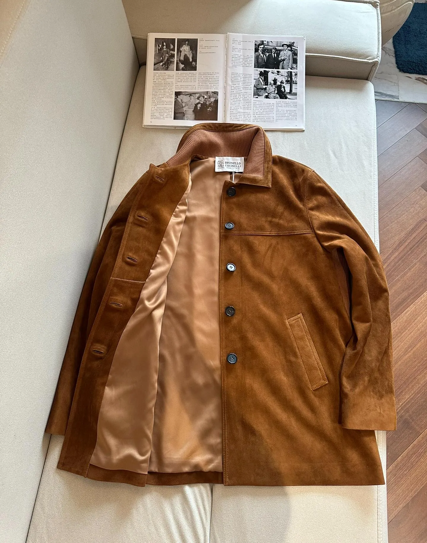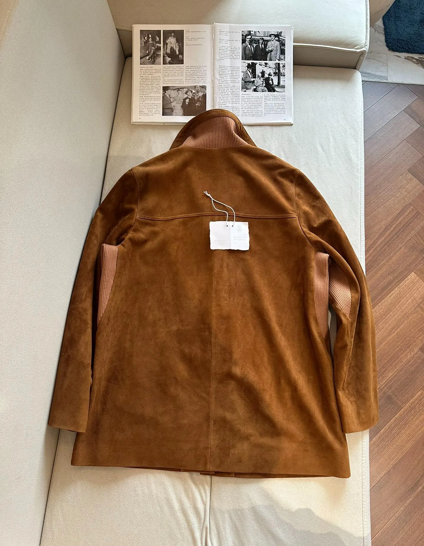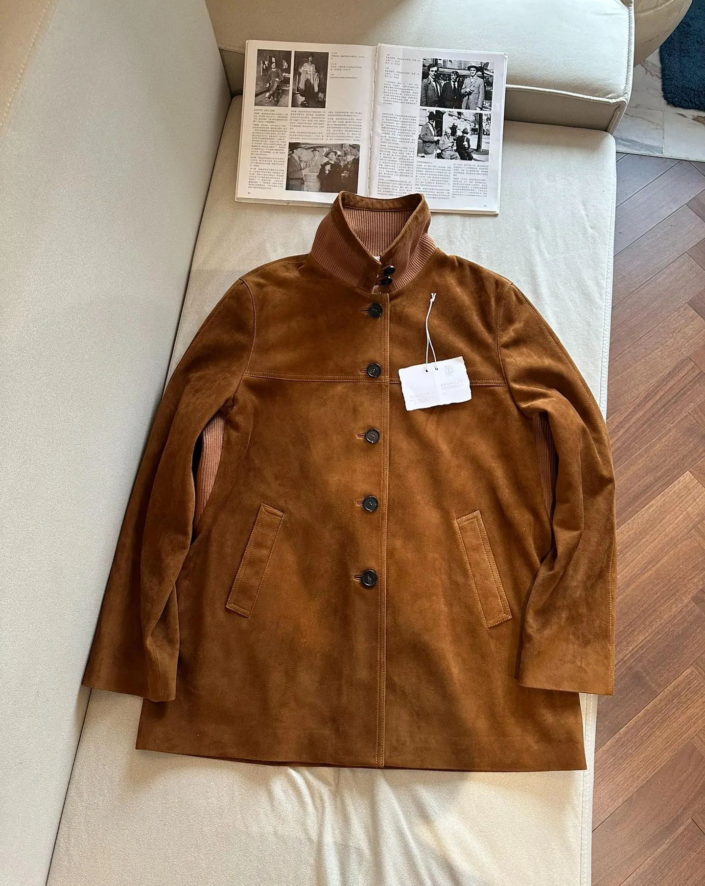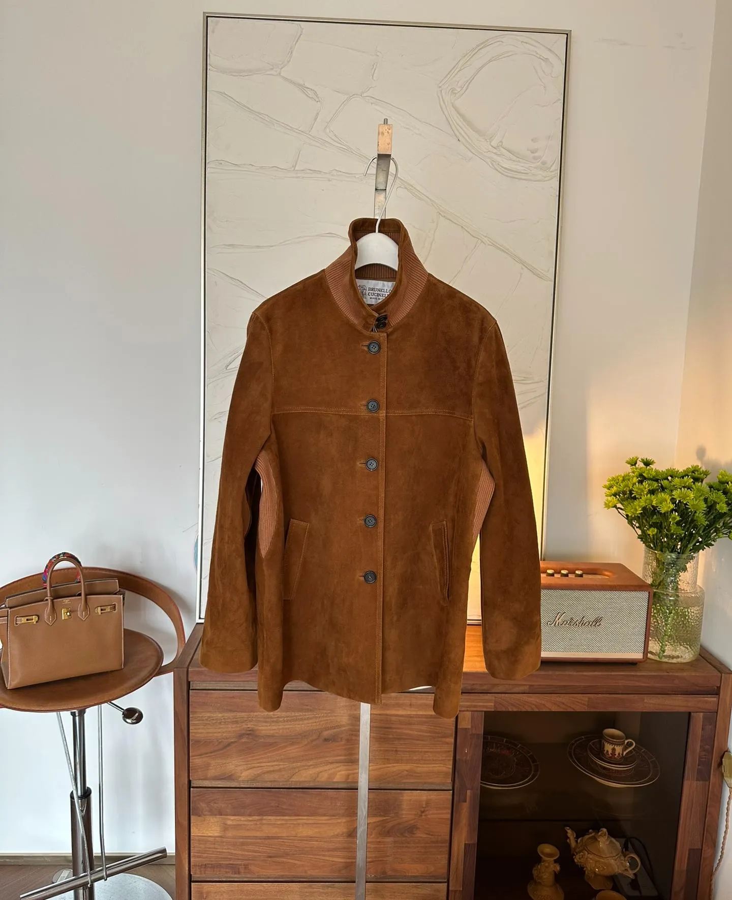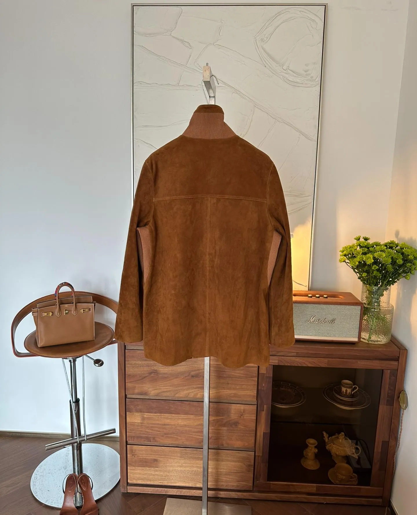 Куртка имеет лаконичный дизайн с акцентом на детали: классический воротник-стойка с контрастной текстурой, застежка на пуговицах и функциональные боковые карманы. Мягкая замша обеспечивает комфорт и приятные тактильные ощущения, а минималистичный крой подчеркивает изысканность и универсальность модели.