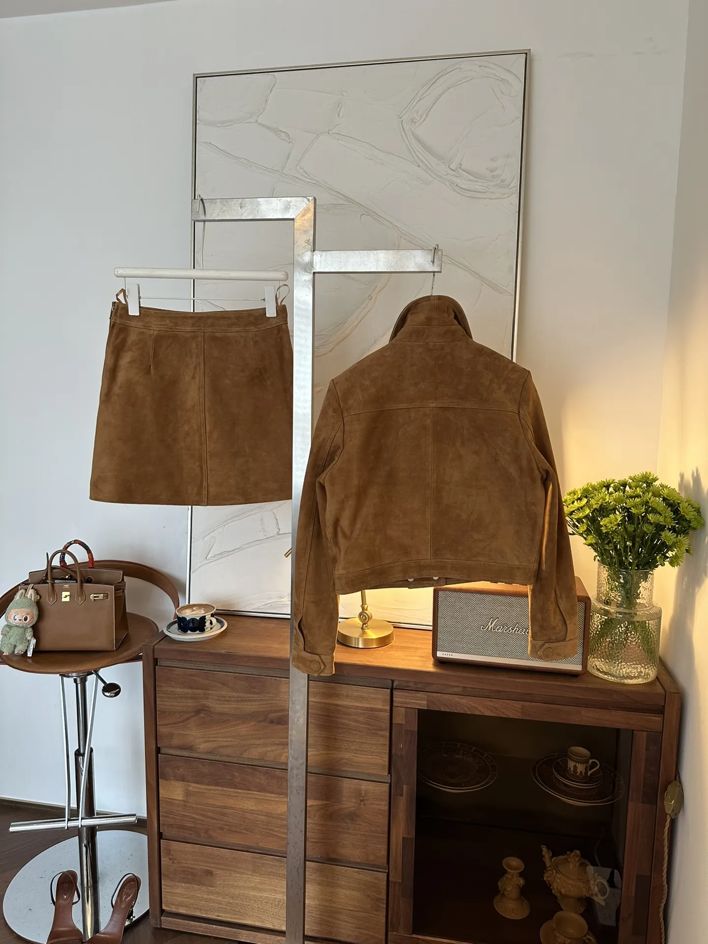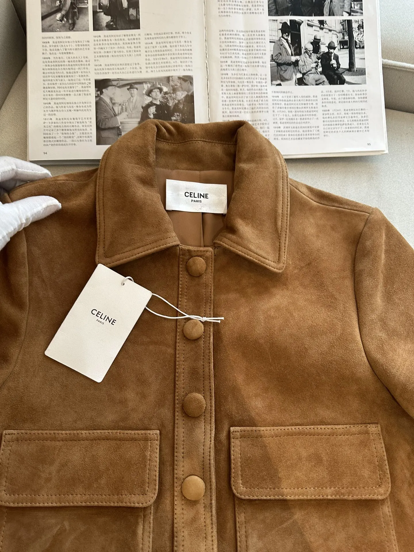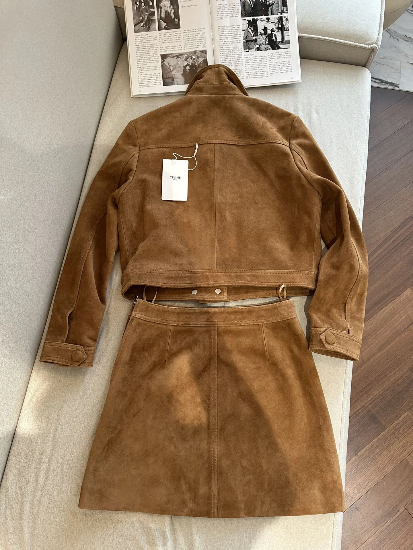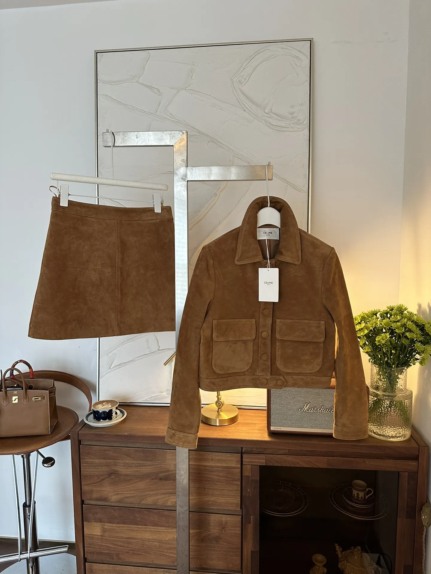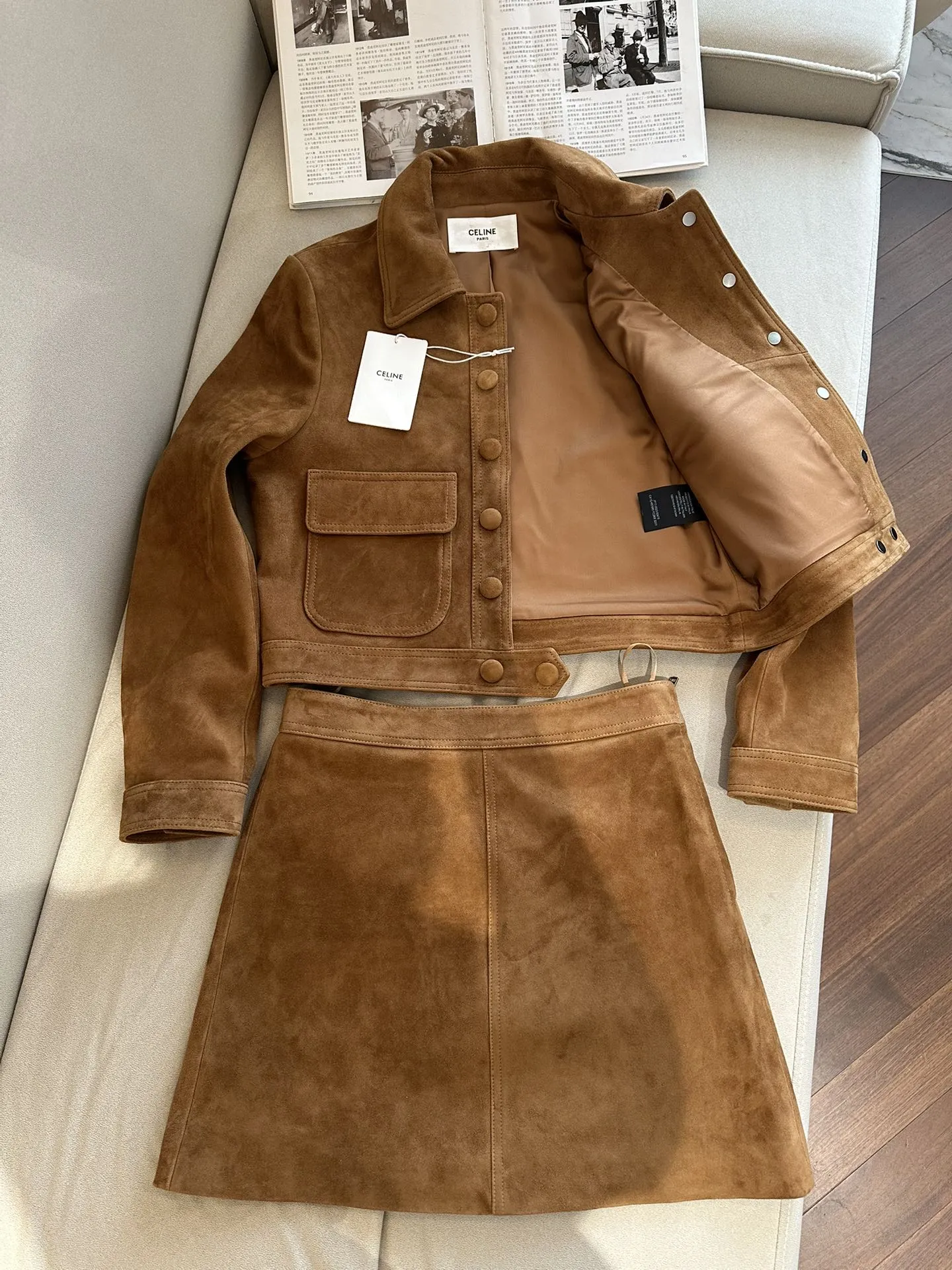 Женский костюм Celine из козьей замши — воплощение элегантности и современного стиля. Комплект состоит из укороченного жакета прямого кроя с крупными накладными карманами и мини-юбки А-силуэта.