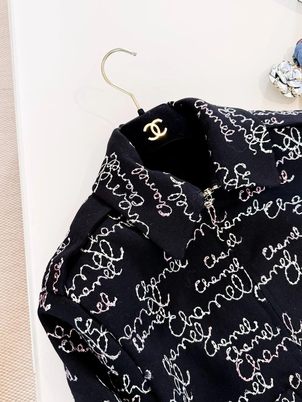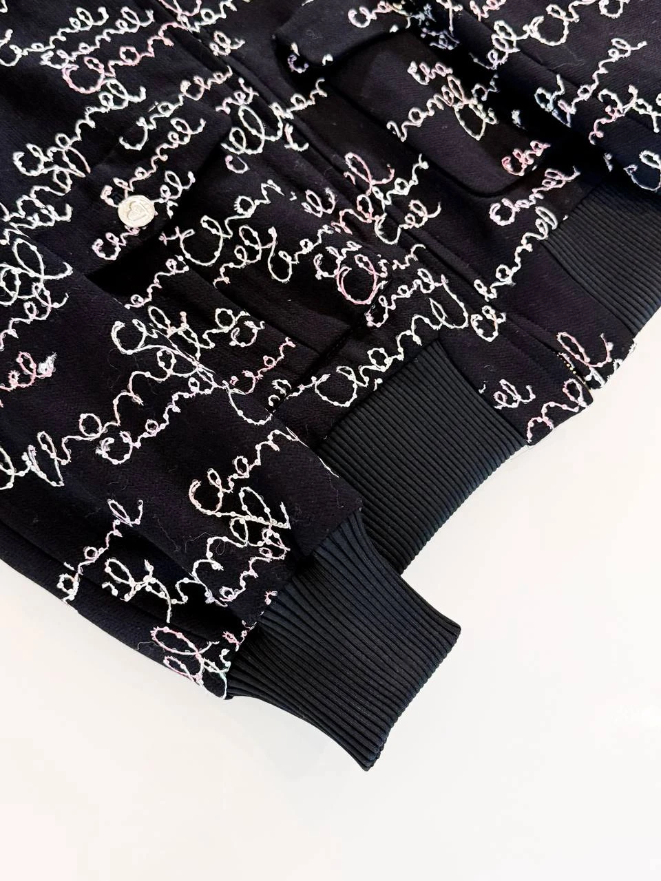 Женская куртка CHANEL — воплощение современного люксового стиля с фирменной утончённостью бренда. Лаконичный черный фон гармонично дополнен роскошной вышивкой, где имя CHANEL повторяется изящным каллиграфическим почерком по всей поверхности ткани, создавая динамичный, необычный визуальный эффект. Материал куртки плотный, хорошо держит форму, а прямой слегка приталенный крой делает модель универсальной: она подойдет для строгого делового образа, городских прогулок и стильных встреч.