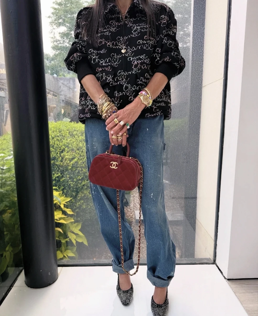 Особое внимание уделено деталям: стильный отложной воротник, декоративные карманы, украшенные фирменной золотистой пуговицей, и центральная молния, скрытая под вышивкой, играют на контрасте с белой блузой с рюшами, идеально сочетающейся с текстурой куртки. Многослойная воздушность блузы добавляет образу романтической нотки, а фирменная монограмма CHANEL вокруг всей поверхности куртки подчеркивает статус и индивидуальность вещи. Такая куртка станет акцентом любого гардероба: с ней удобно создавать яркие casual-образы или стилизовать ее под утончённую классику.