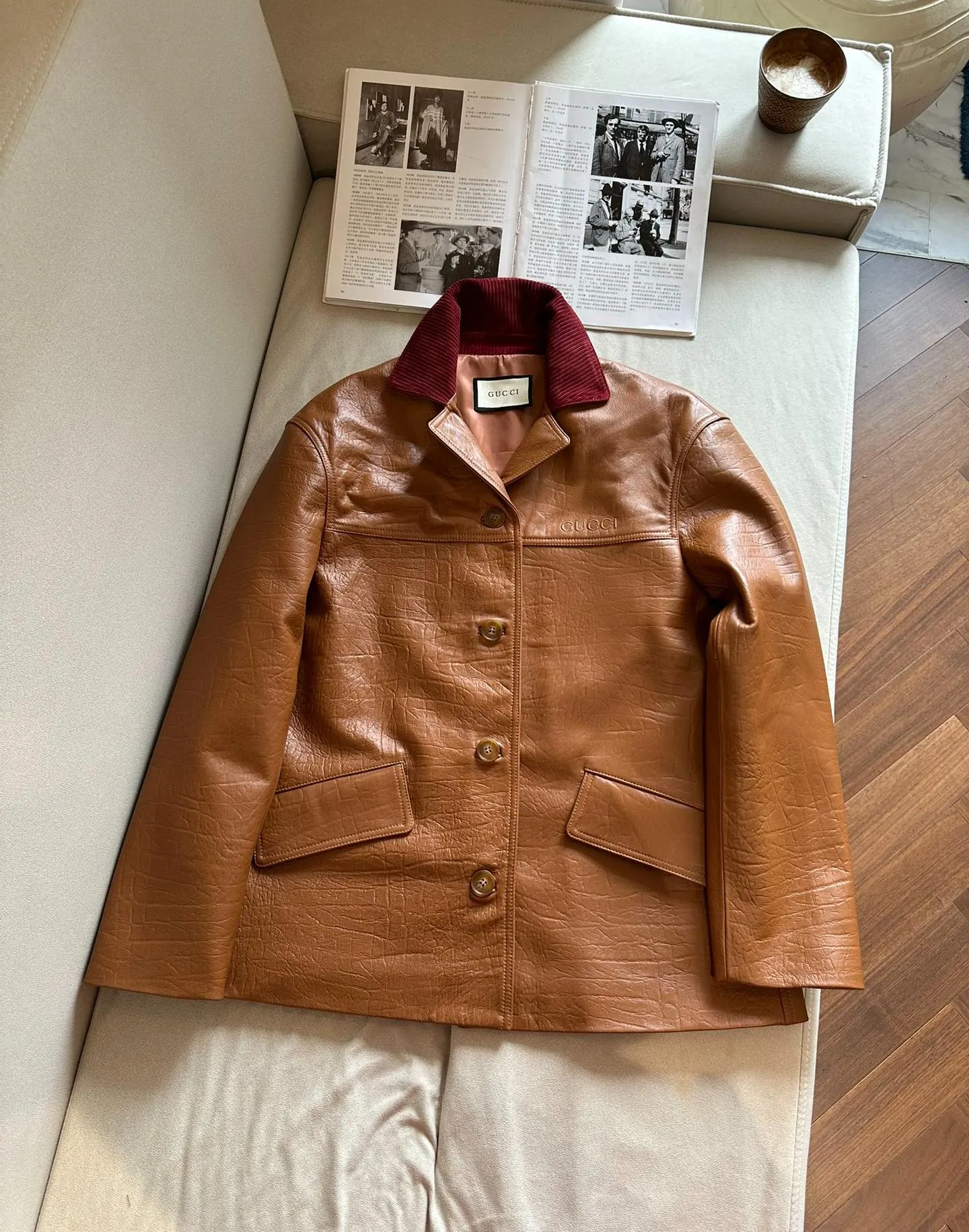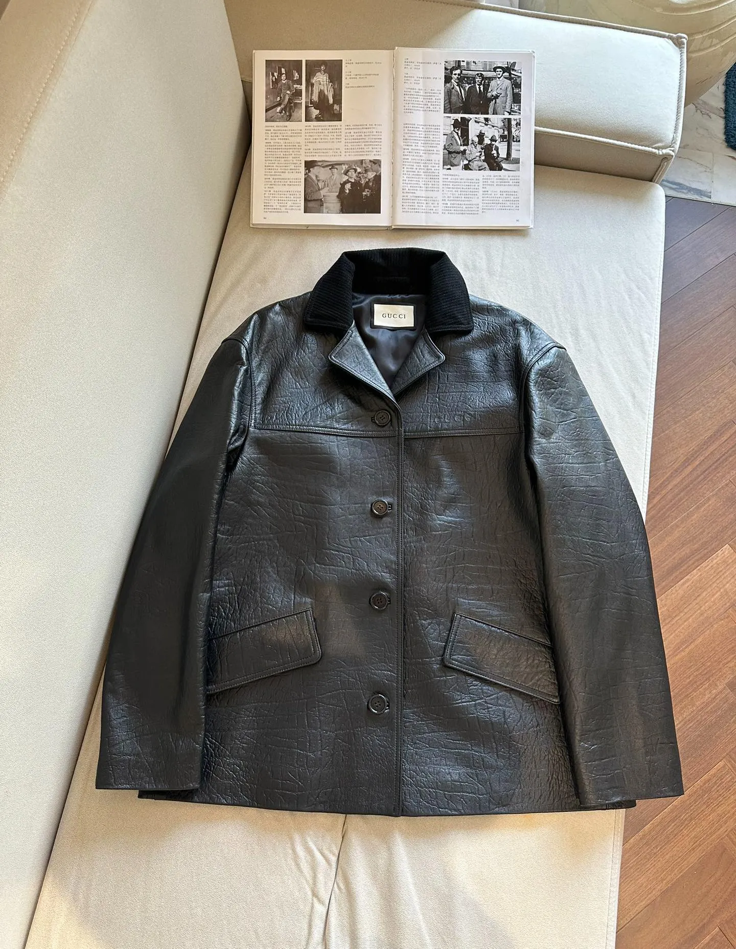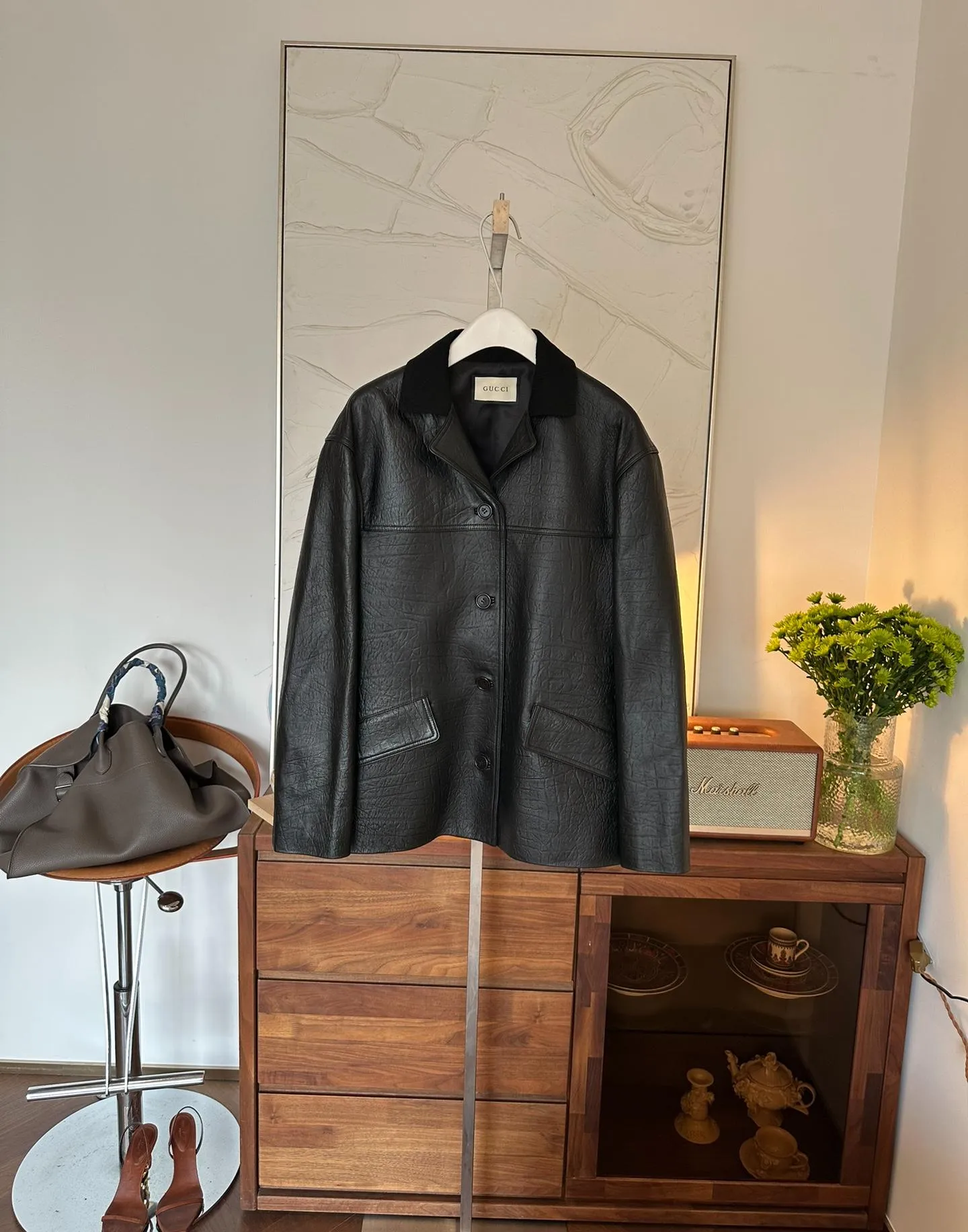 Элегантная женская кожаная куртка от GUCCI, выполненная из высококачественной овчины, сочетает в себе утонченность и современный стиль.