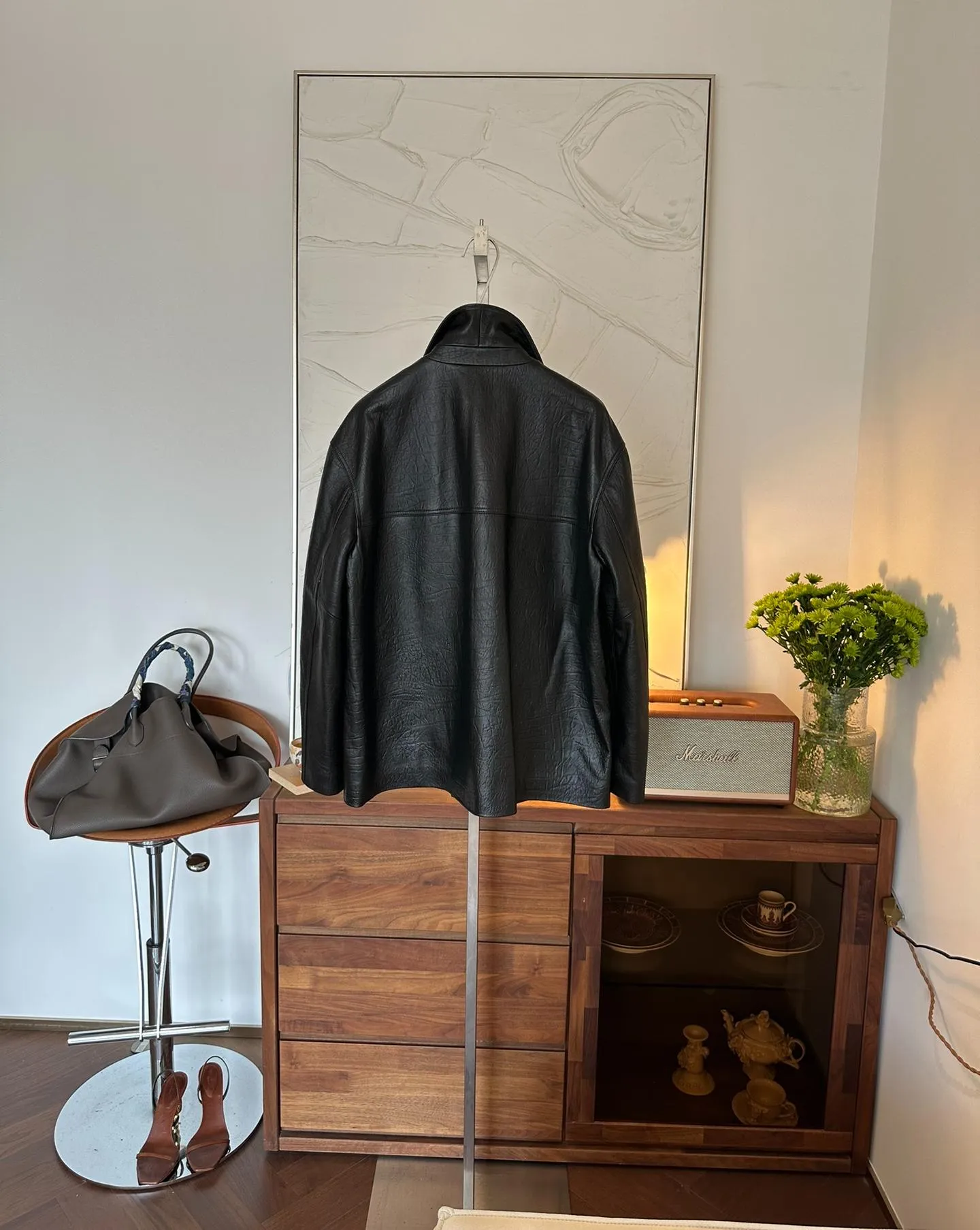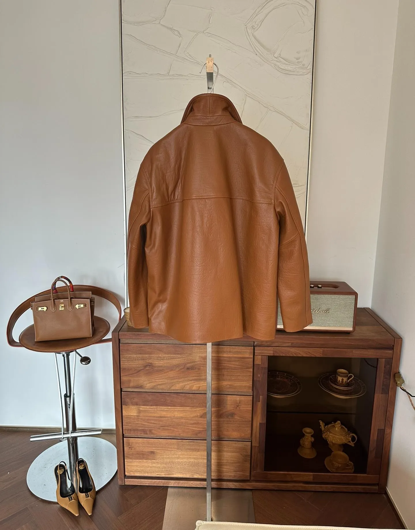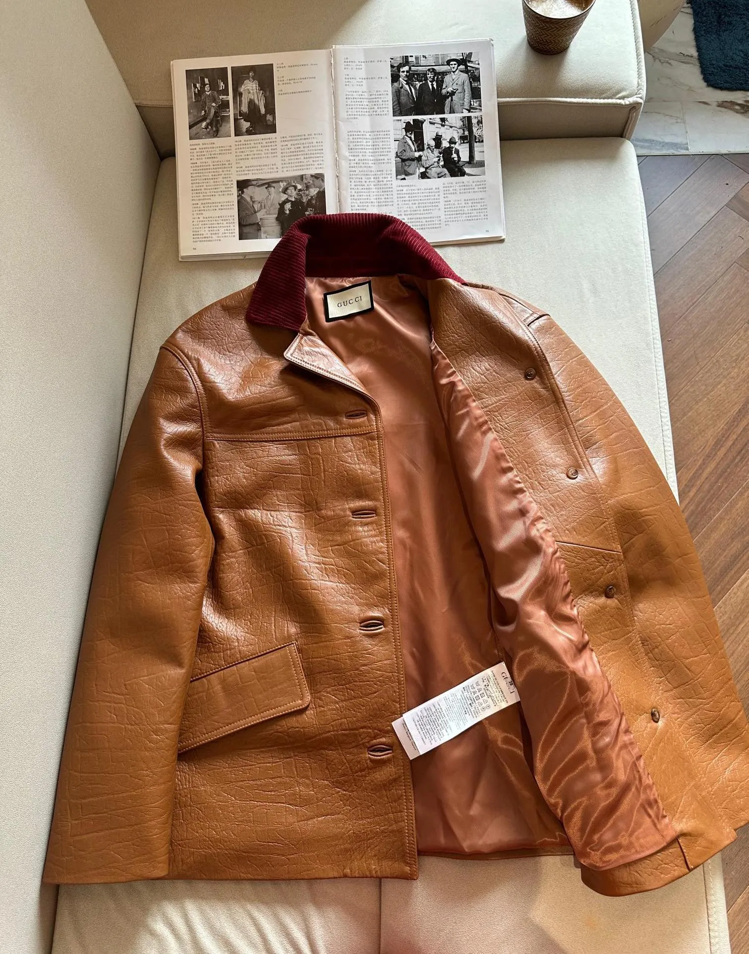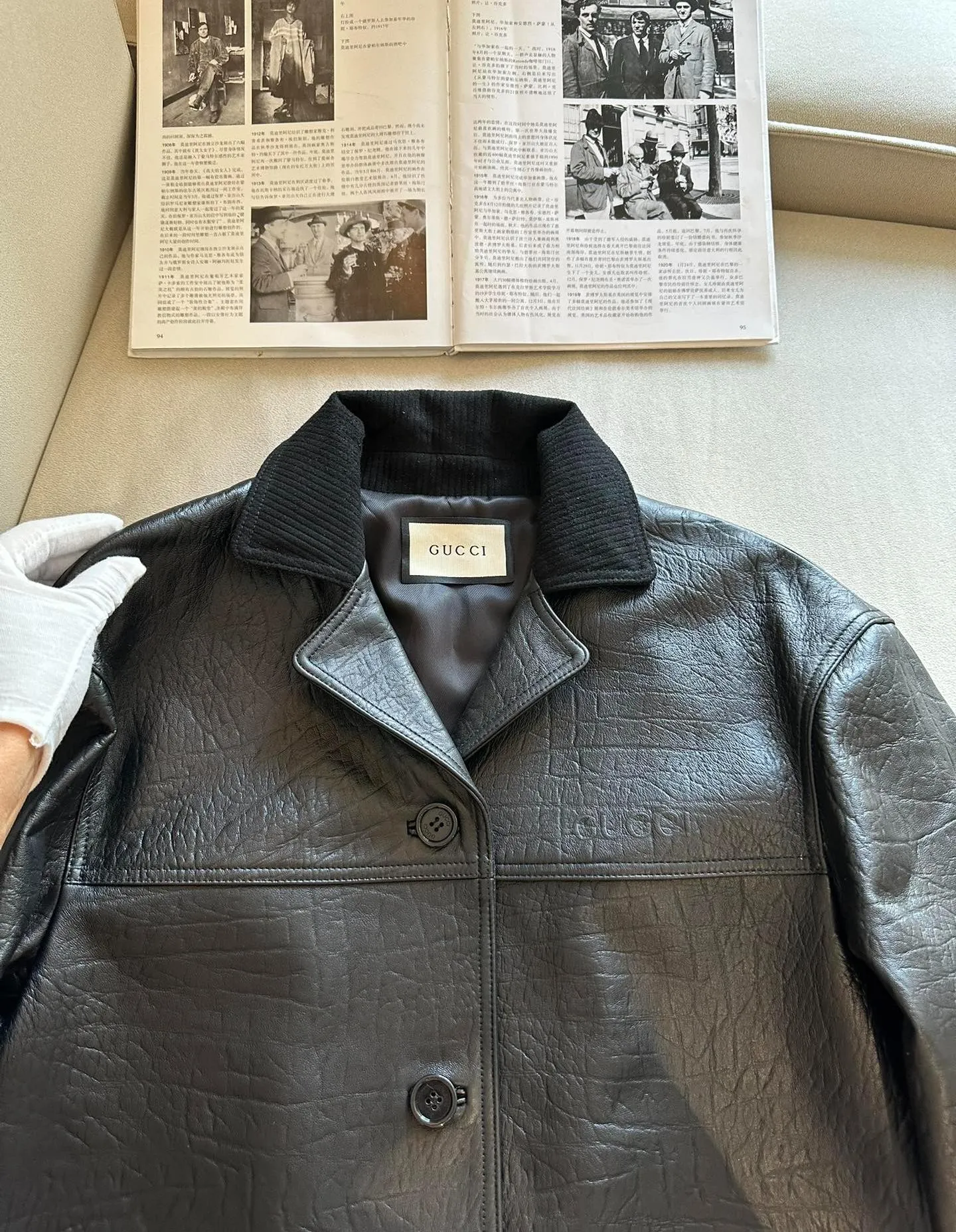Элегантная женская кожаная куртка от GUCCI, выполненная из высококачественной овчины, сочетает в себе утонченность и современный стиль.