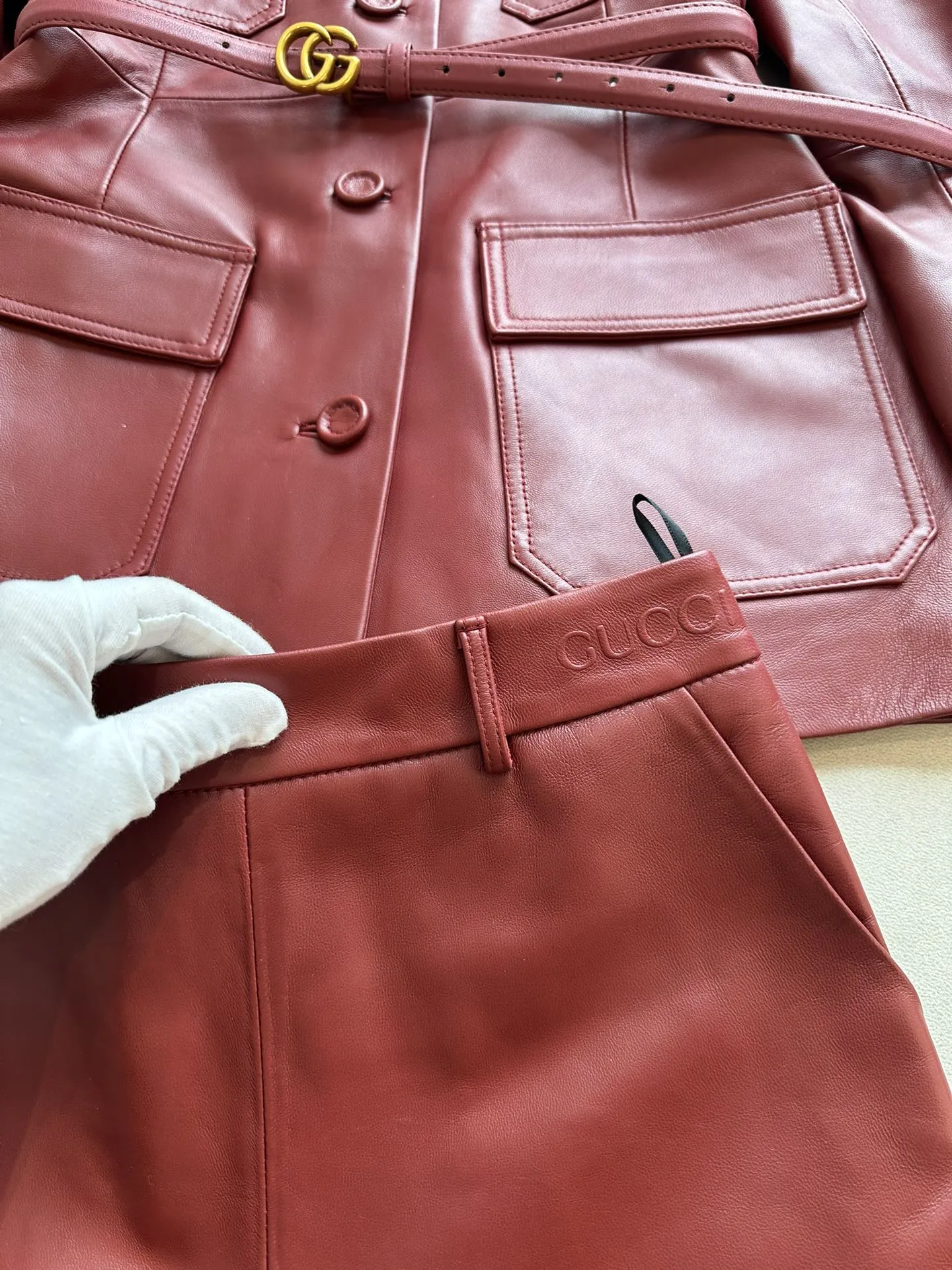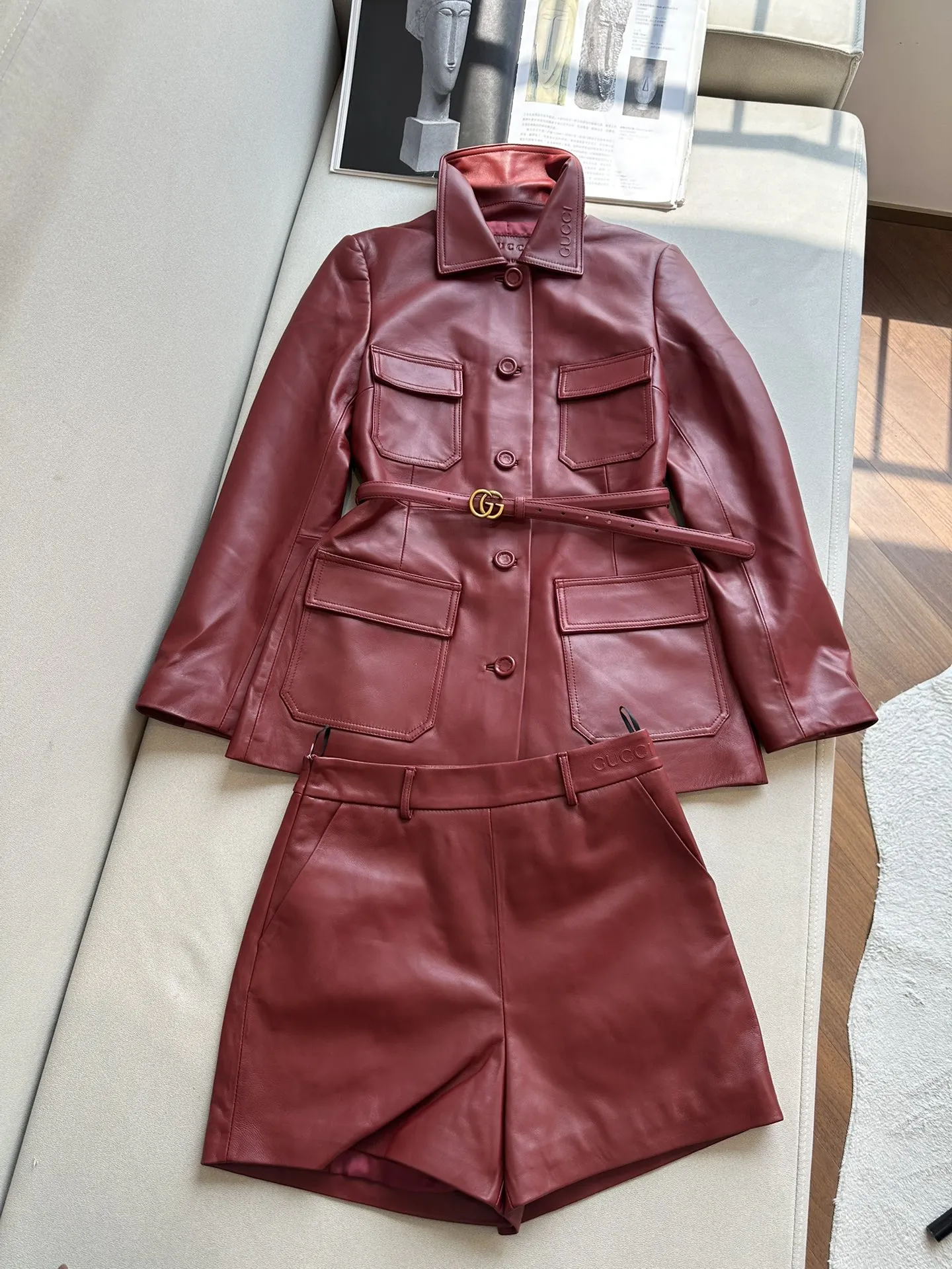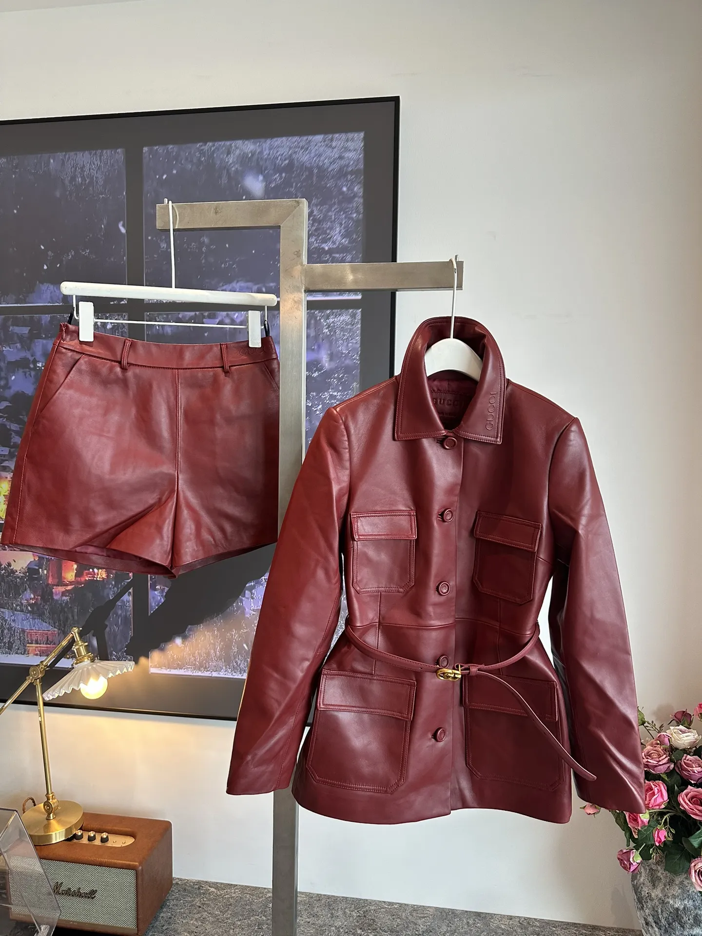 Элегантный женский кожаный костюм от Gucci, выполненный из высококачественной овчины, воплощает утонченность и современный стиль. Комплект состоит из стильной куртки и шорт, выполненных в насыщенном бордовом оттенке, который добавляет образу глубину и роскошь.