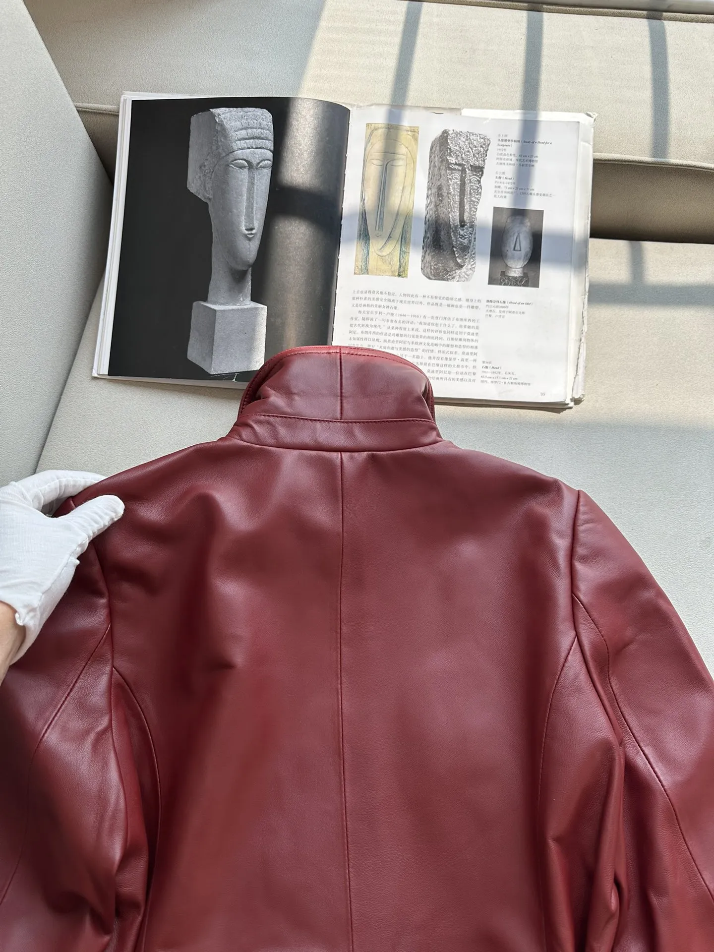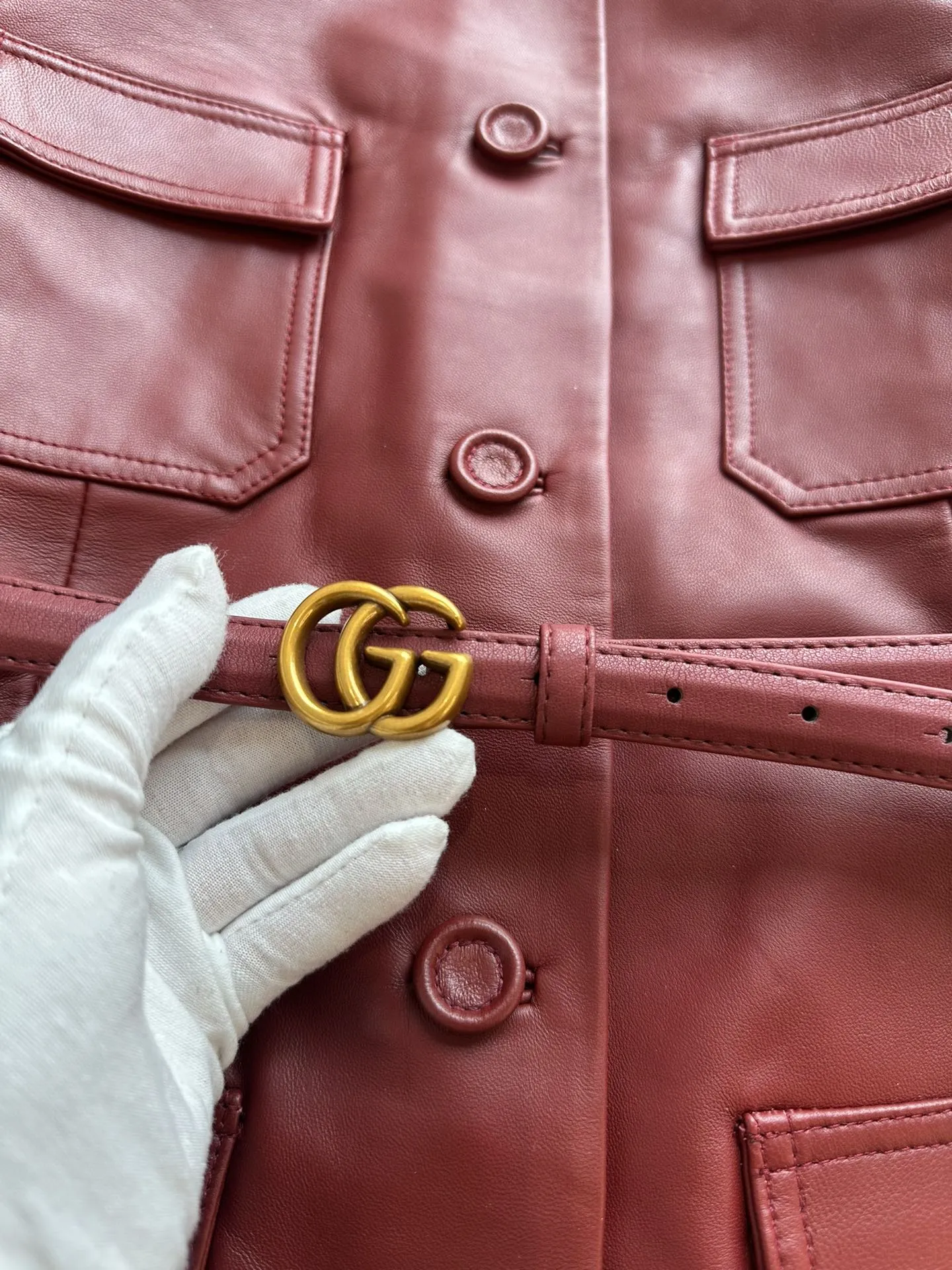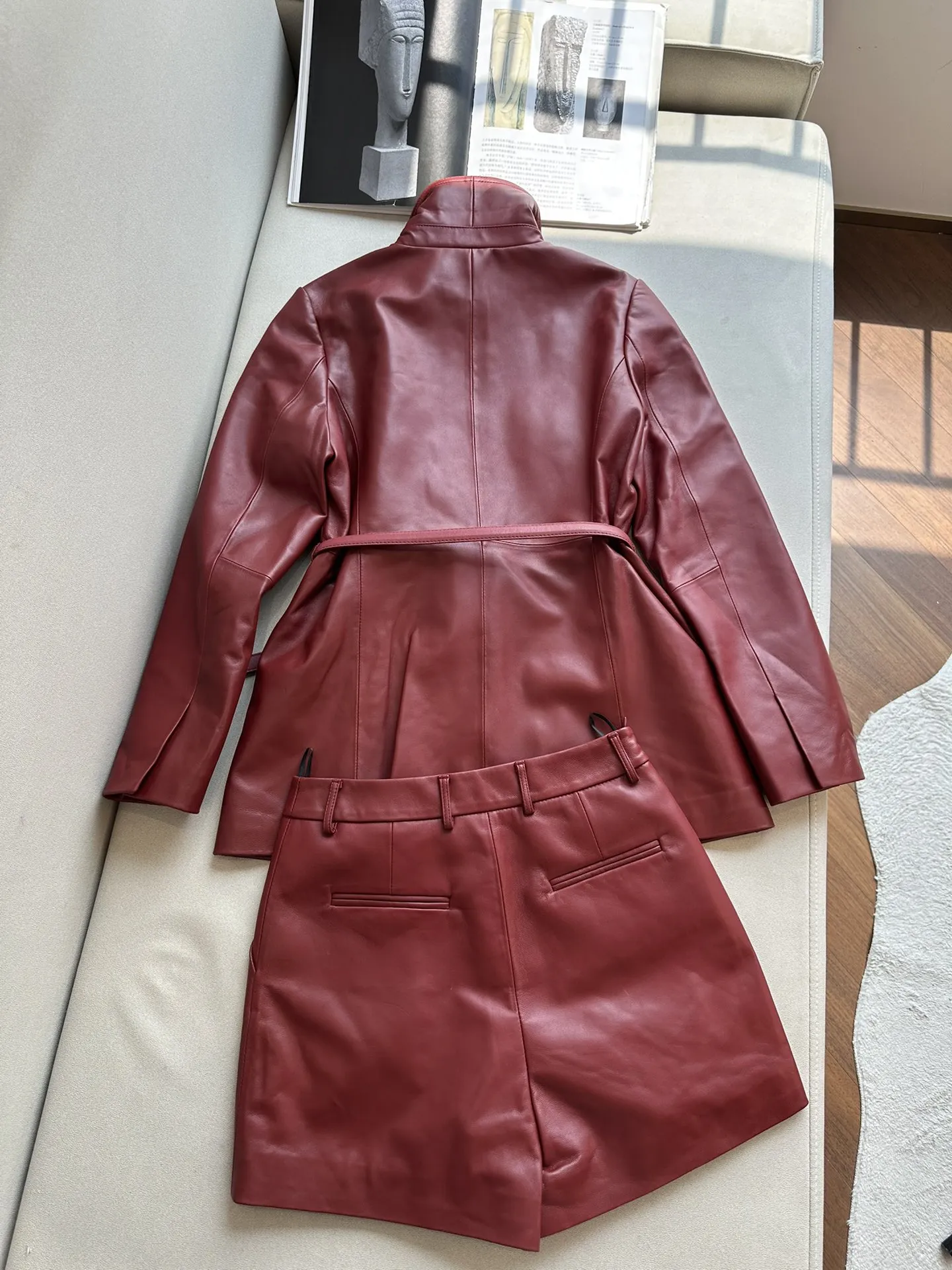 Элегантный женский кожаный костюм от Gucci, выполненный из высококачественной овчины, воплощает утонченность и современный стиль. Комплект состоит из стильной куртки и шорт, выполненных в насыщенном бордовом оттенке, который добавляет образу глубину и роскошь.