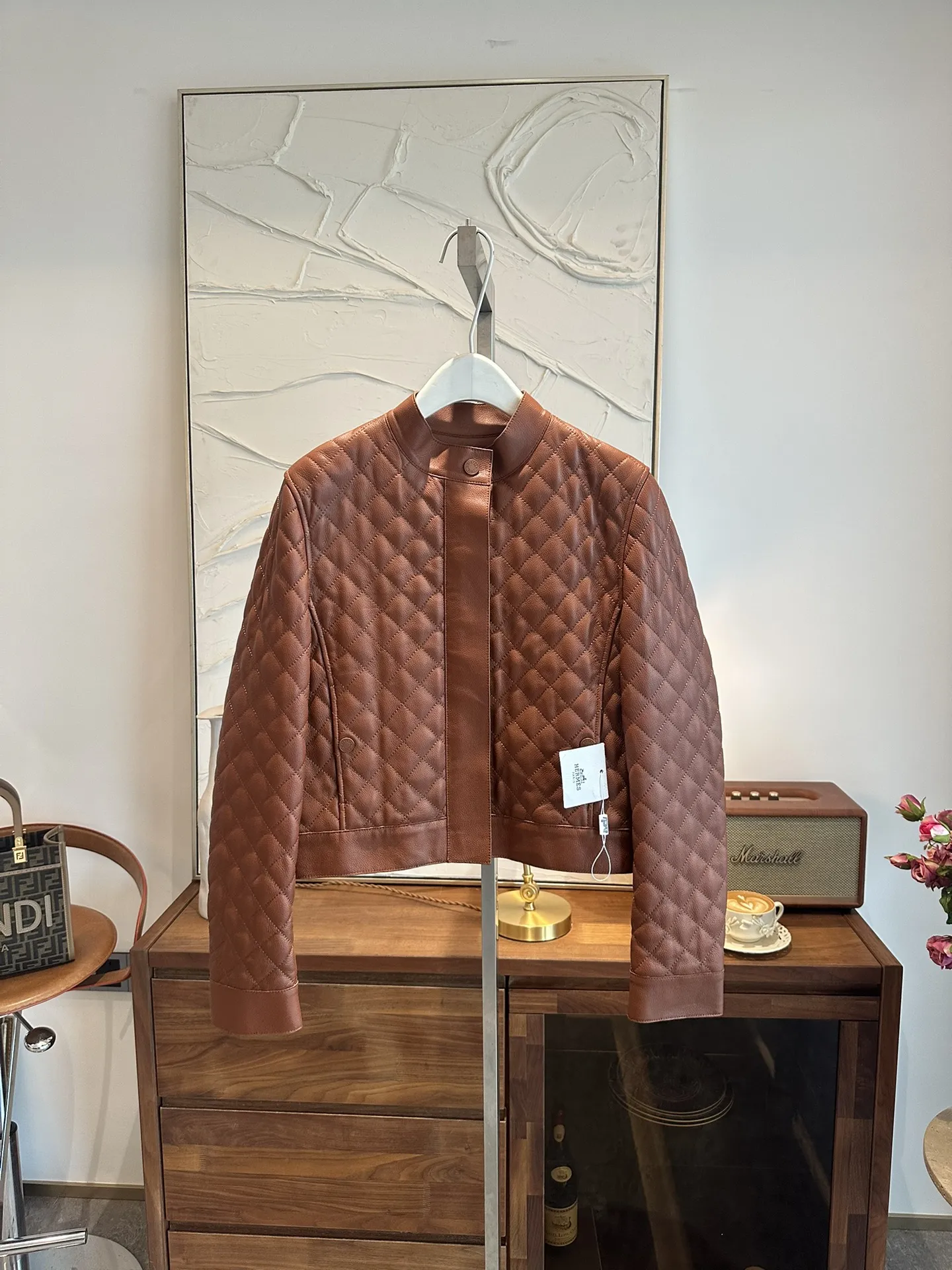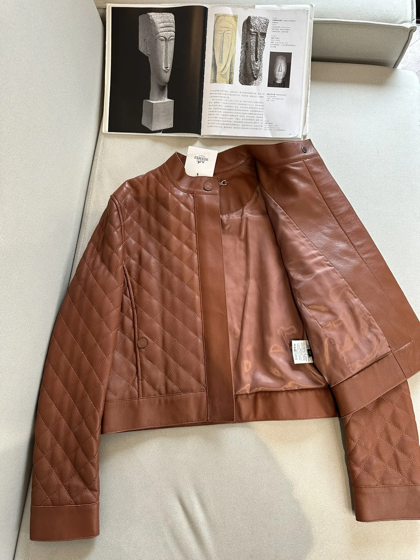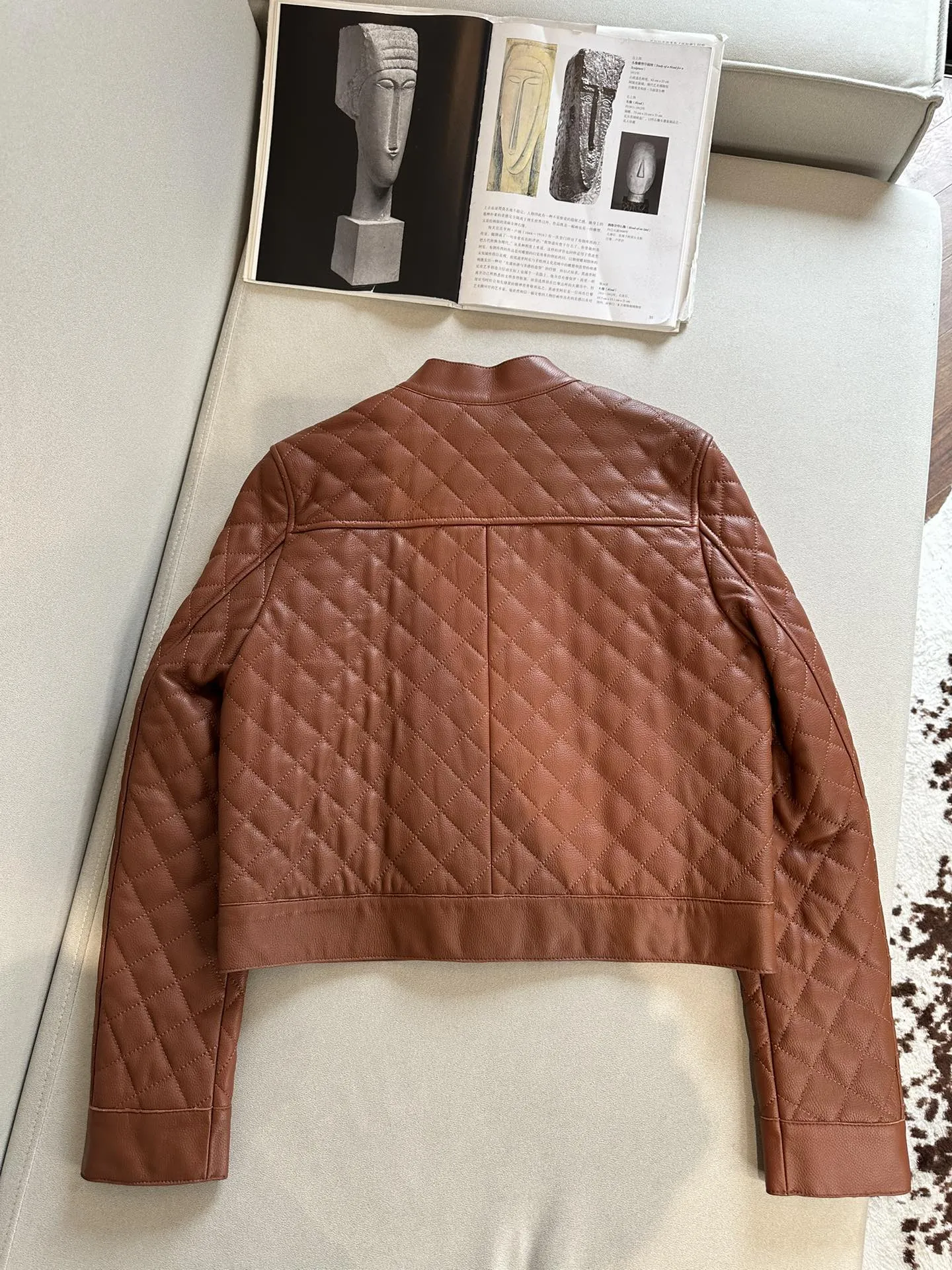 Женская кожаная куртка от Hermes выполнена из высококачественной коровьей кожи, что обеспечивает ей долговечность и элегантный внешний вид. Куртка отличается изысканным дизайном с ромбовидной стежкой, которая придаёт изделию текстурированную глубину и утончённость.