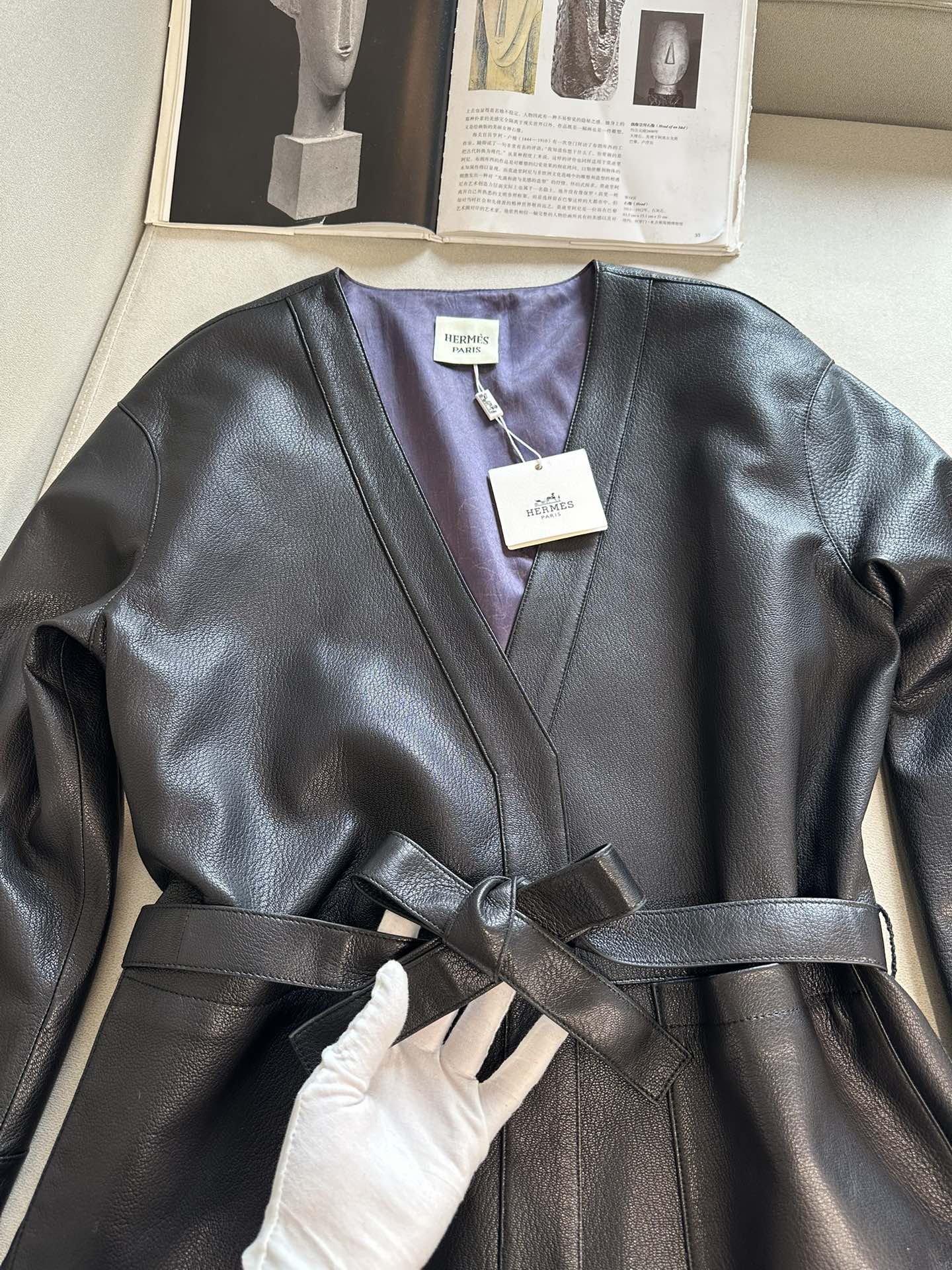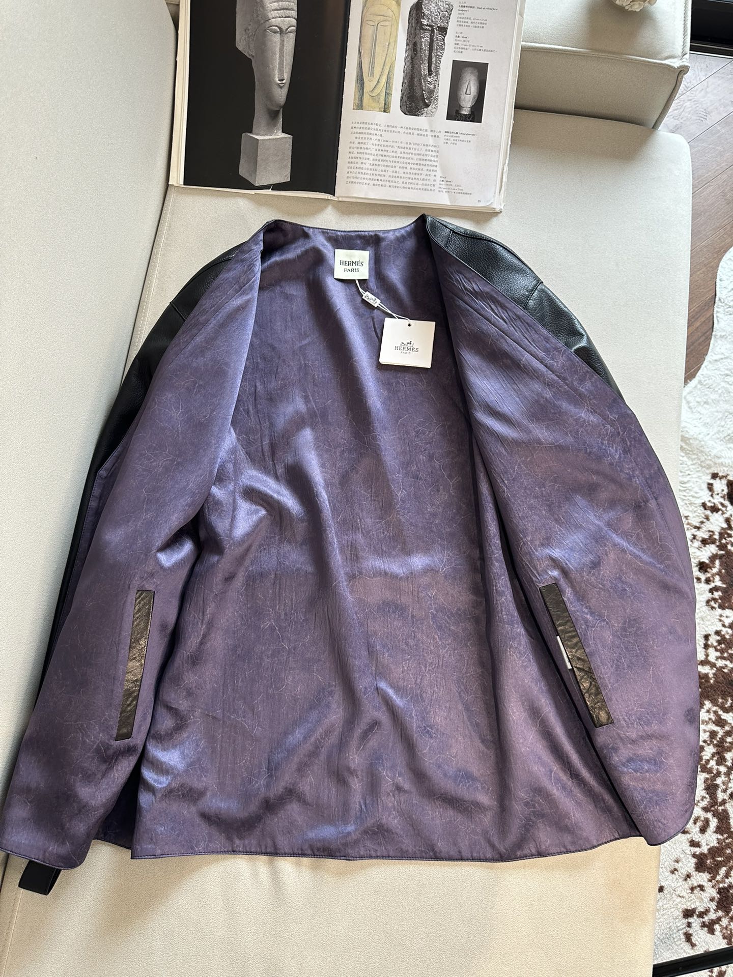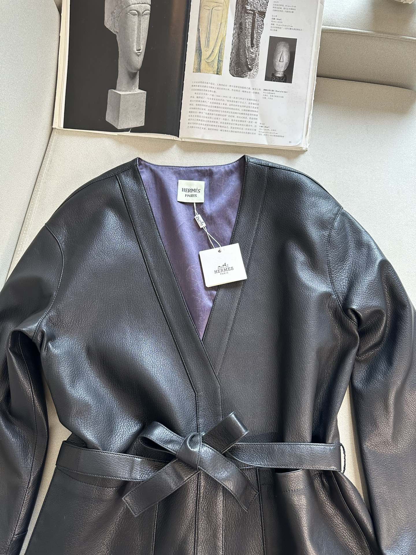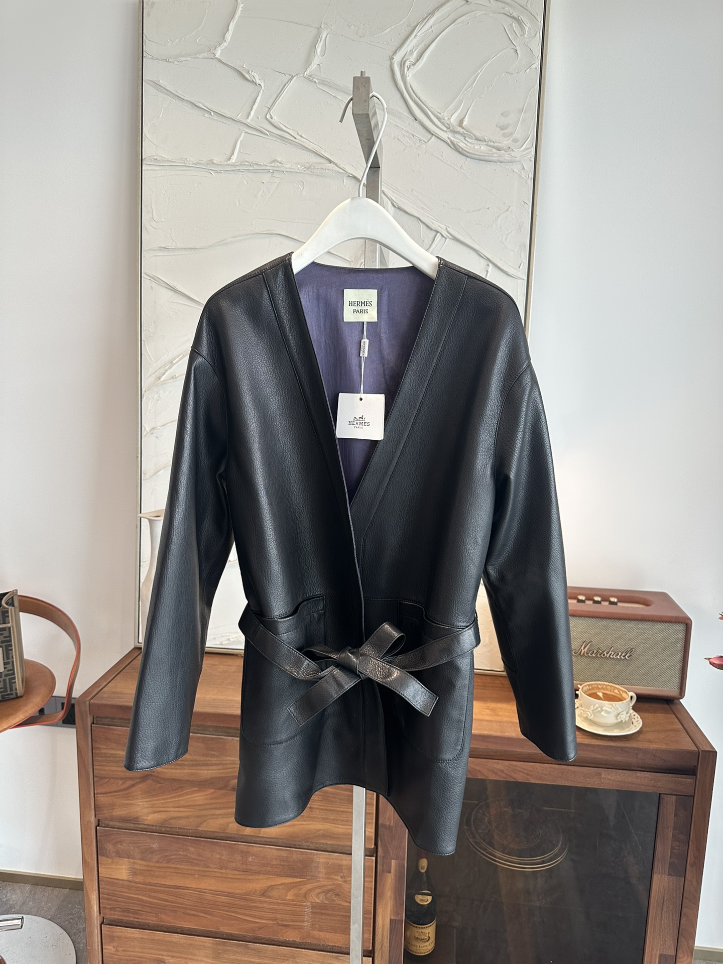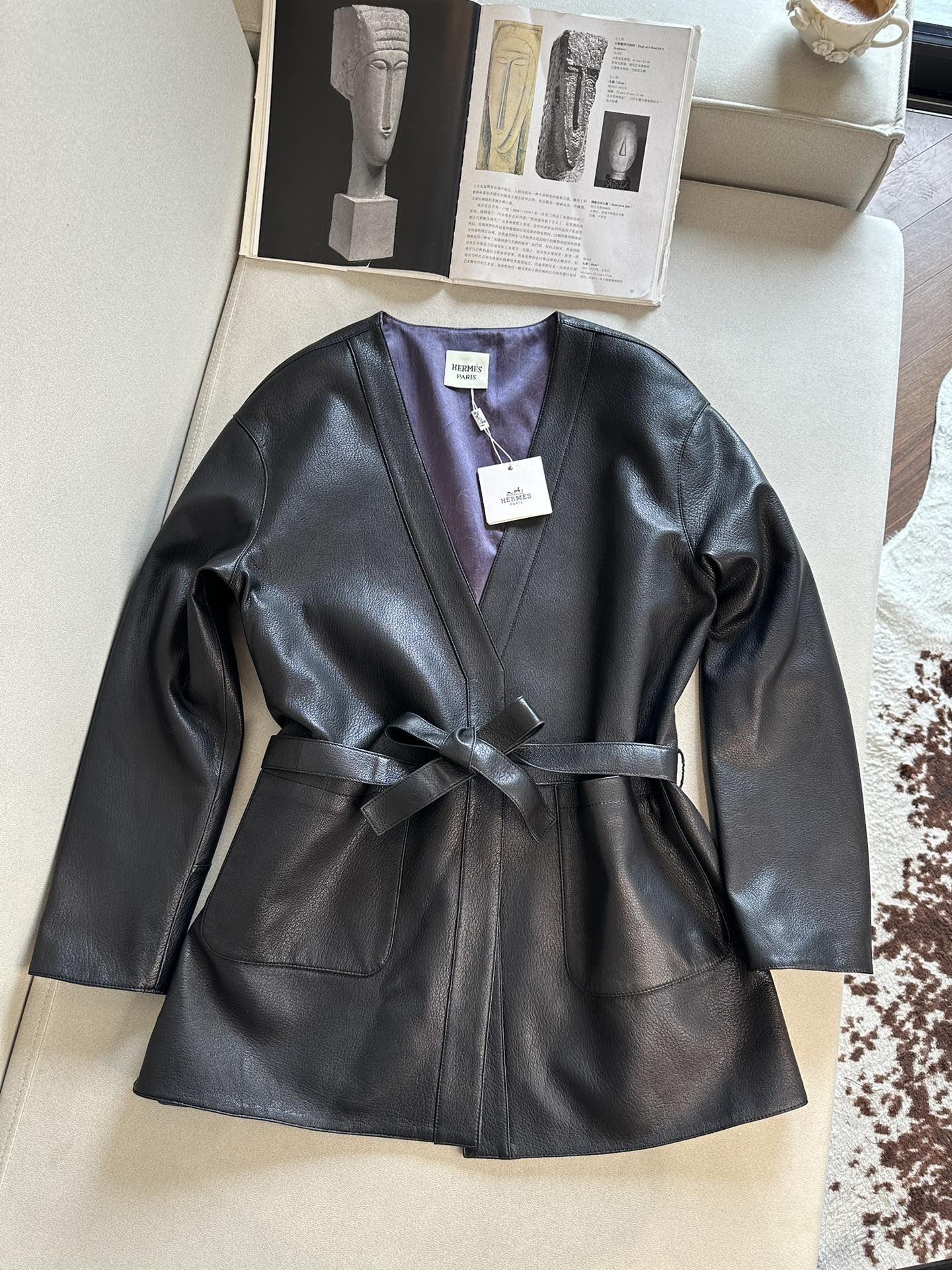 Женская кожаная куртка от Hermes выполнена из высококачественной коровьей кожи, что обеспечивает ей долговечность и элегантный внешний вид. Куртка представлена в двух классических цветах — черном и коричневом, что позволяет легко сочетать её с различными элементами гардероба.