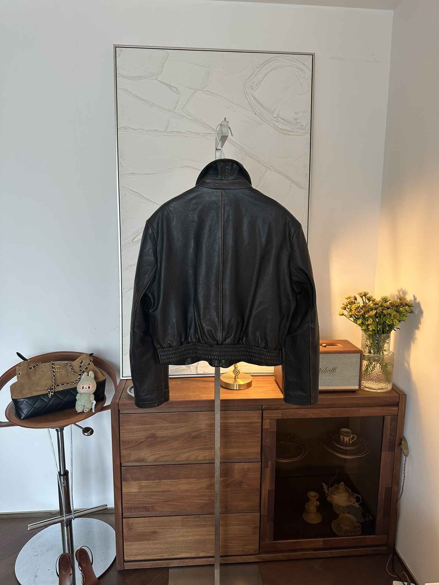 Куртка отличается прямым силуэтом, аккуратным отложным воротником и застёжкой на молнию, скрытую под кожаной планкой. Два боковых прорезных кармана добавляют функциональности и лаконичности.