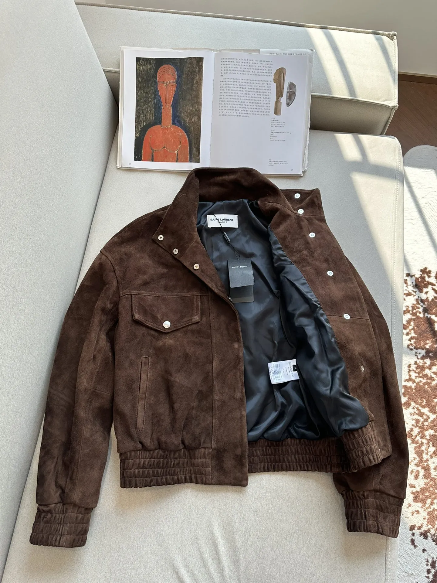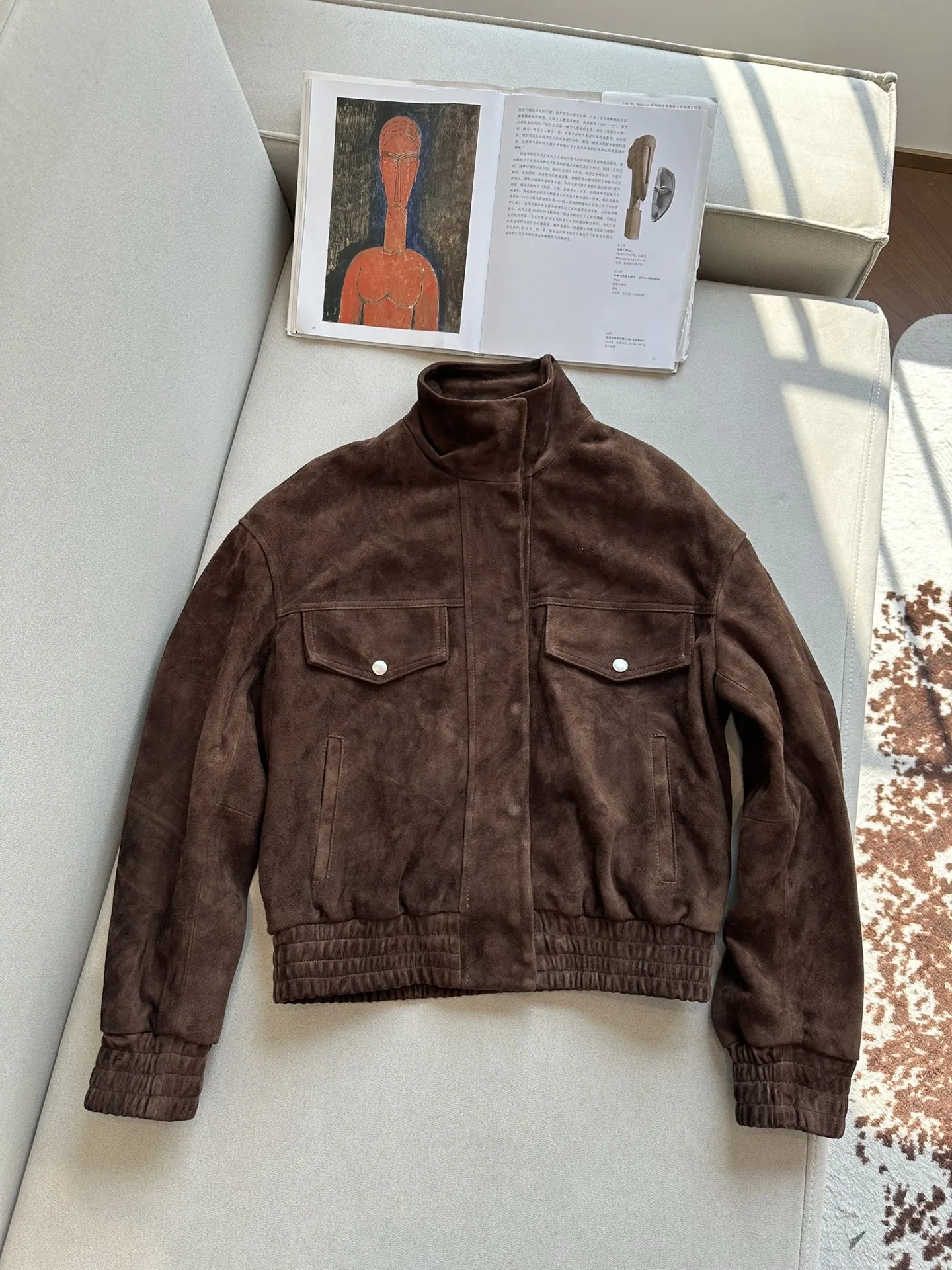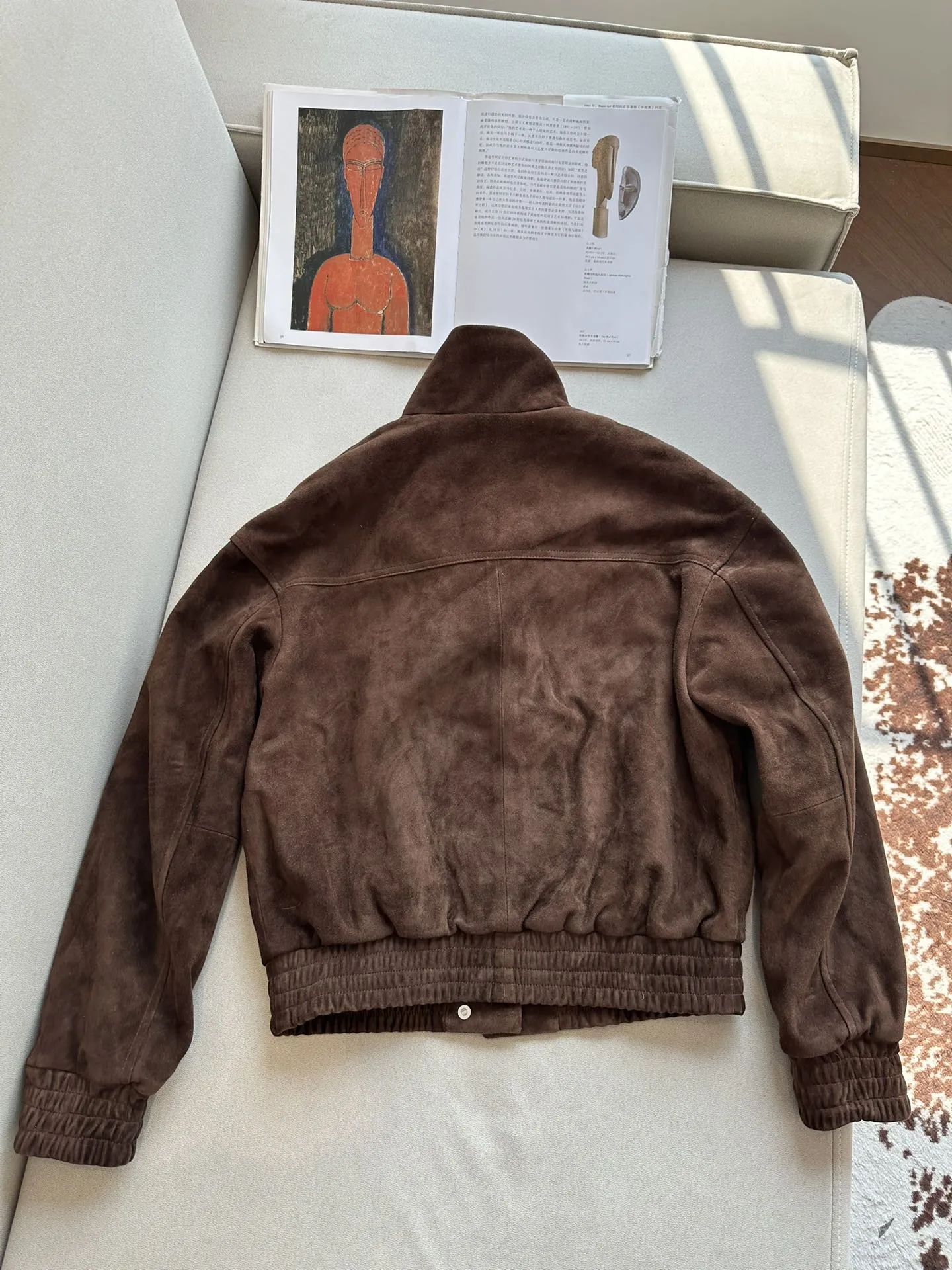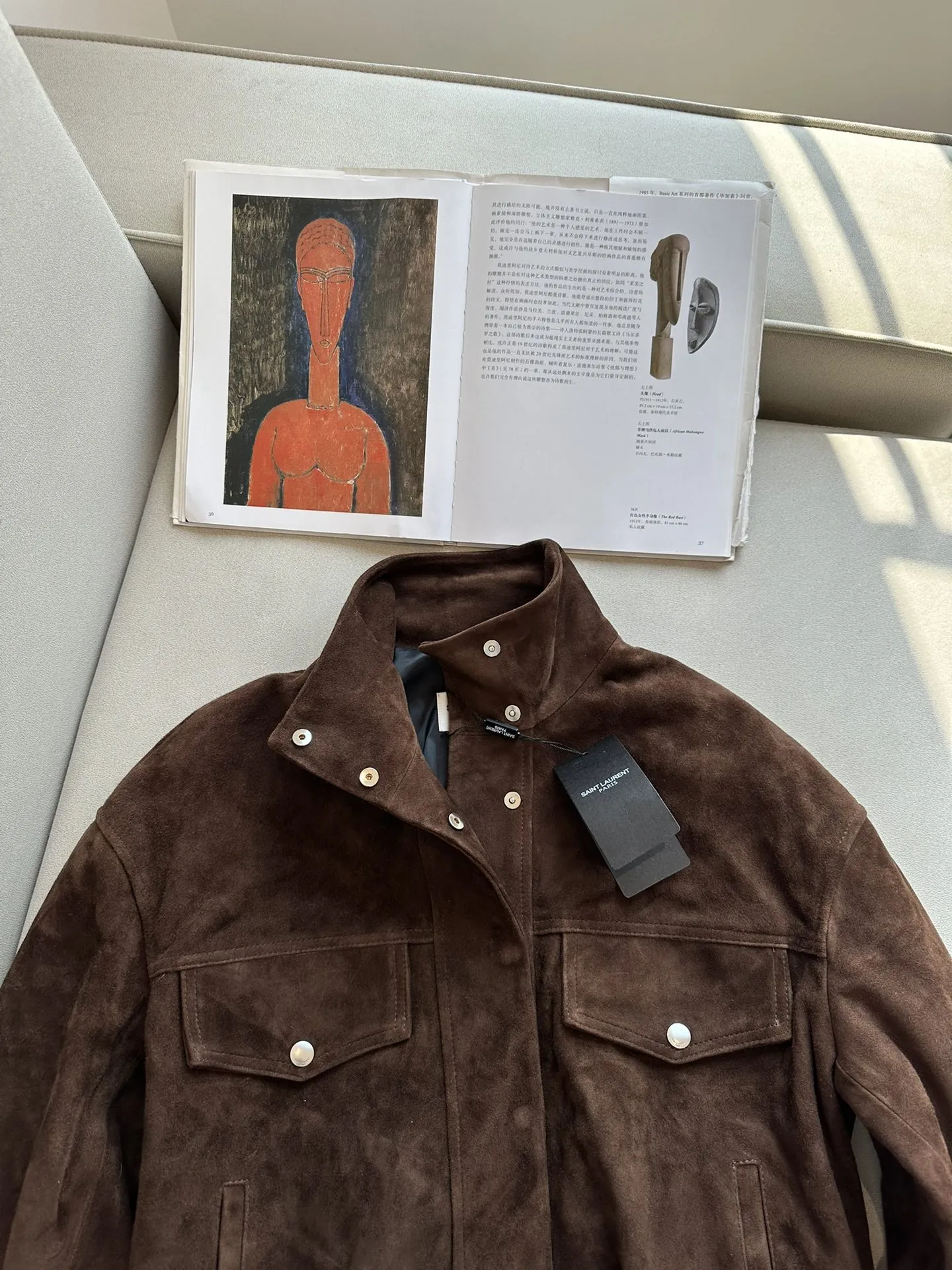 Куртка оснащена удобной молнией по всей длине, классическим отложным воротником и регулируемым кулисным шнурком на поясе, что позволяет подчеркнуть силуэт. Мягкая и бархатистая текстура замши придаёт изделию роскошный вид, а универсальный крой делает его идеальным выбором как для повседневных образов, так и для особых случаев.