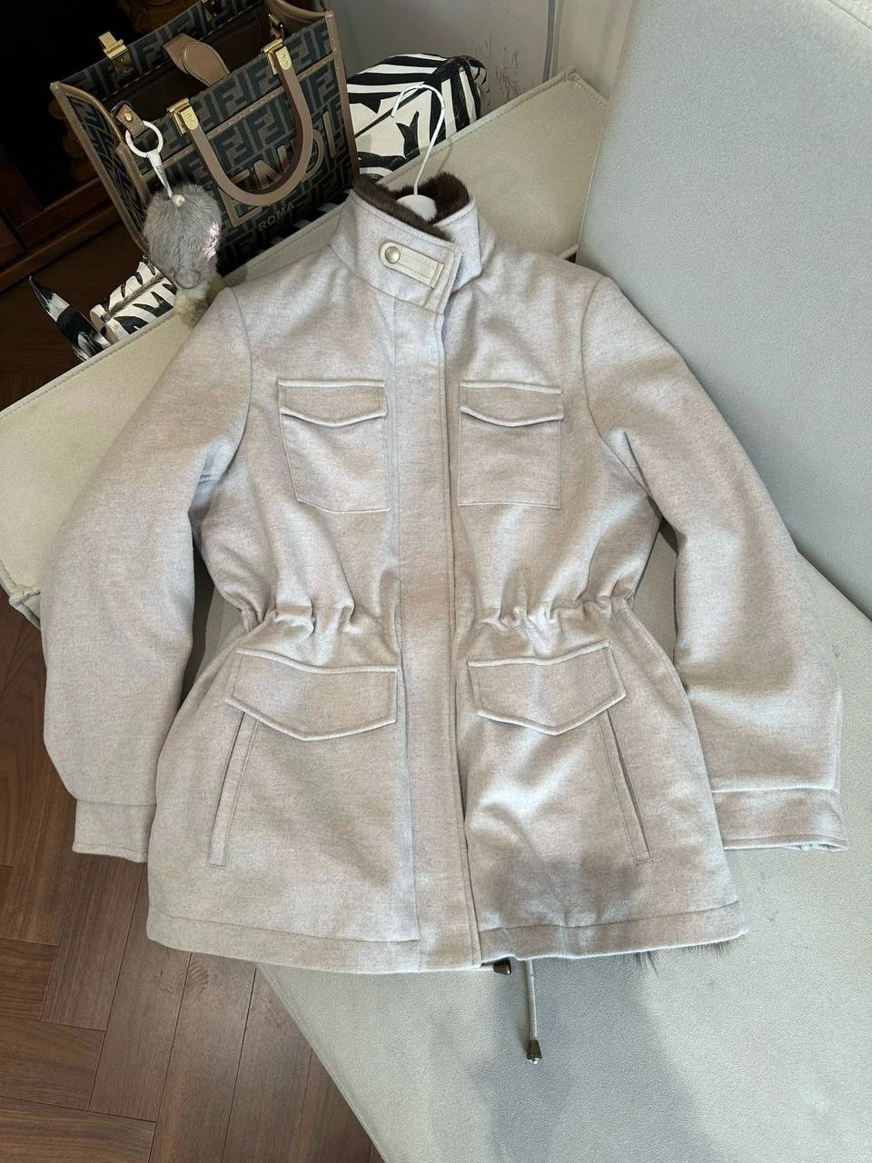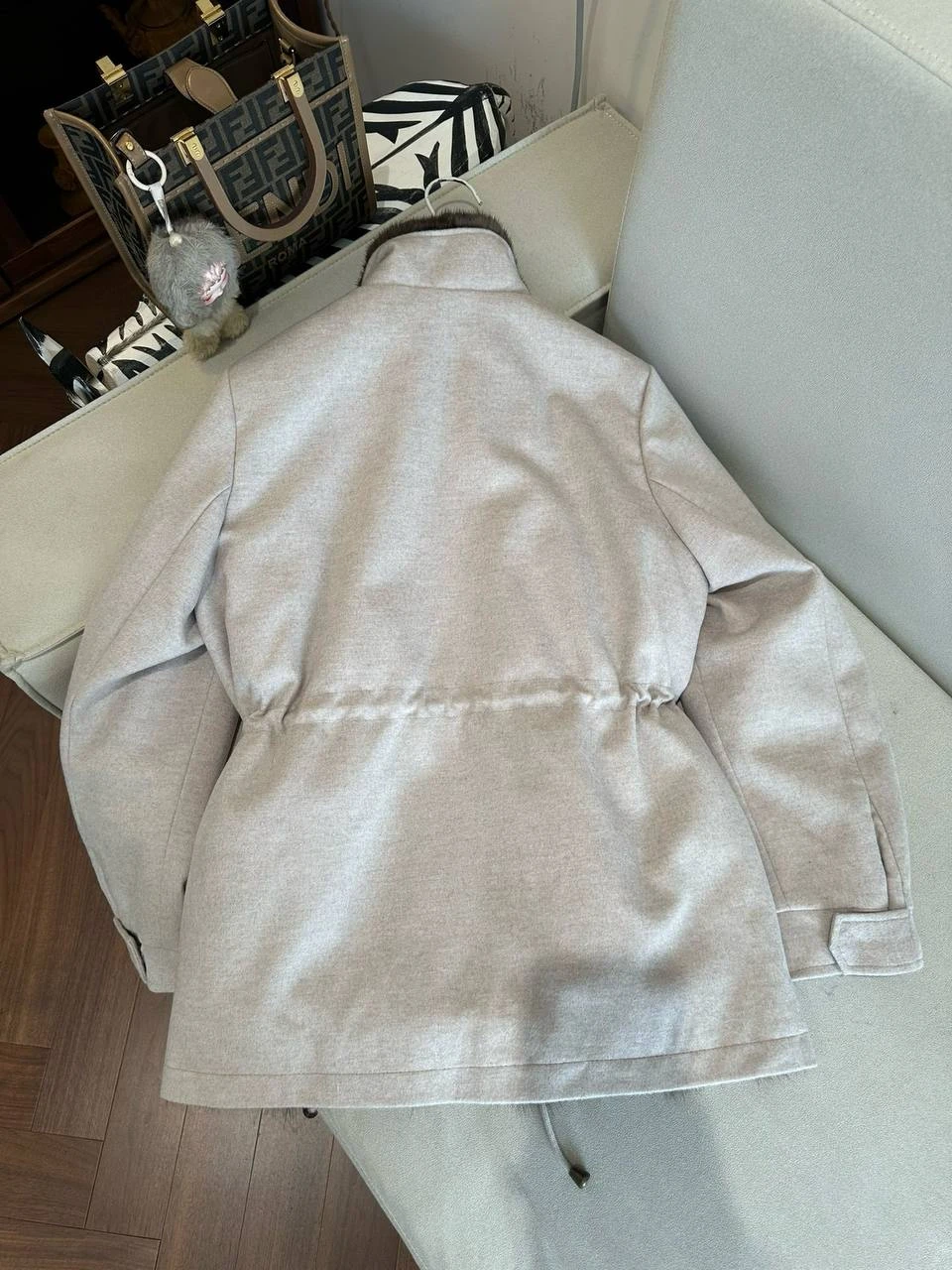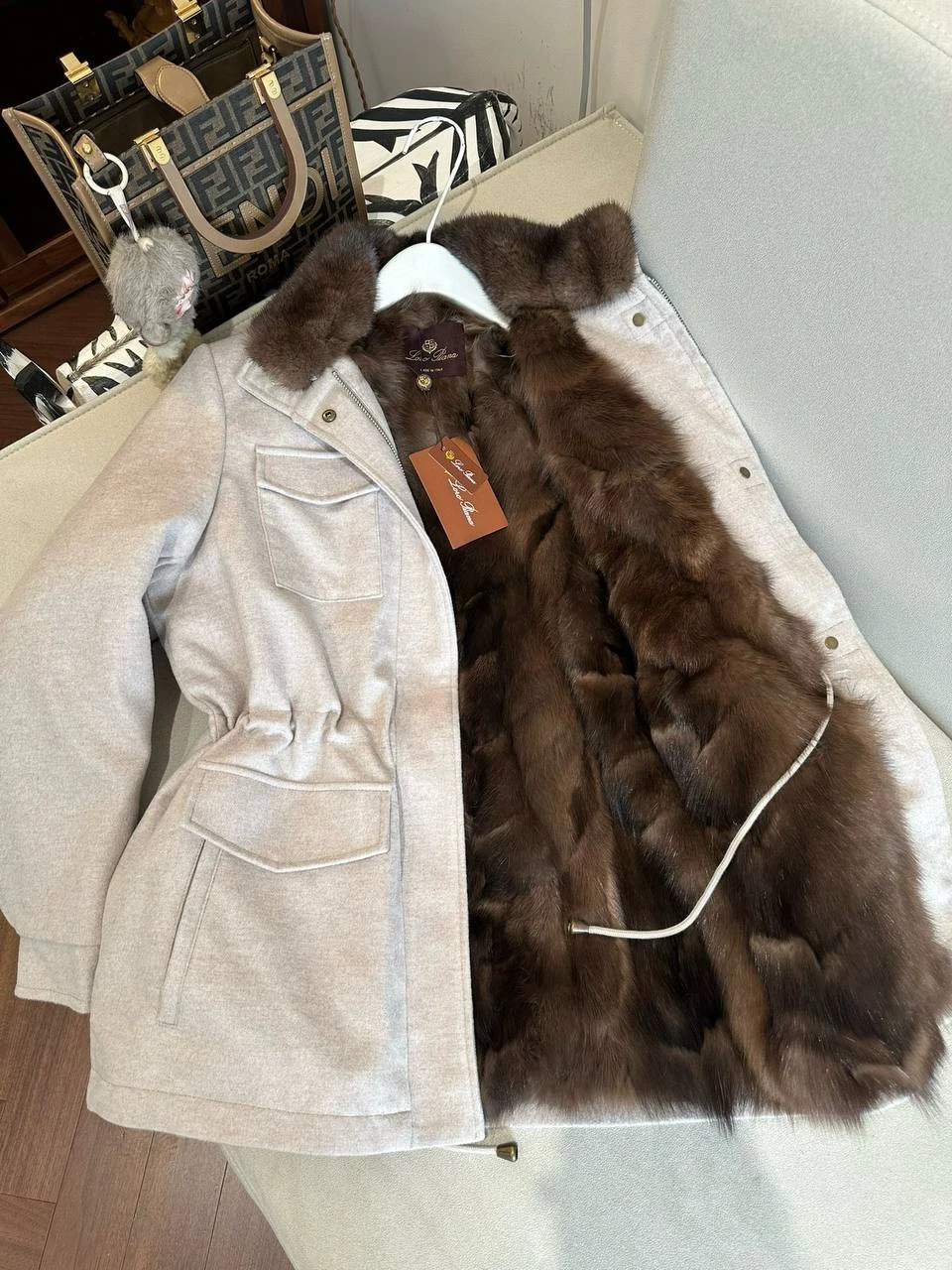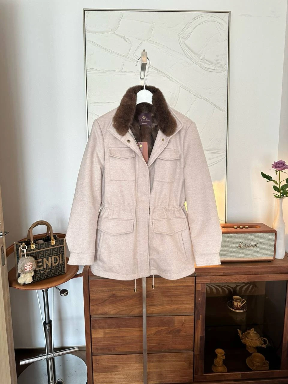 Элегантная и тёплая парка Loro Piana в нежном пудровом оттенке с роскошным меховым воротником и продуманной функциональностью: идеальный выбор для холодных дней в городе и на загородных прогулках.