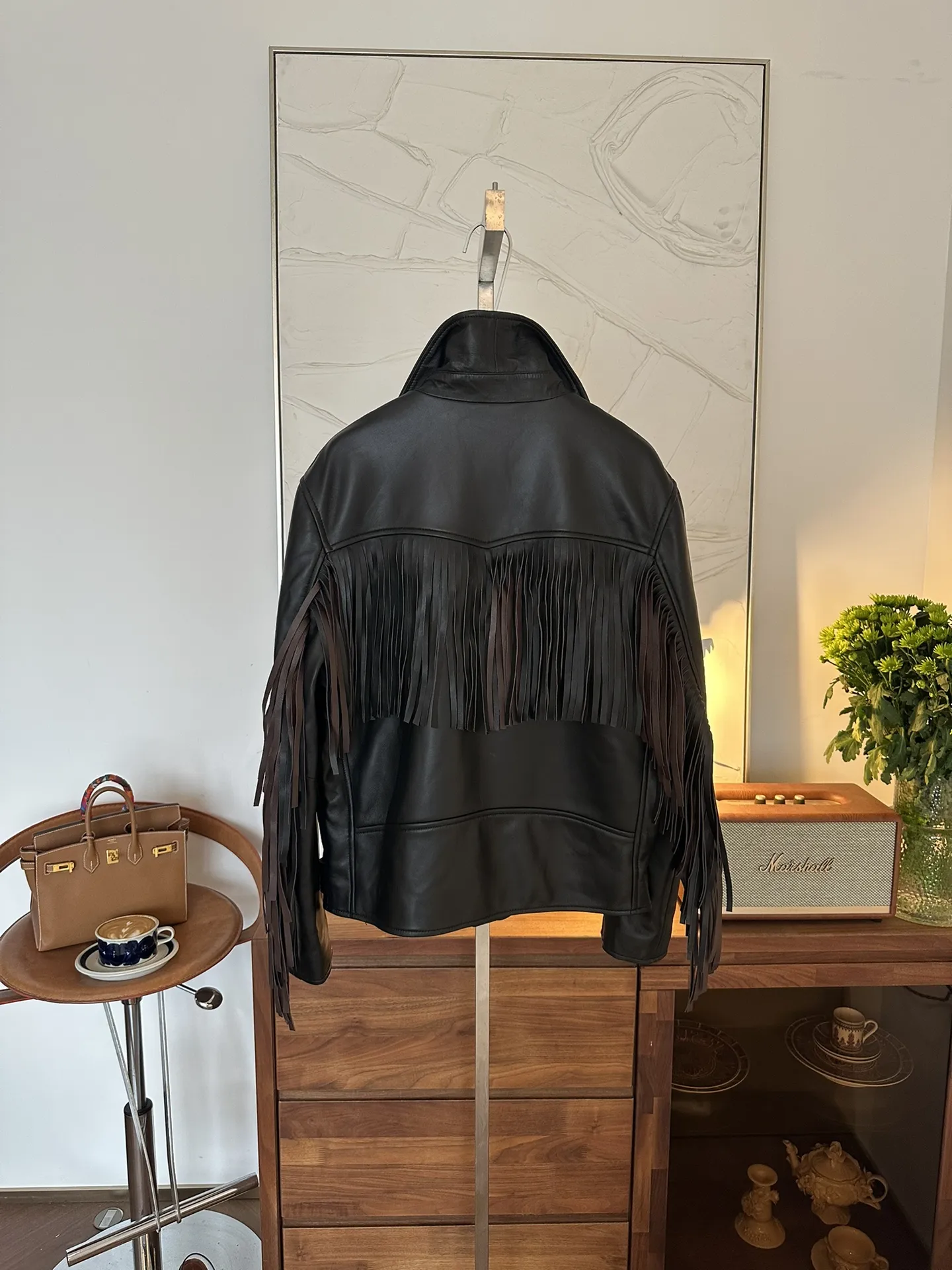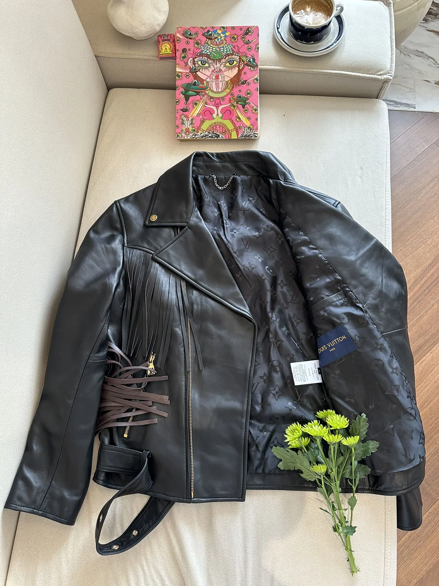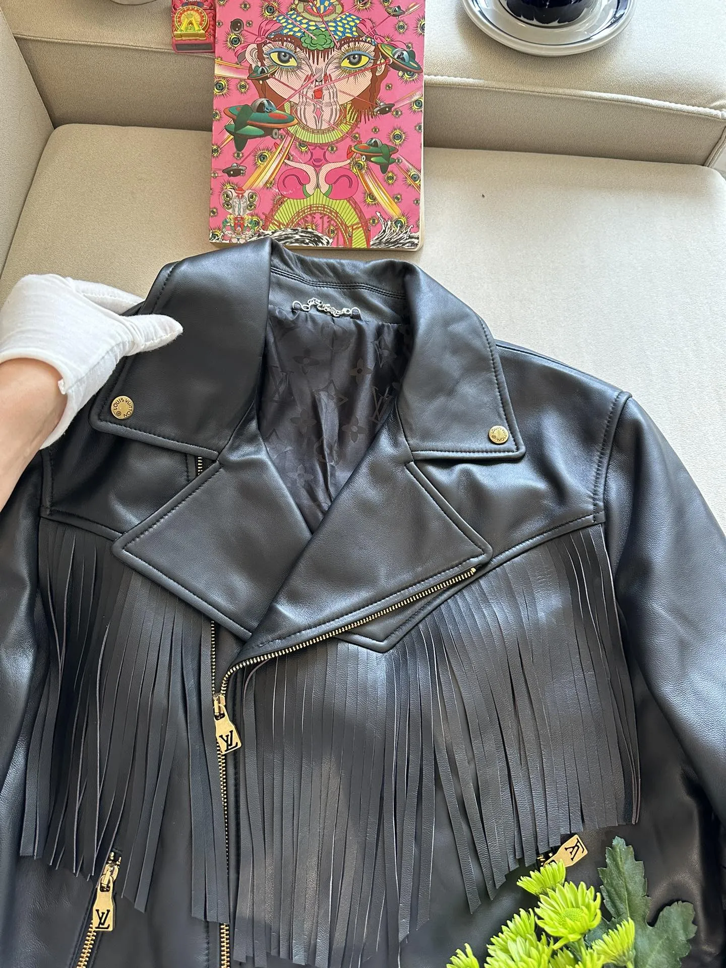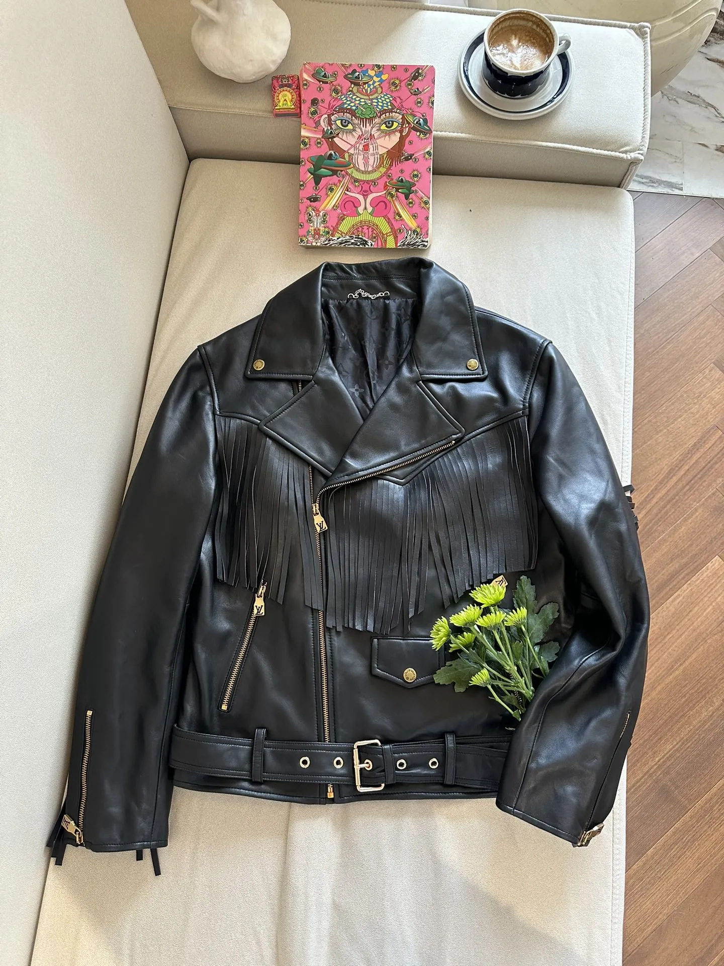 Женская кожаная куртка от Louis Vuitton — воплощение элегантности и дерзкого стиля. Выполненная из высококачественной черной кожи, она сочетает в себе классический крой косухи с изысканными дизайнерскими элементами. Особое внимание привлекают декоративная кожаная бахрома, которая добавляет динамики и уникальности образу.
