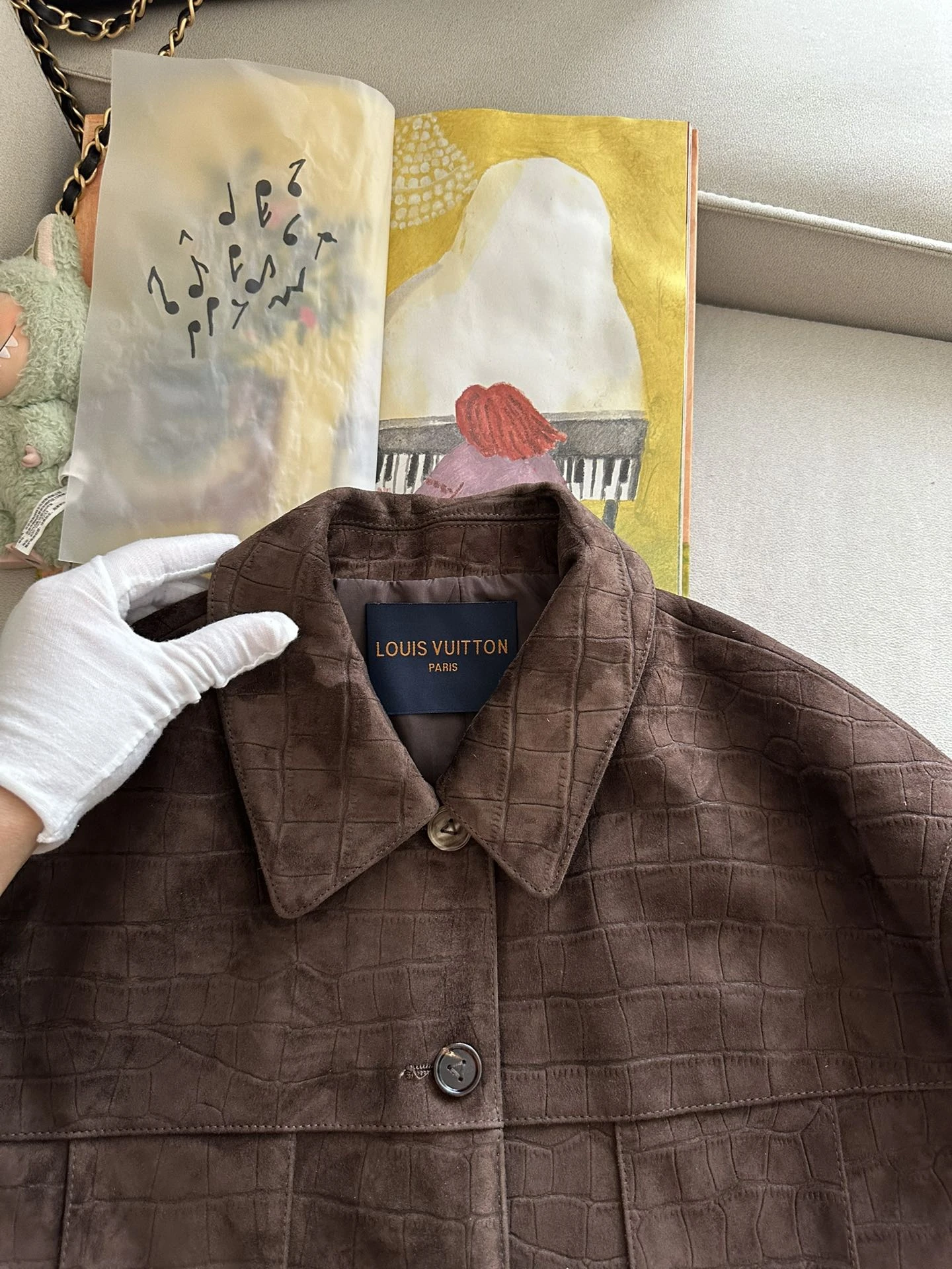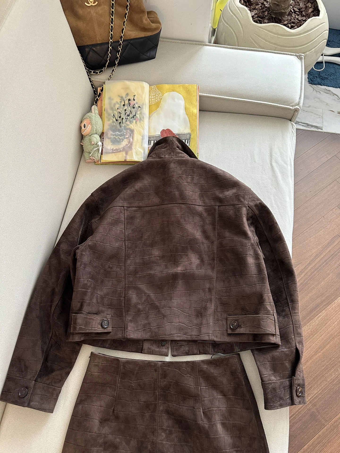 Женский костюм Louis Vuitton из натуральной козьей замши — воплощение утончённого стиля и безупречного качества. Эффектный комплект состоит из укороченного жакета с классическим отложным воротником и мини-юбки прямого кроя.