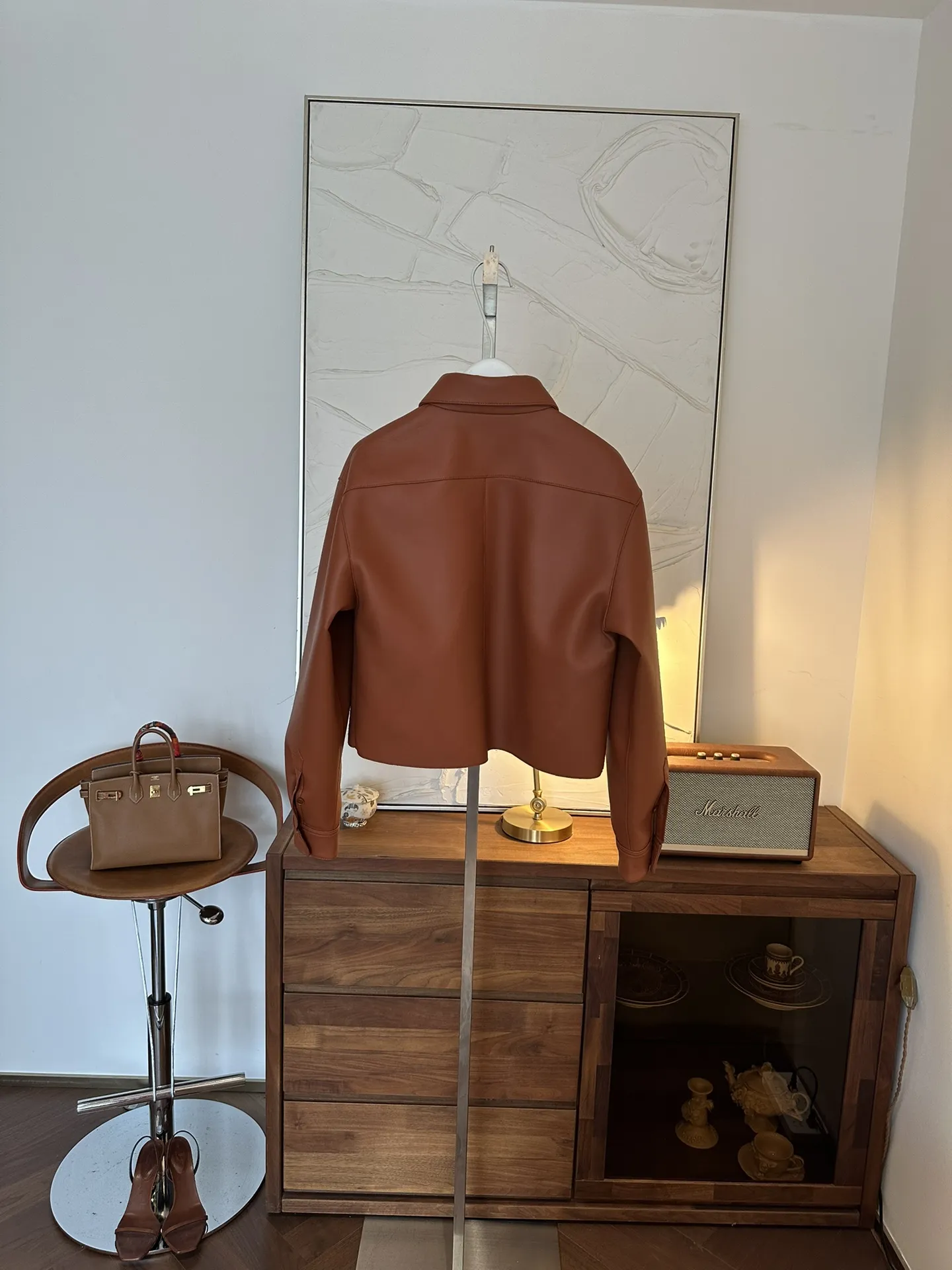Свободный укороченный крой придаёт образу легкость и актуальность, а классический отложной воротник и застёжка на кнопки подчеркивают лаконичность дизайна.