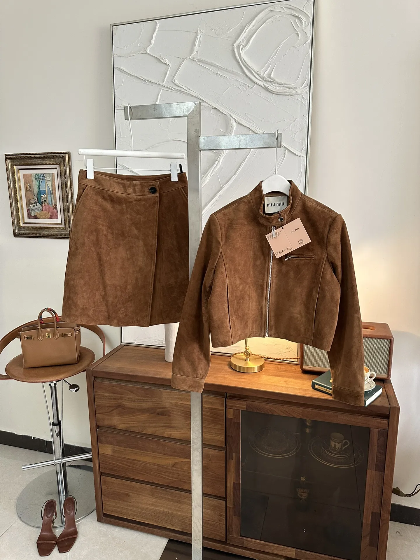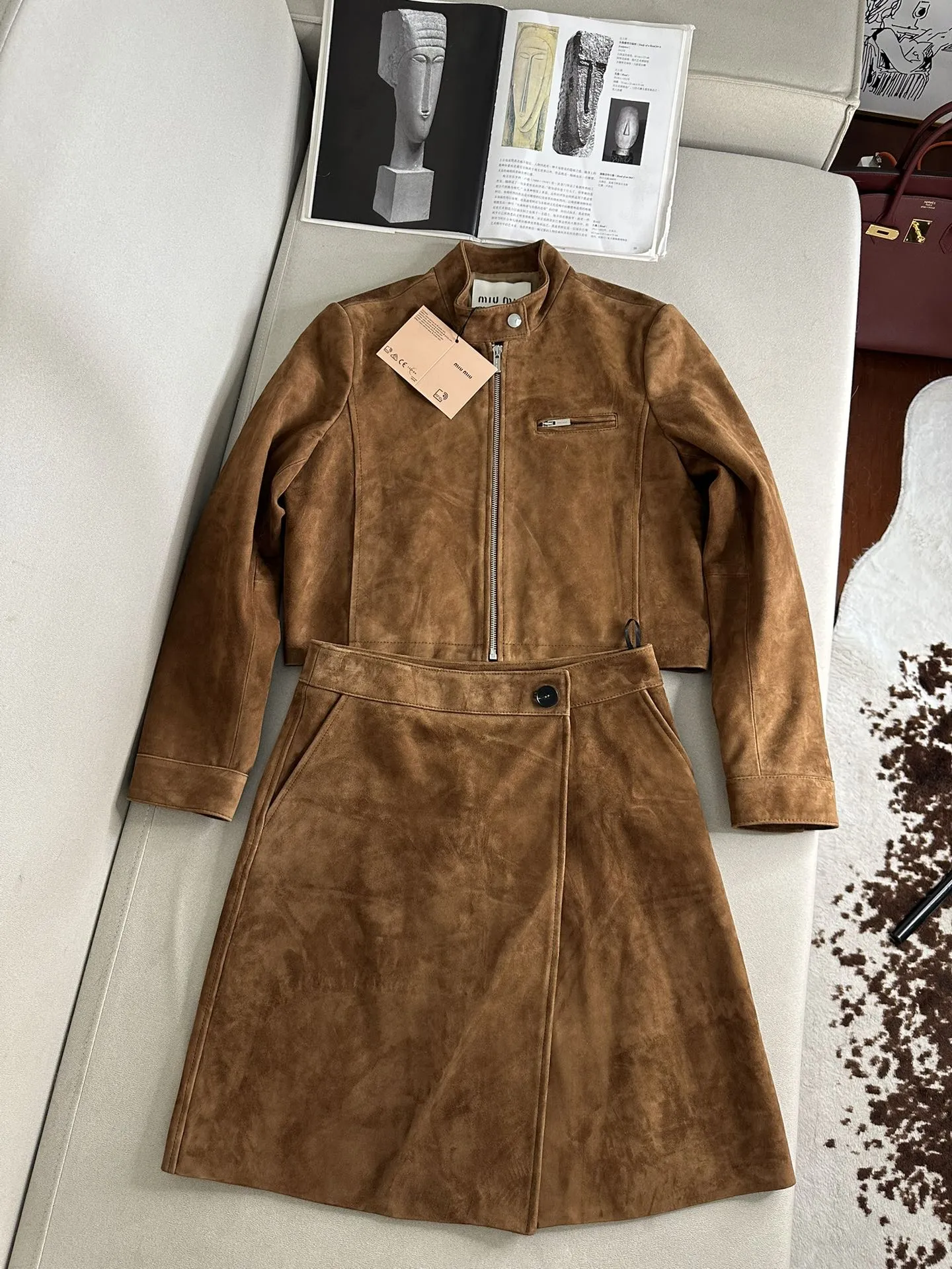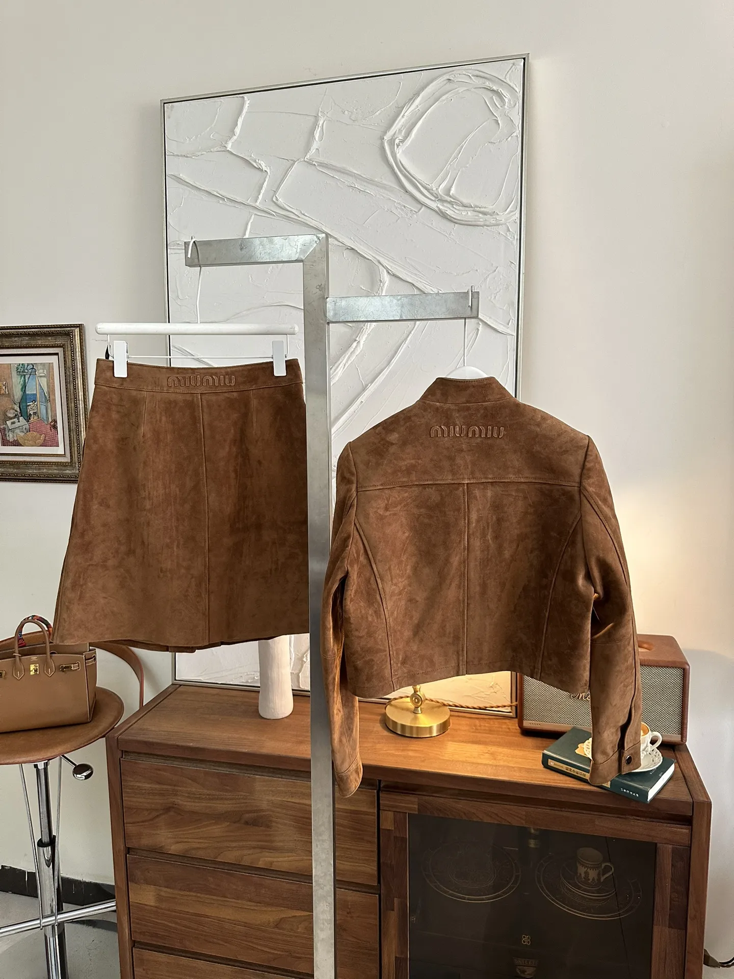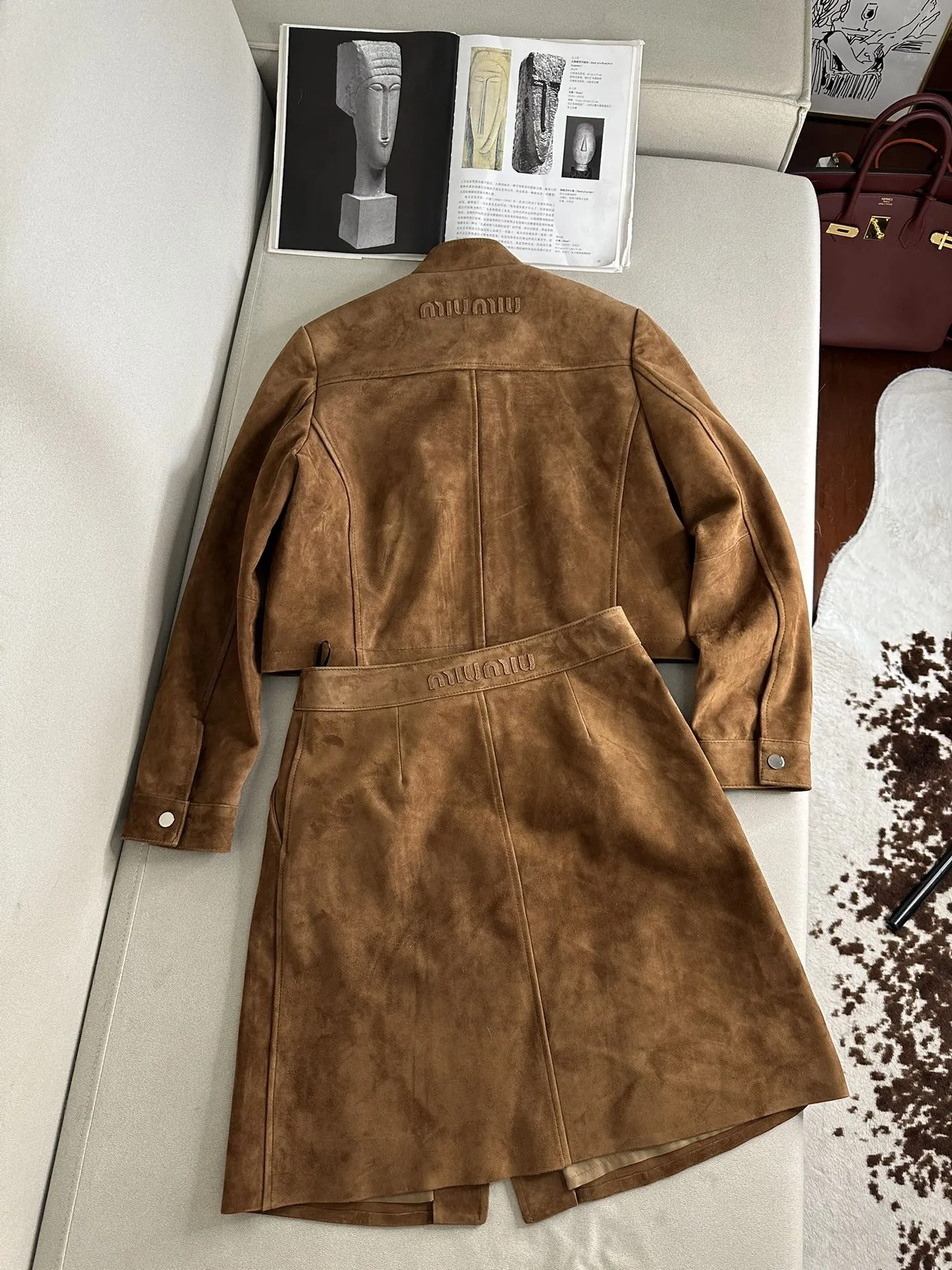 MIU MIU Женский костюм из замши с укороченной курткой и мини-юбкой