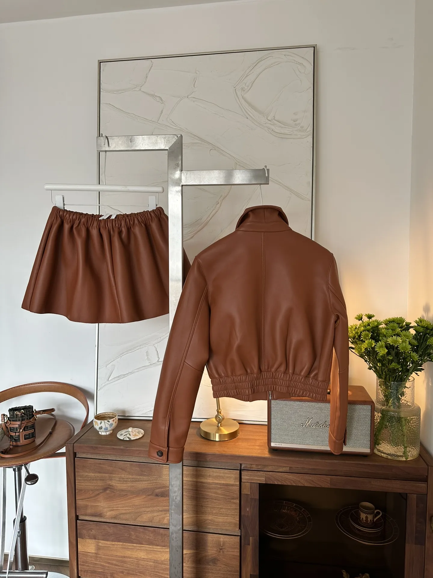 Женский кожаный костюм MIU MIU из новозеландской овчины — это воплощение элегантности и современного стиля. Комплект состоит из укороченной куртки и мини-юбки.