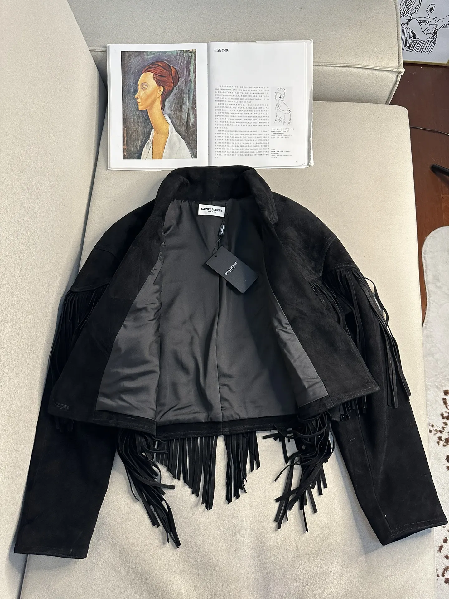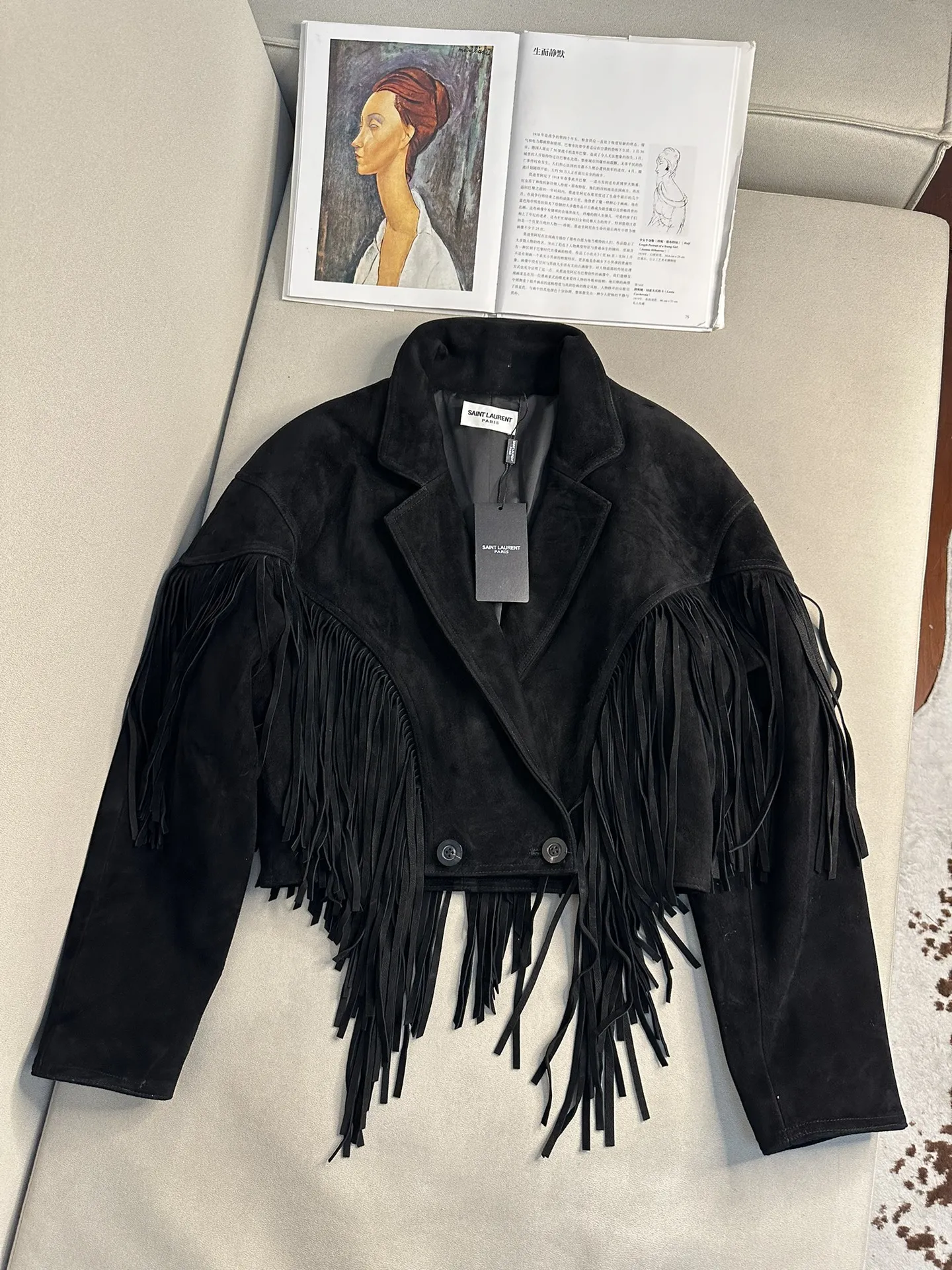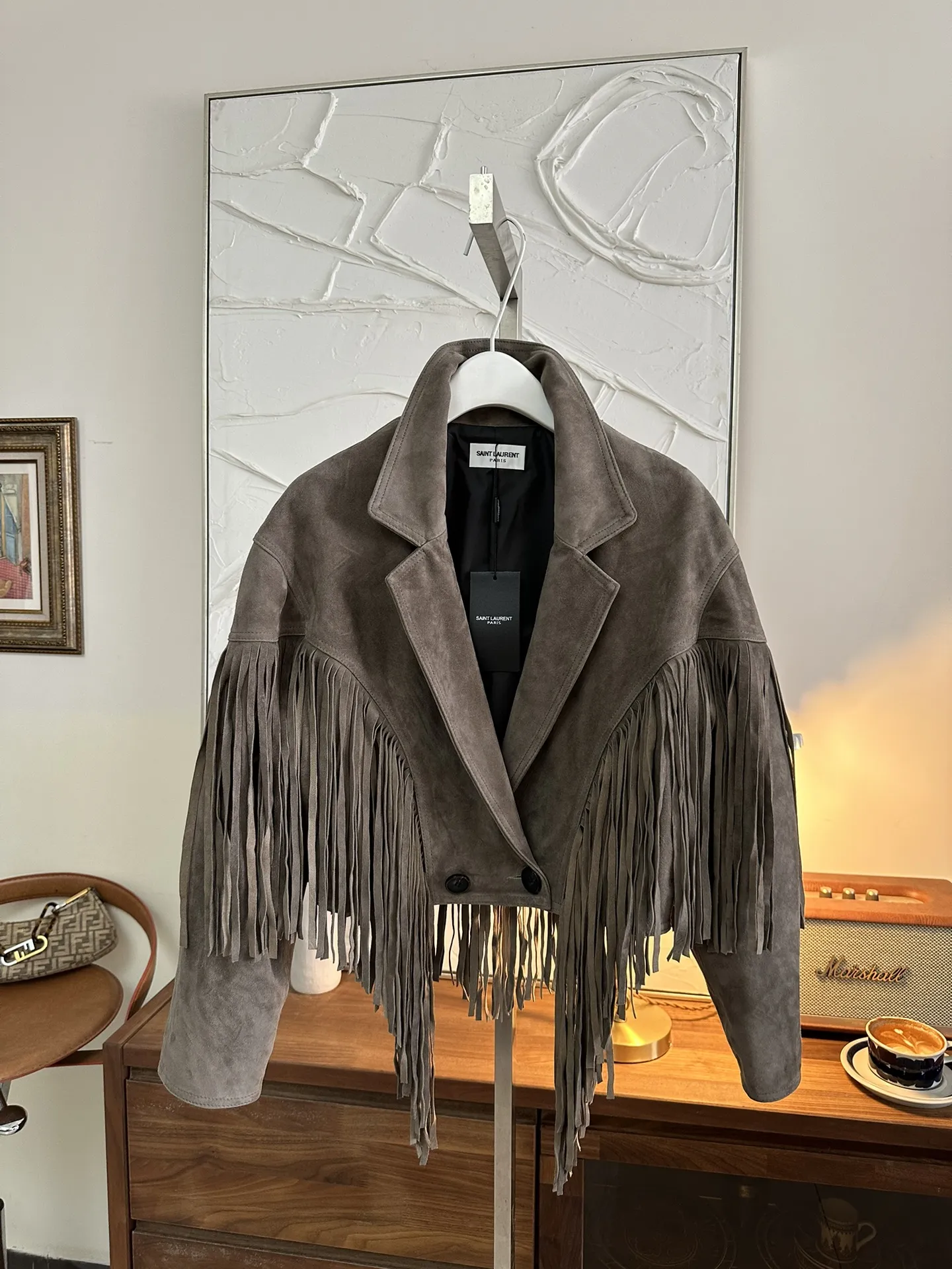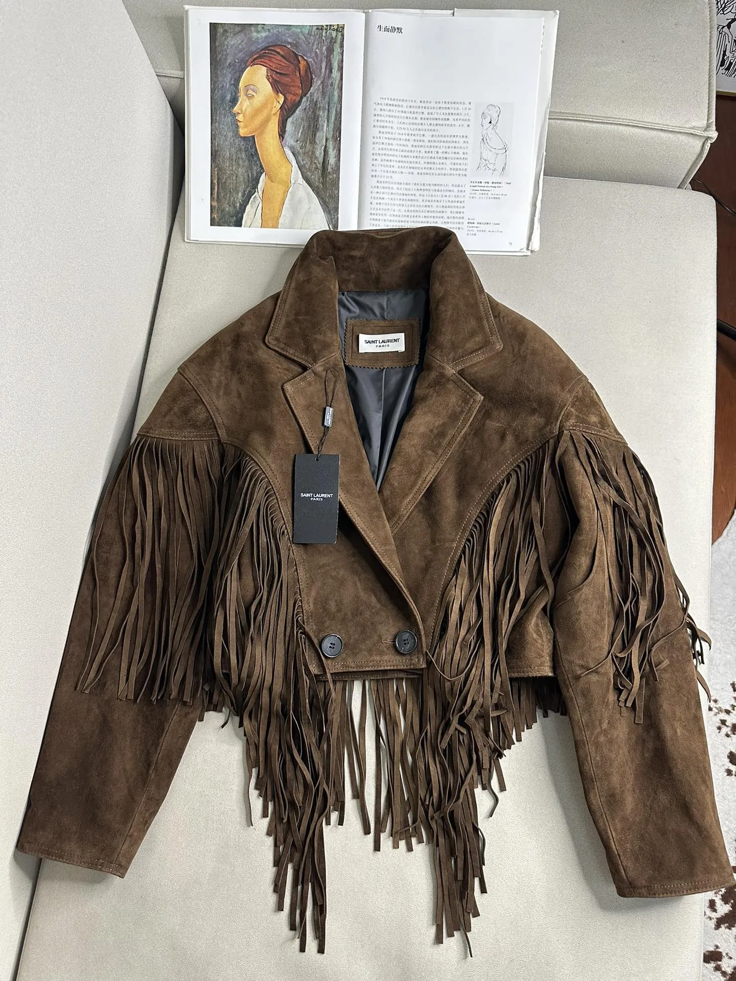 Женская куртка от Yves Saint Laurent (YSL) выполнена из высококачественной козьей замши, что придает ей элегантный вид и тактильные ощущения. Классический дизайн с широкими лацканами и эффектной кожаной бахромой на рукавах добавляет образу нотки бохо и артистичности.