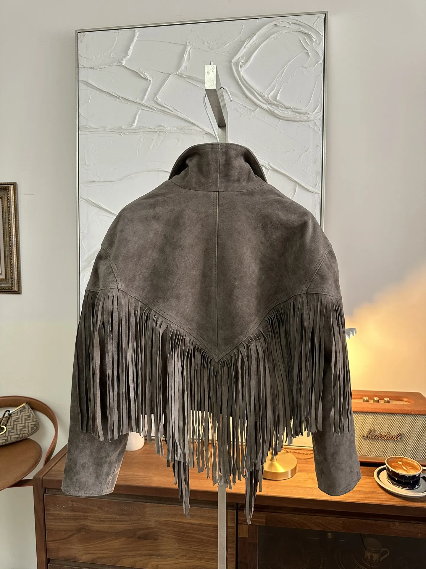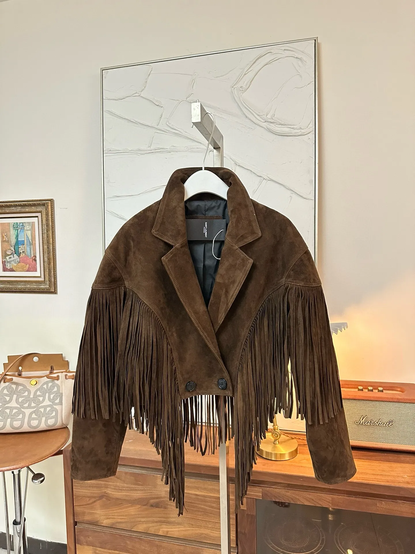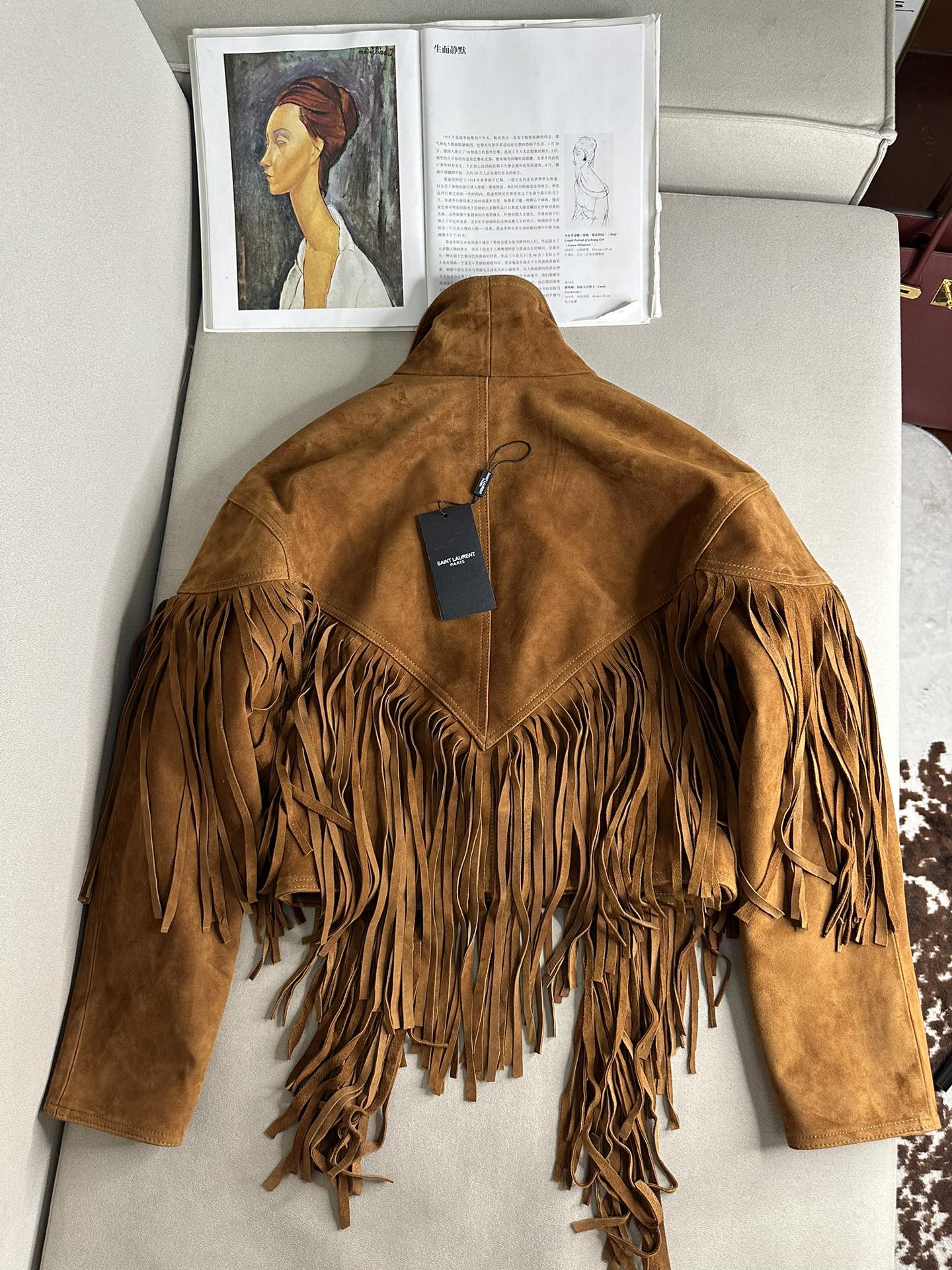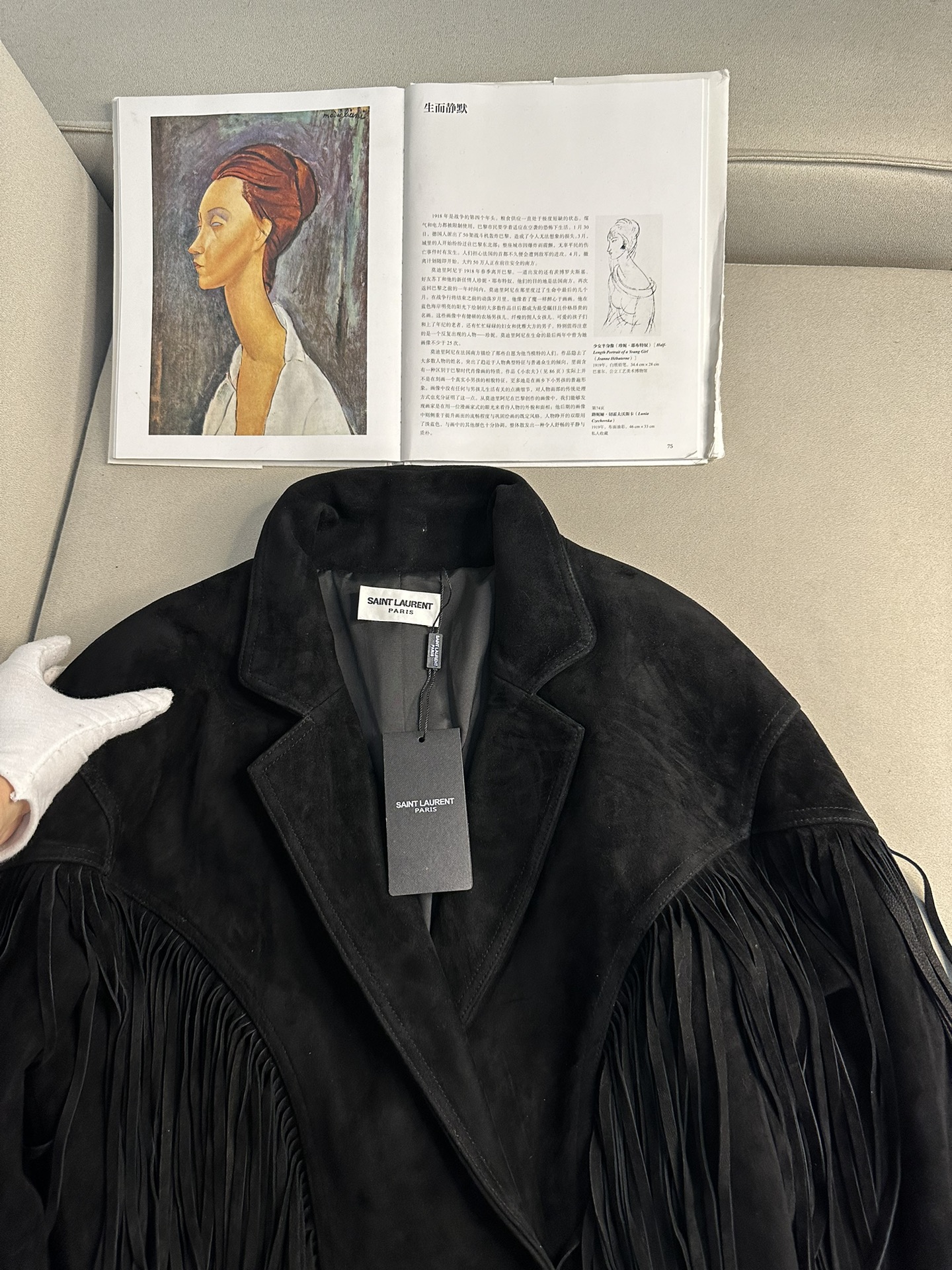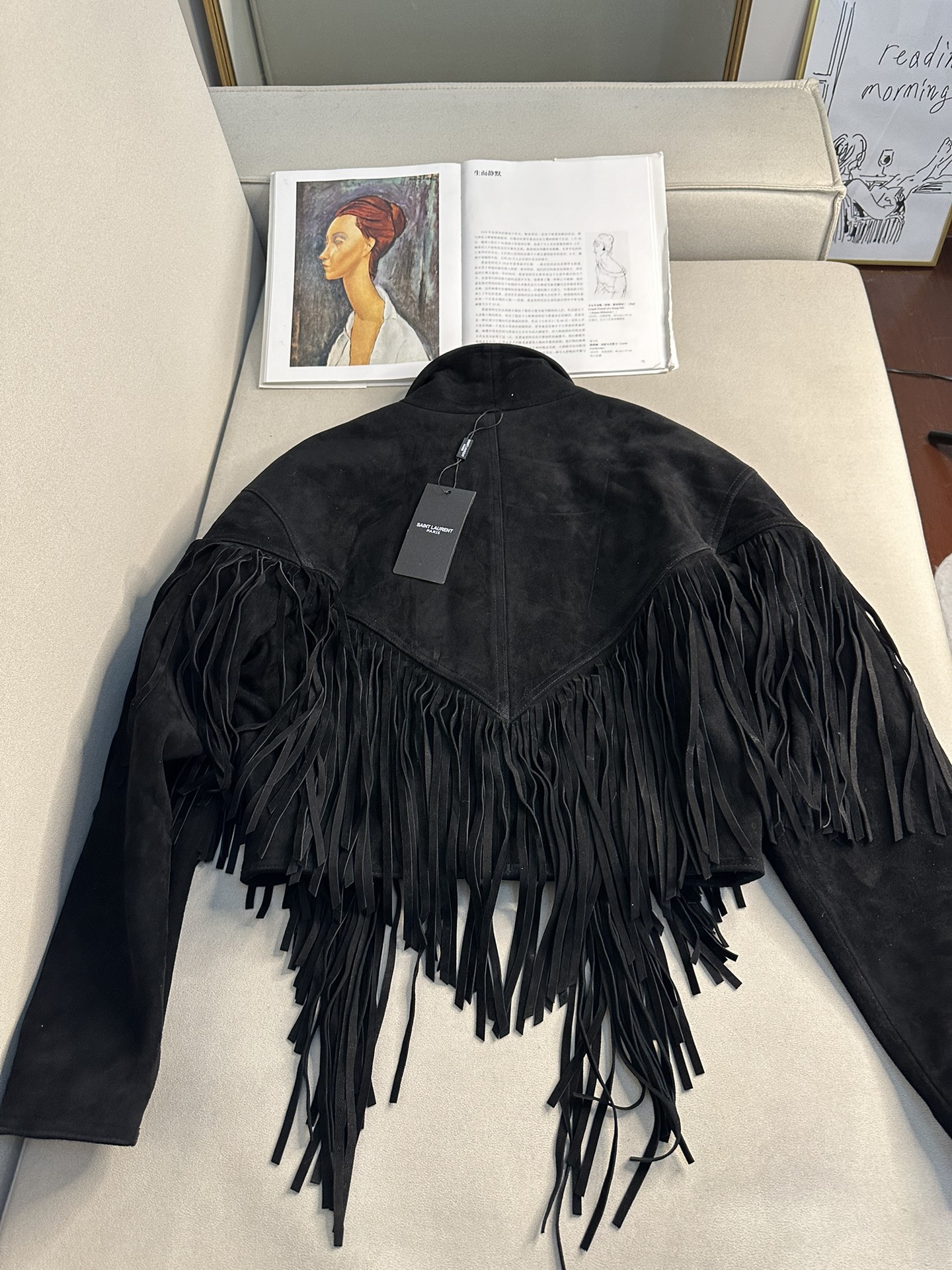 Женская куртка от Yves Saint Laurent (YSL) выполнена из высококачественной козьей замши, что придает ей элегантный вид и тактильные ощущения. Классический дизайн с широкими лацканами и эффектной кожаной бахромой на рукавах добавляет образу нотки бохо и артистичности.