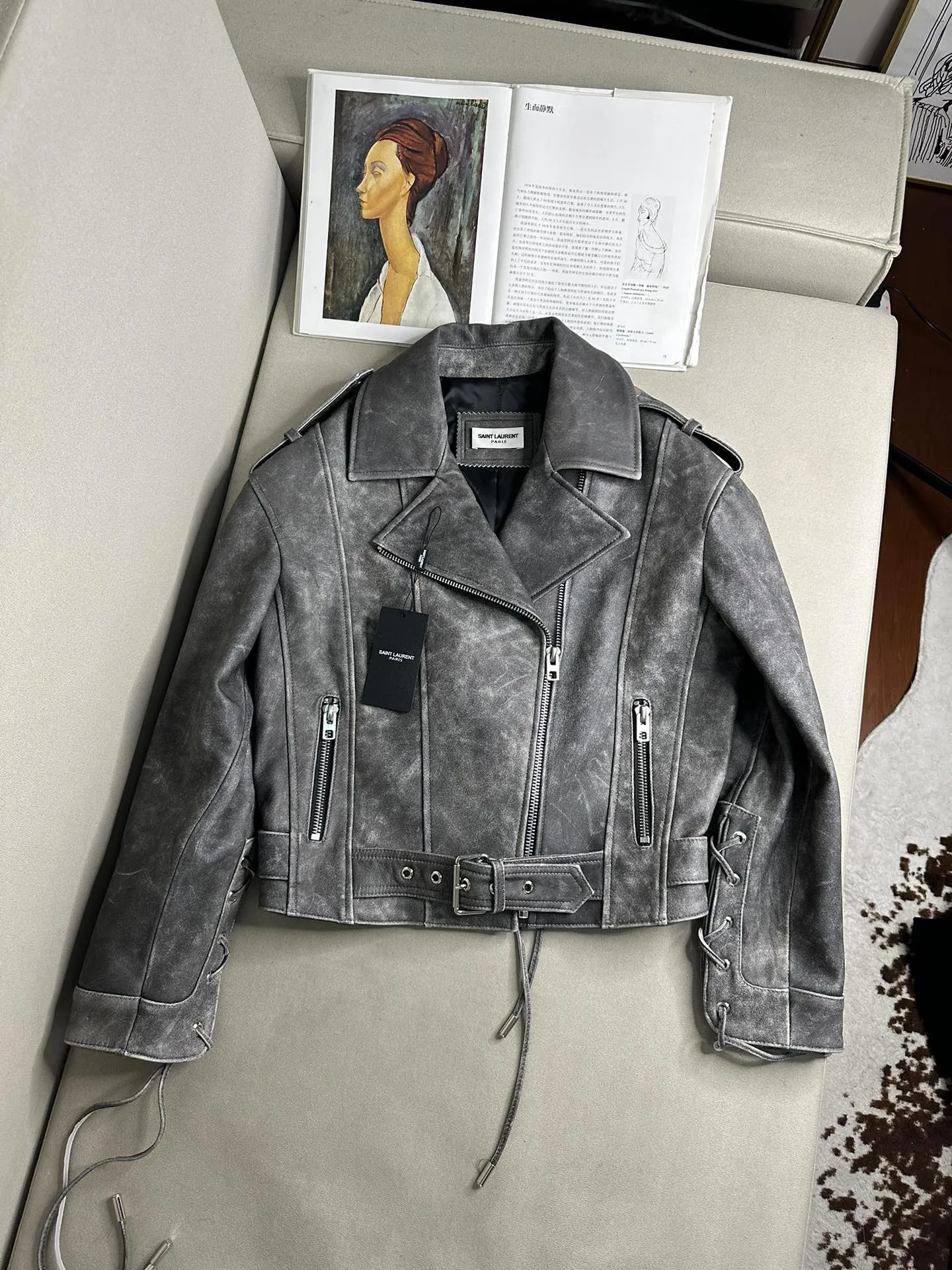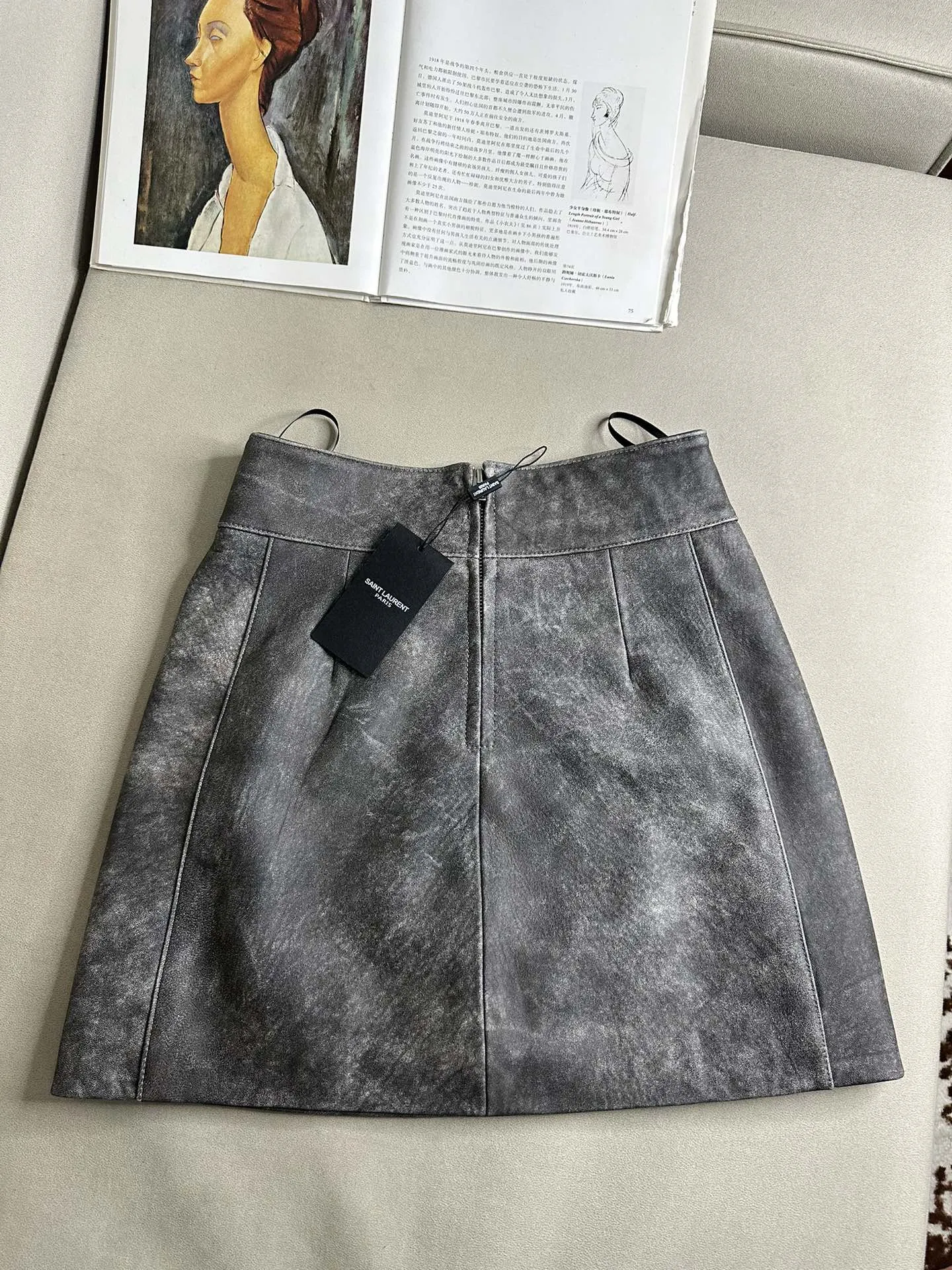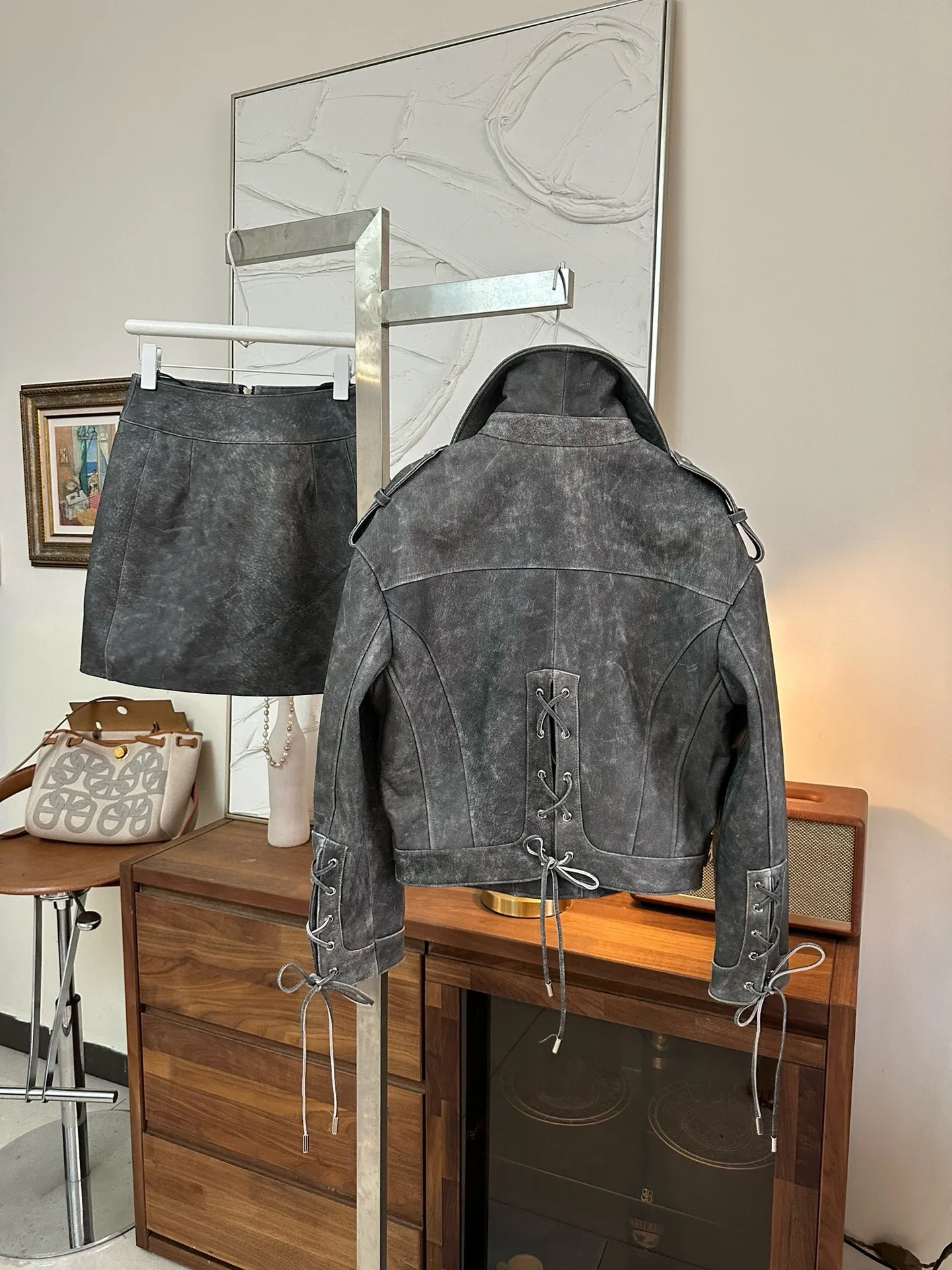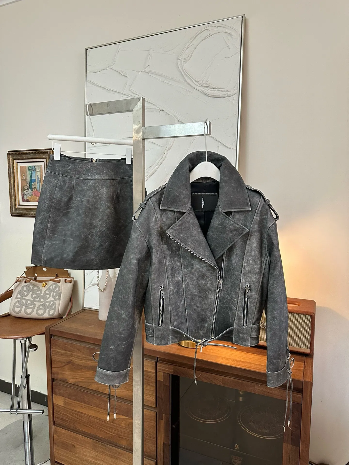 Кожаная куртка с асимметричной застежкой на молнии и характерными металлическими элементами придает образу дерзость и шик. Мини-юбка дополняет куртку, создавая гармоничный и элегантный силуэт.