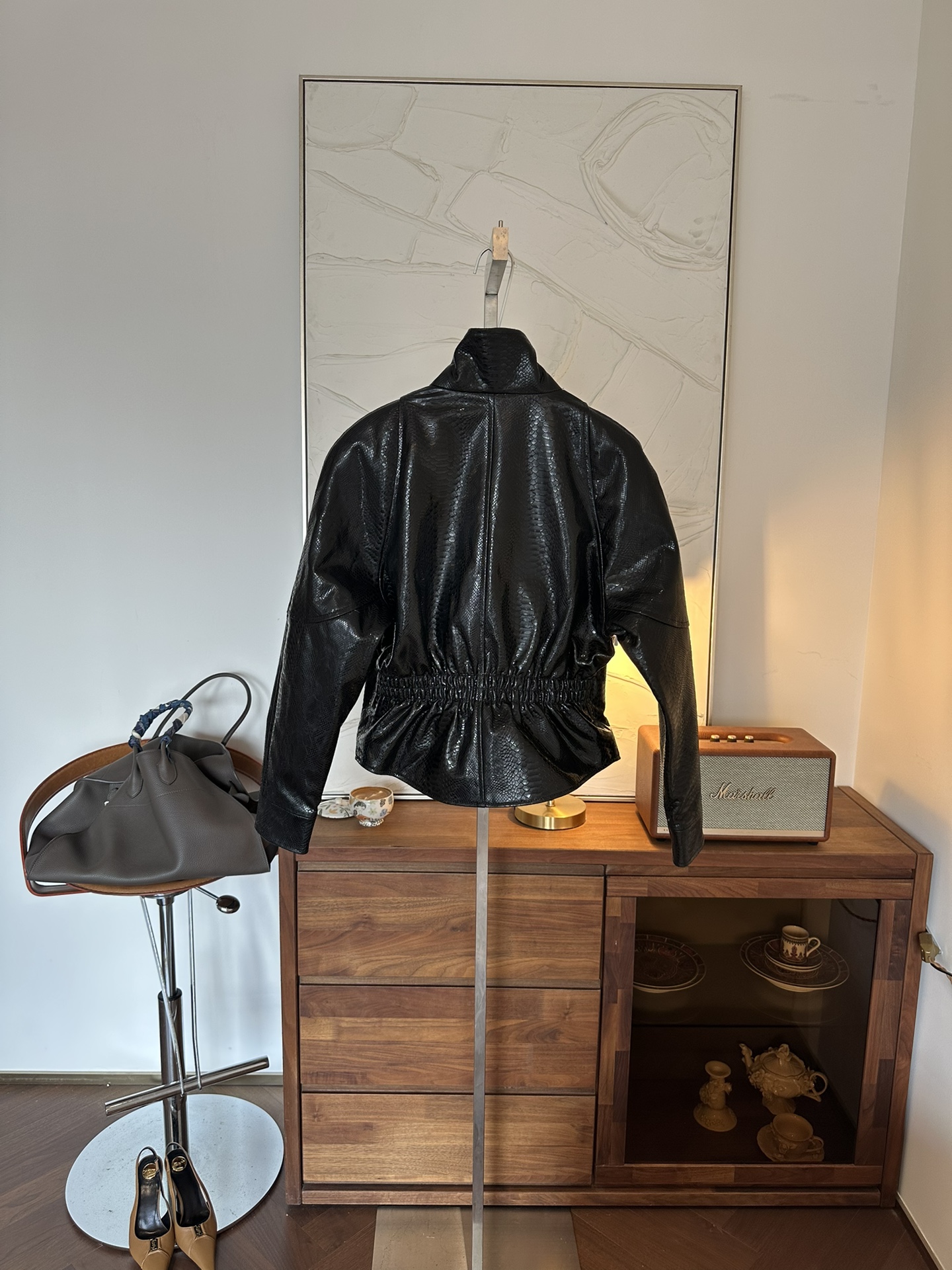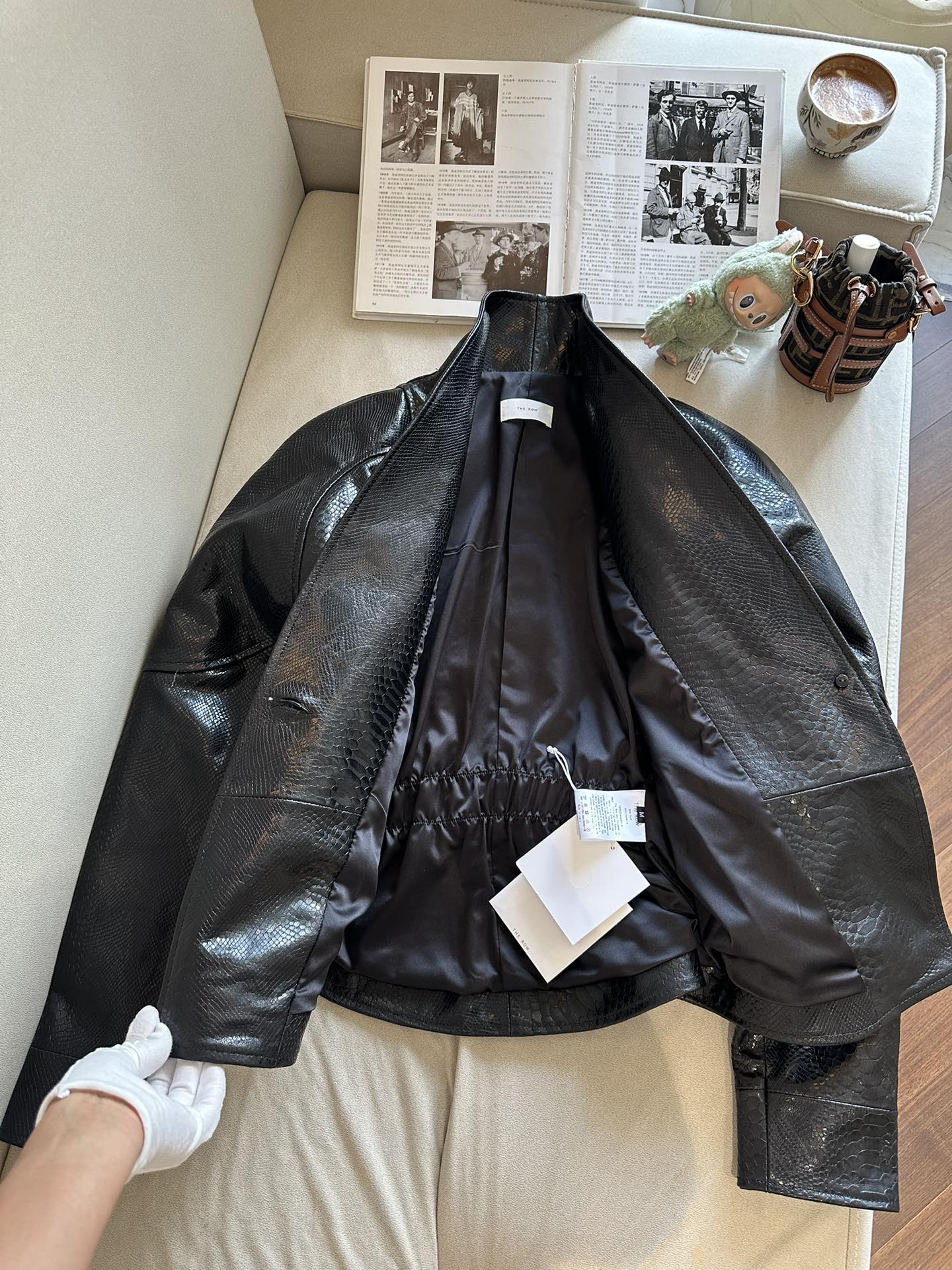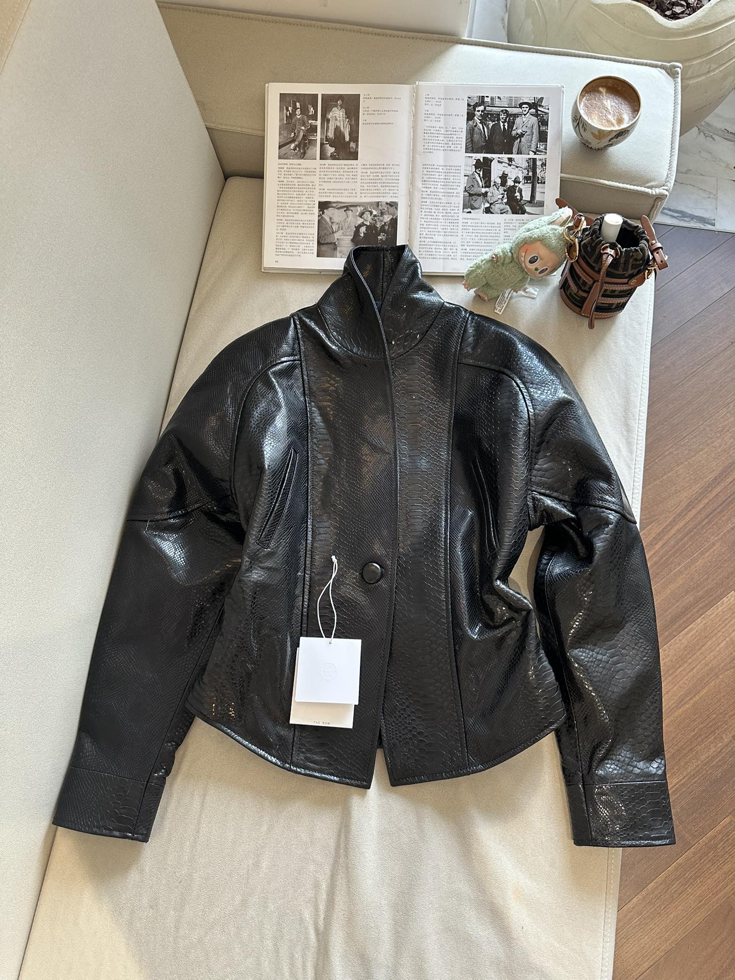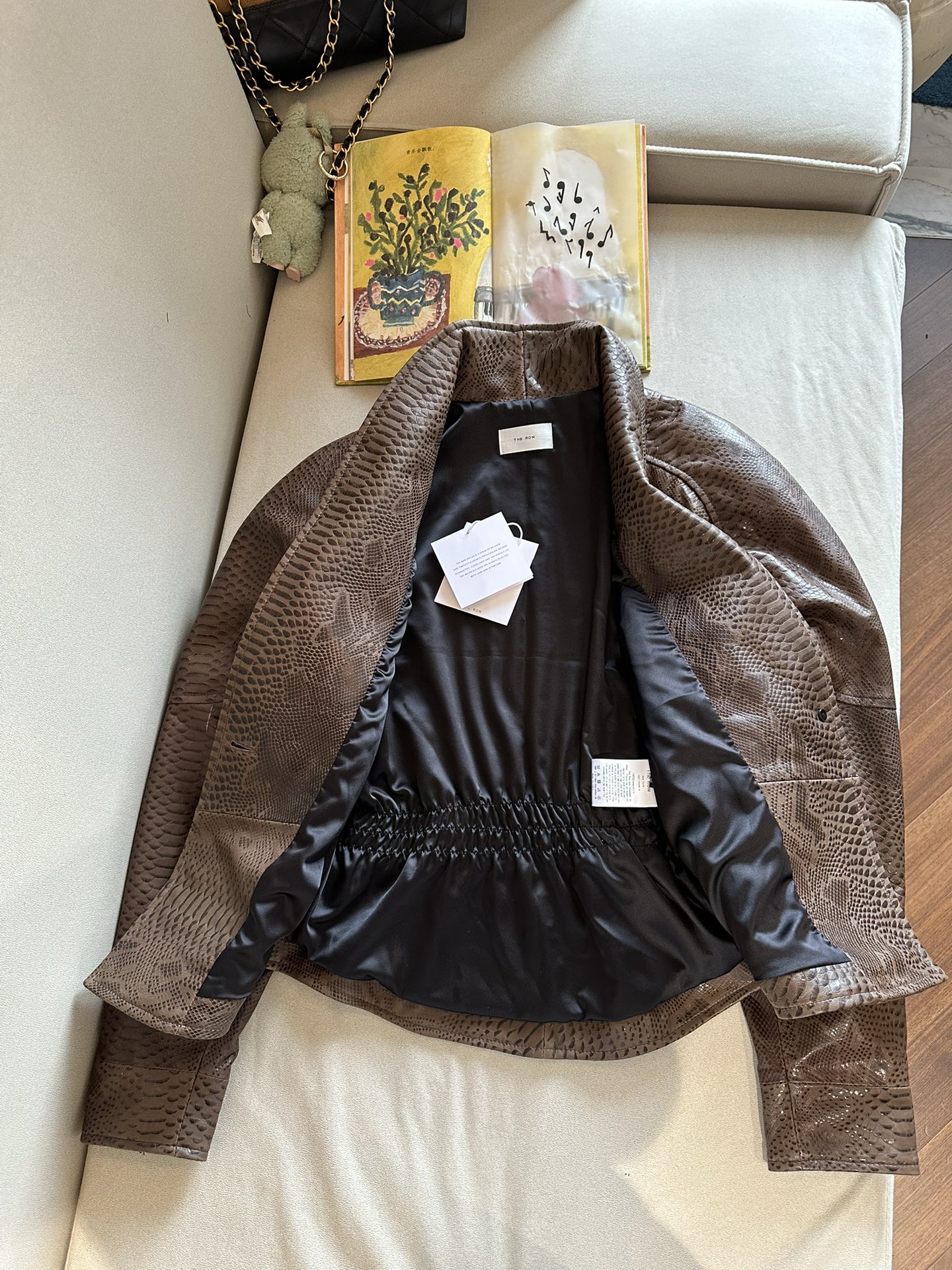 Элегантная женская кожаная куртка от бренда The Row — воплощение утончённого стиля и современного дизайна. Изготовленная из высококачественной овчины, она отличается уникальной текстурой с имитацией кожи питона, что придаёт изделию роскошный и экзотический вид.