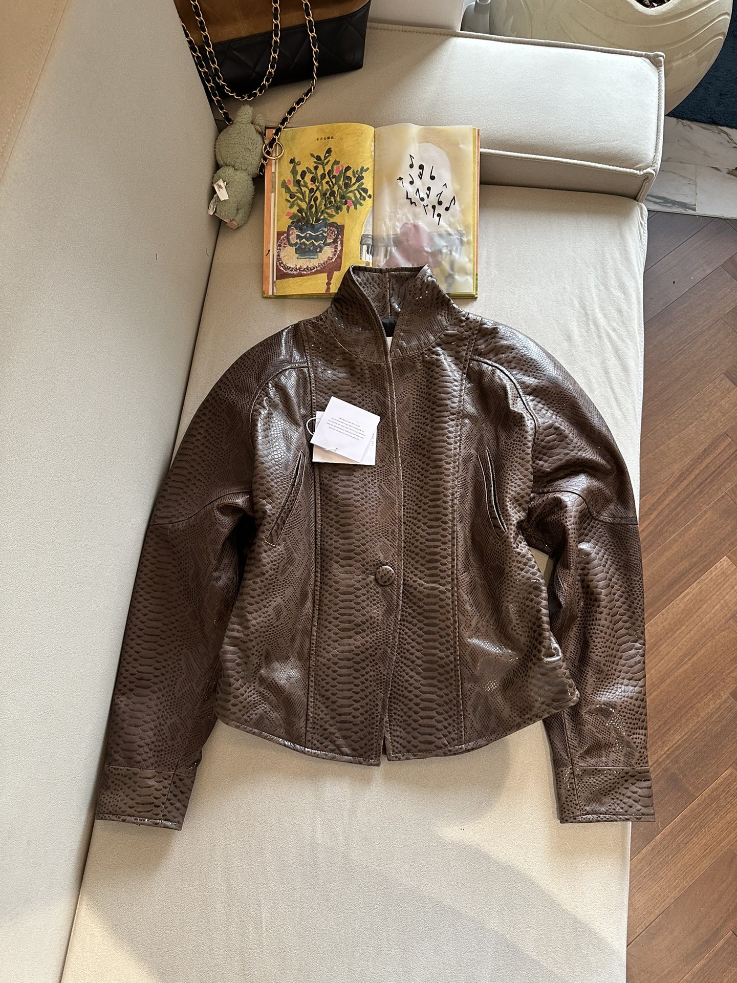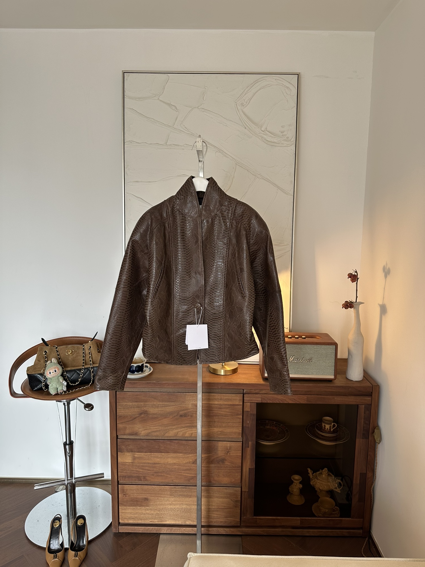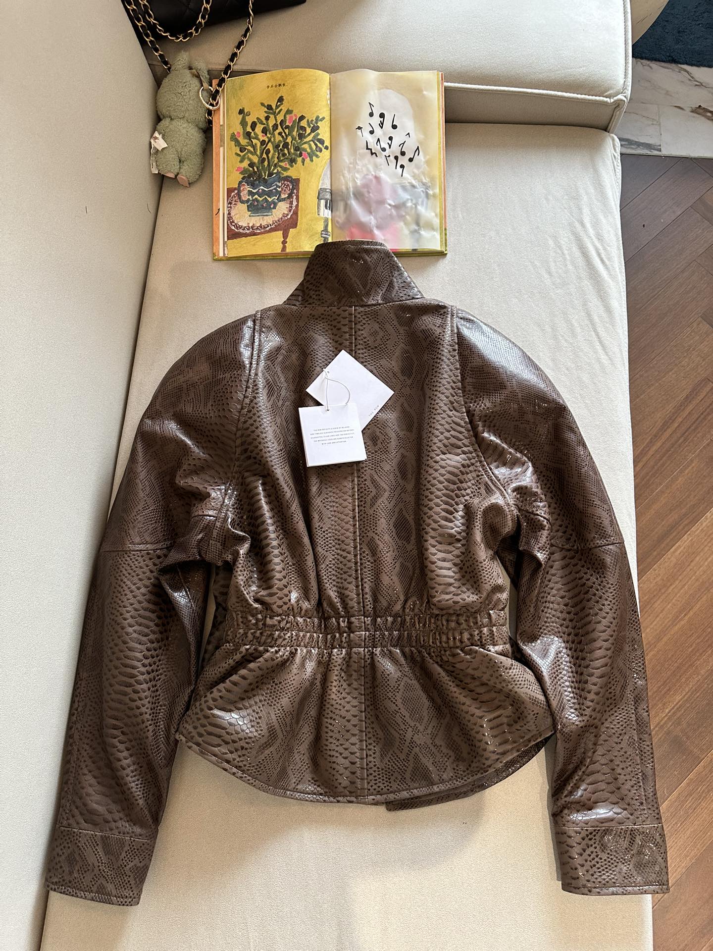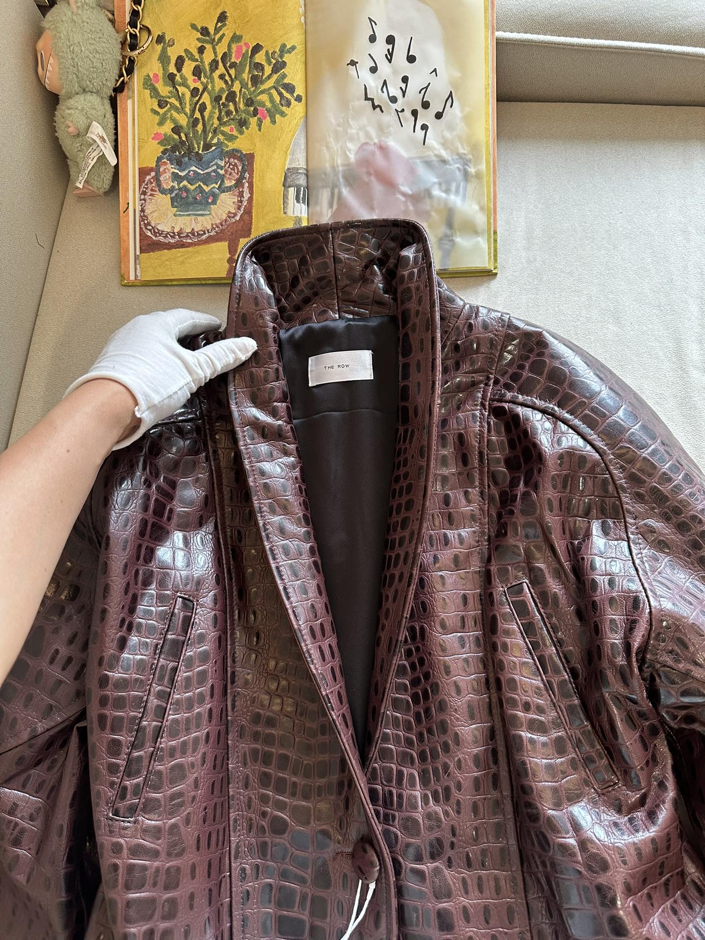 Элегантная женская кожаная куртка от бренда The Row — воплощение утончённого стиля и современного дизайна. Изготовленная из высококачественной овчины, она отличается уникальной текстурой с имитацией кожи питона, что придаёт изделию роскошный и экзотический вид.